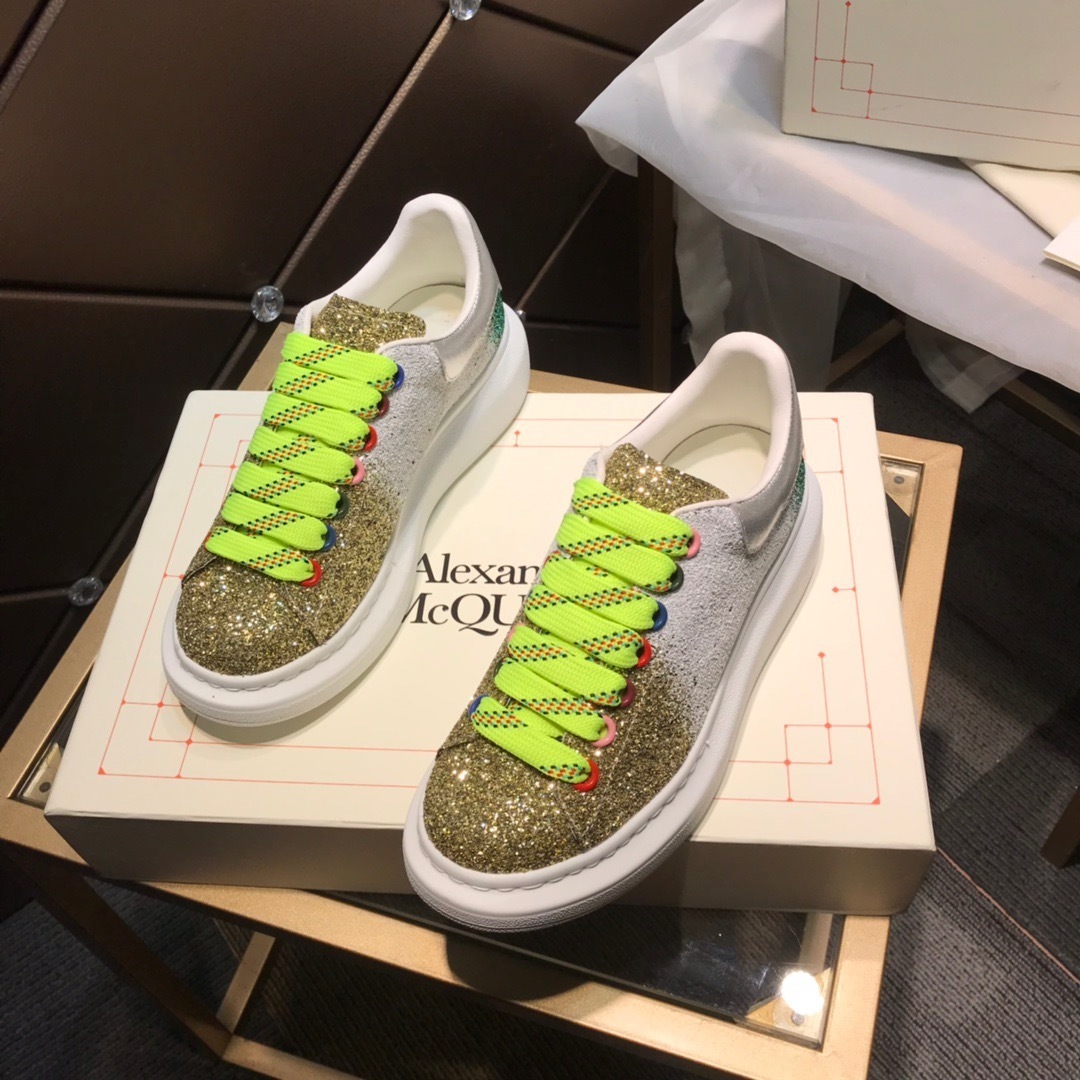 Stylish Alexander McQueen sneakers featuring a glittery design and vibrant laces.