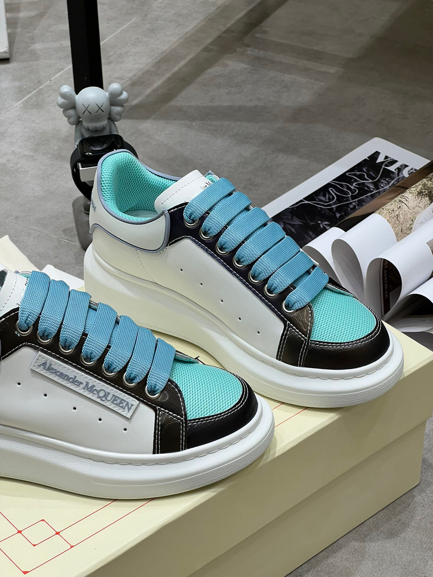 Elevate your style with these Alexander McQueen unisex sneakers featuring a striking white and aqua design.