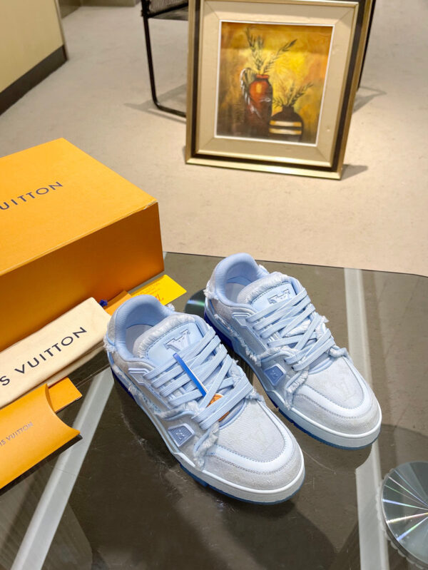 Elevate your style with these Louis Vuitton high-end couple sneakers in light blue.