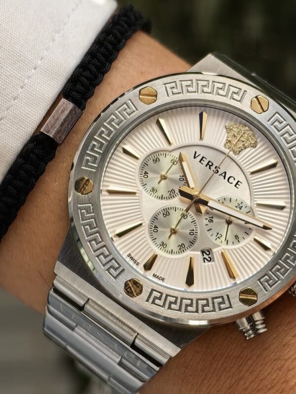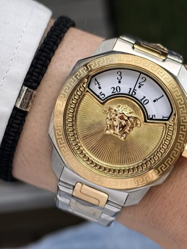 Elevate your style with the Versace Two Tone Gold White Watch, featuring a striking 44MM design.