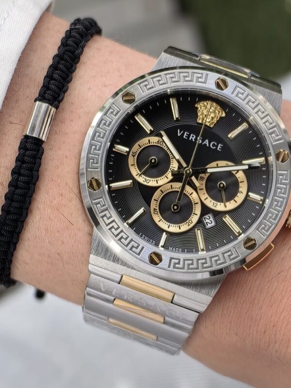 Stylish Versace watch featuring a two-tone design with a black dial and gold details.