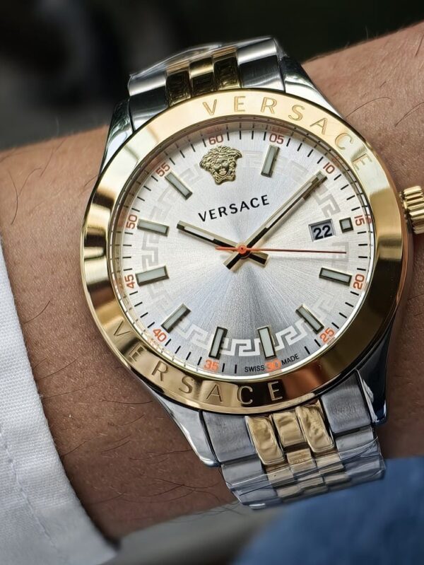 Elevate your style with the Versace Two Tone White Dial Watch featuring a 42.7 mm case and Swiss quartz movement.