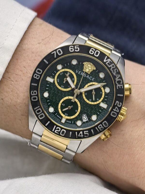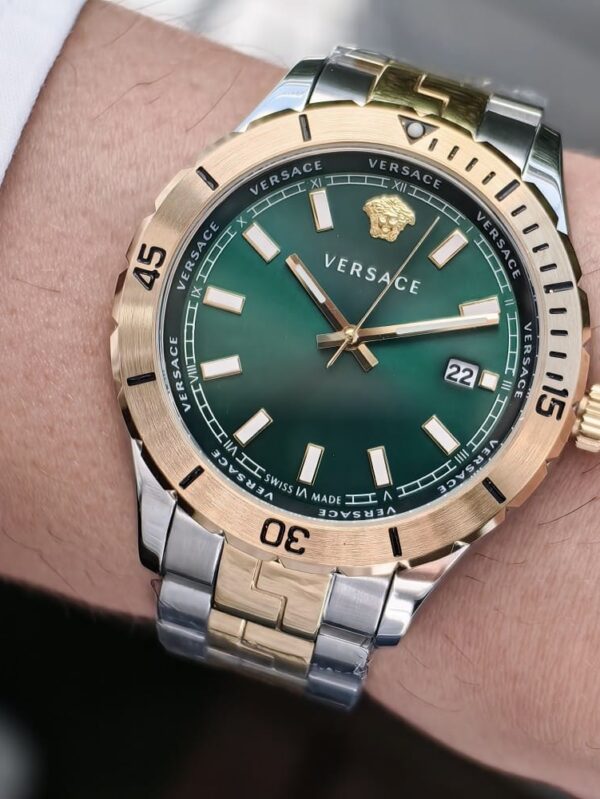 Stylish VERSACE watch featuring a two-tone design and green dial.