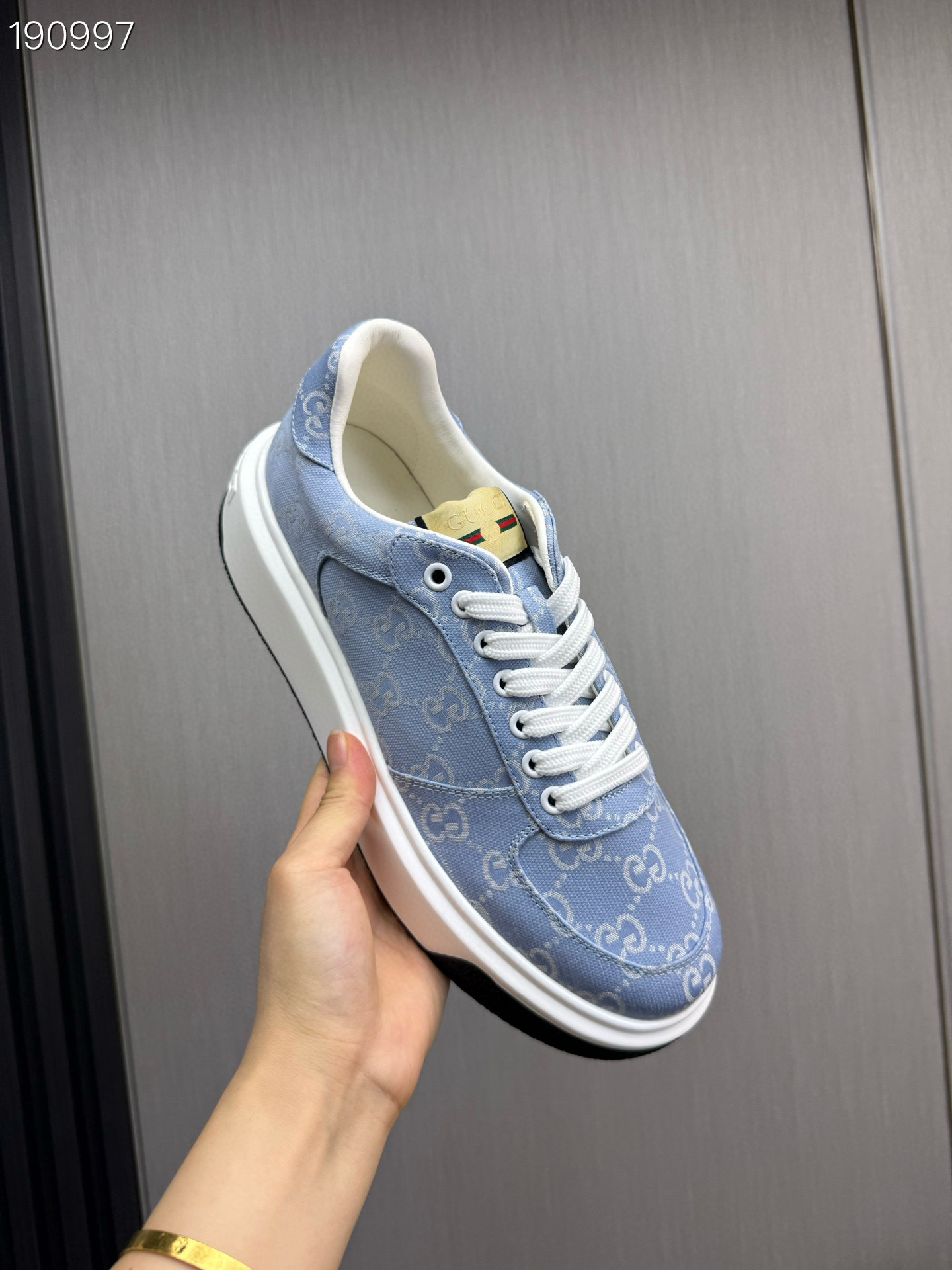 Step out in style with the Gucci G Casual Shoes YS410. These fashionable shoes feature a light blue canvas upper adorned with the iconic Gucci logo, making them a perfect addition to any wardrobe.