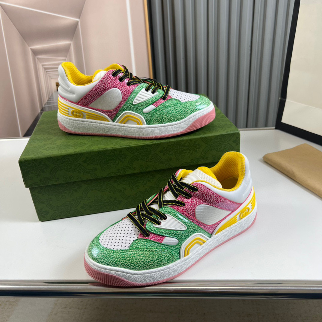 Step into luxury with the Gucci G Couples Sneakers, designed for both comfort and style. These vibrant sneakers feature a unique color combination of green, pink, and yellow, making them a standout addition to any wardrobe.
