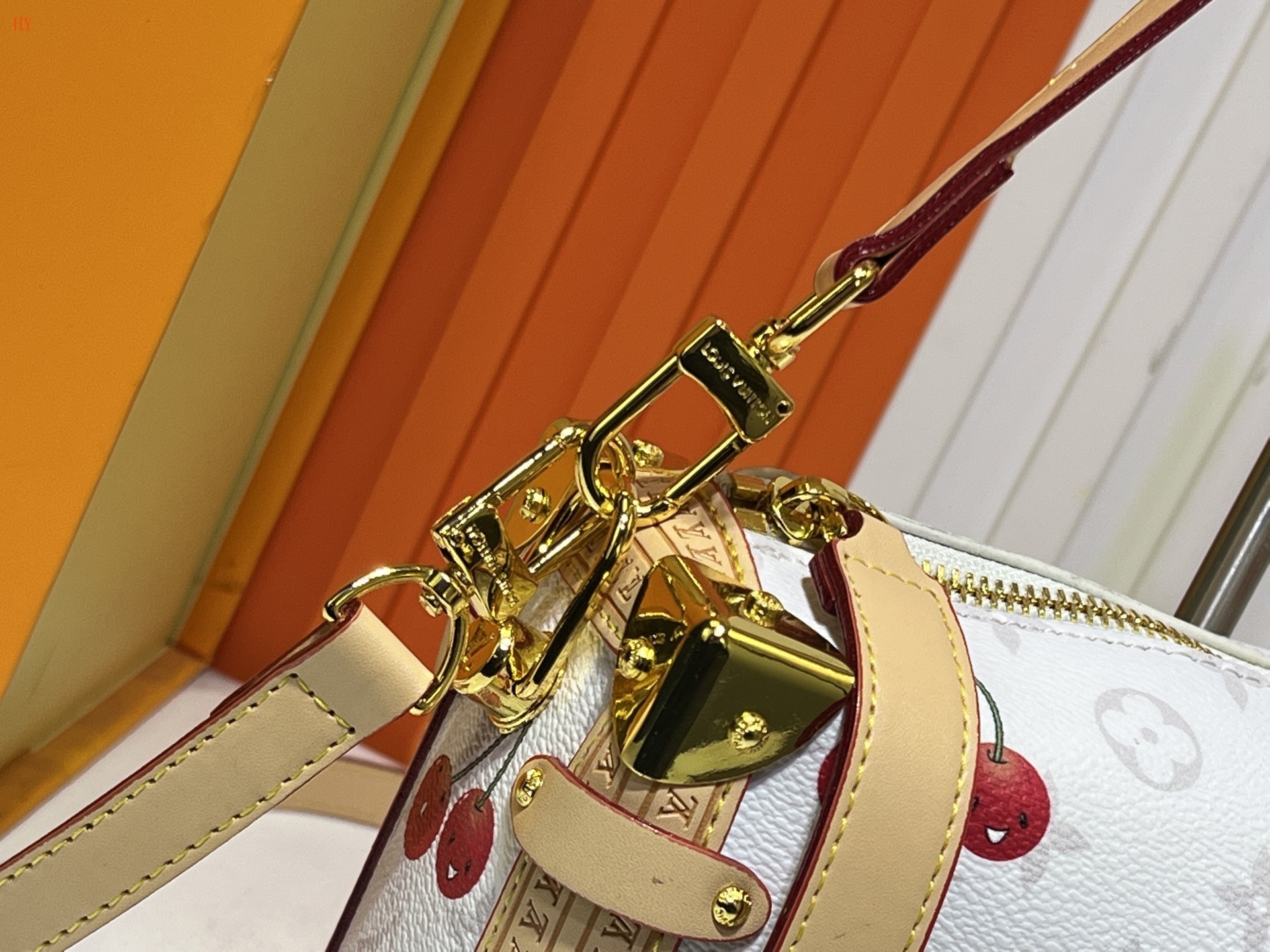 Elevate your accessory game with this stunning Louis Vuitton bag, showcasing a playful cherry print on a white background. The bag measures 21 cm x 14 cm x 6 cm, making it a perfect size for everyday use.