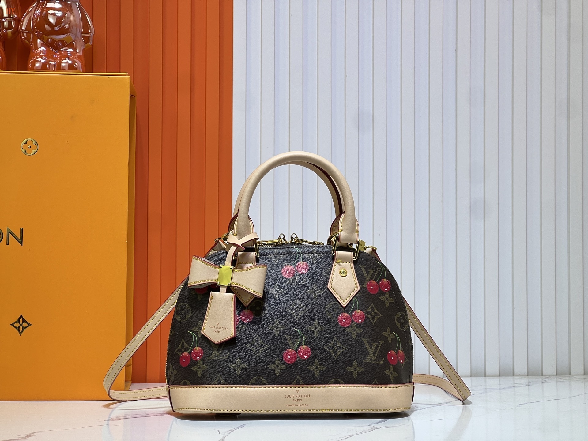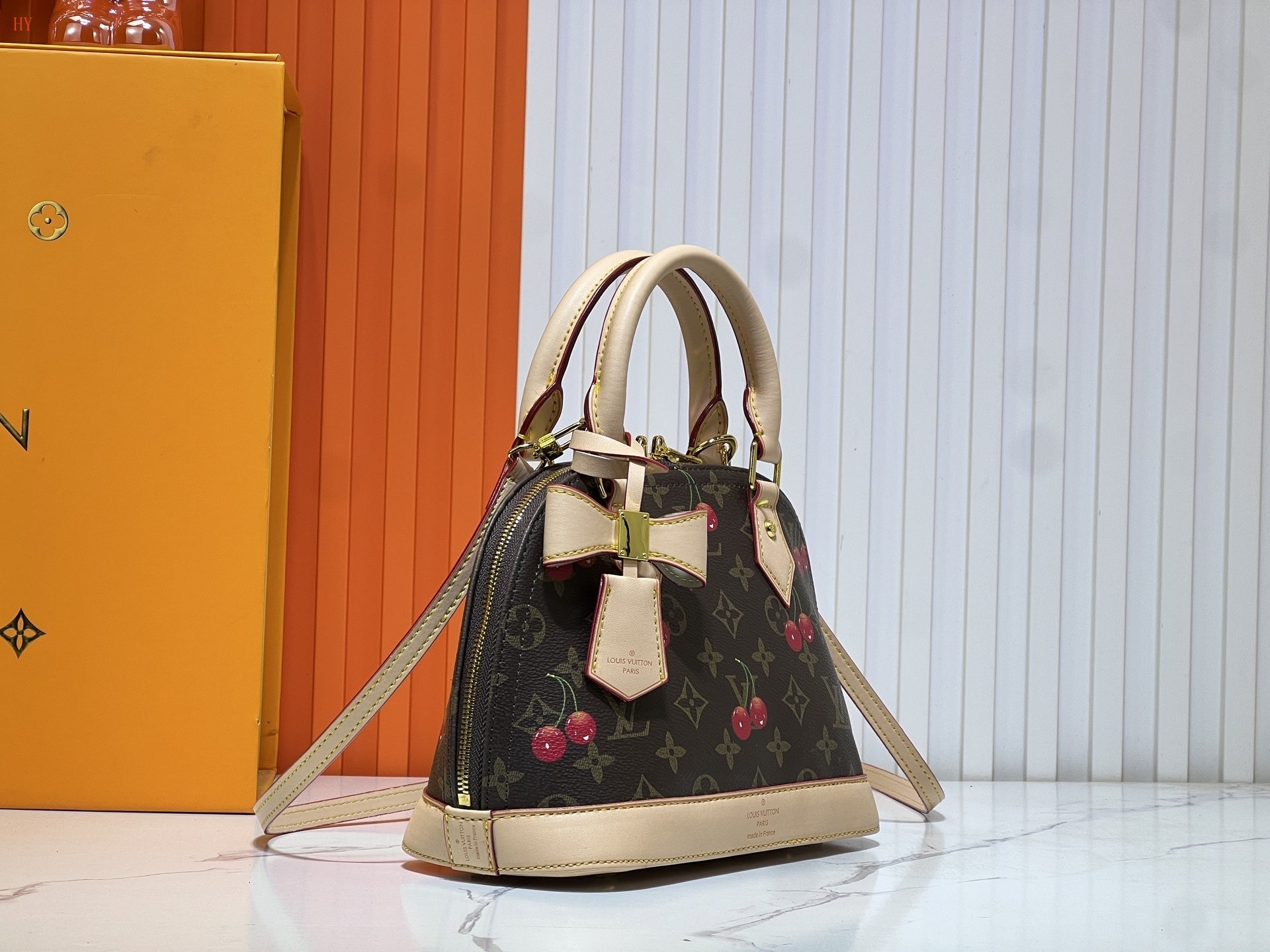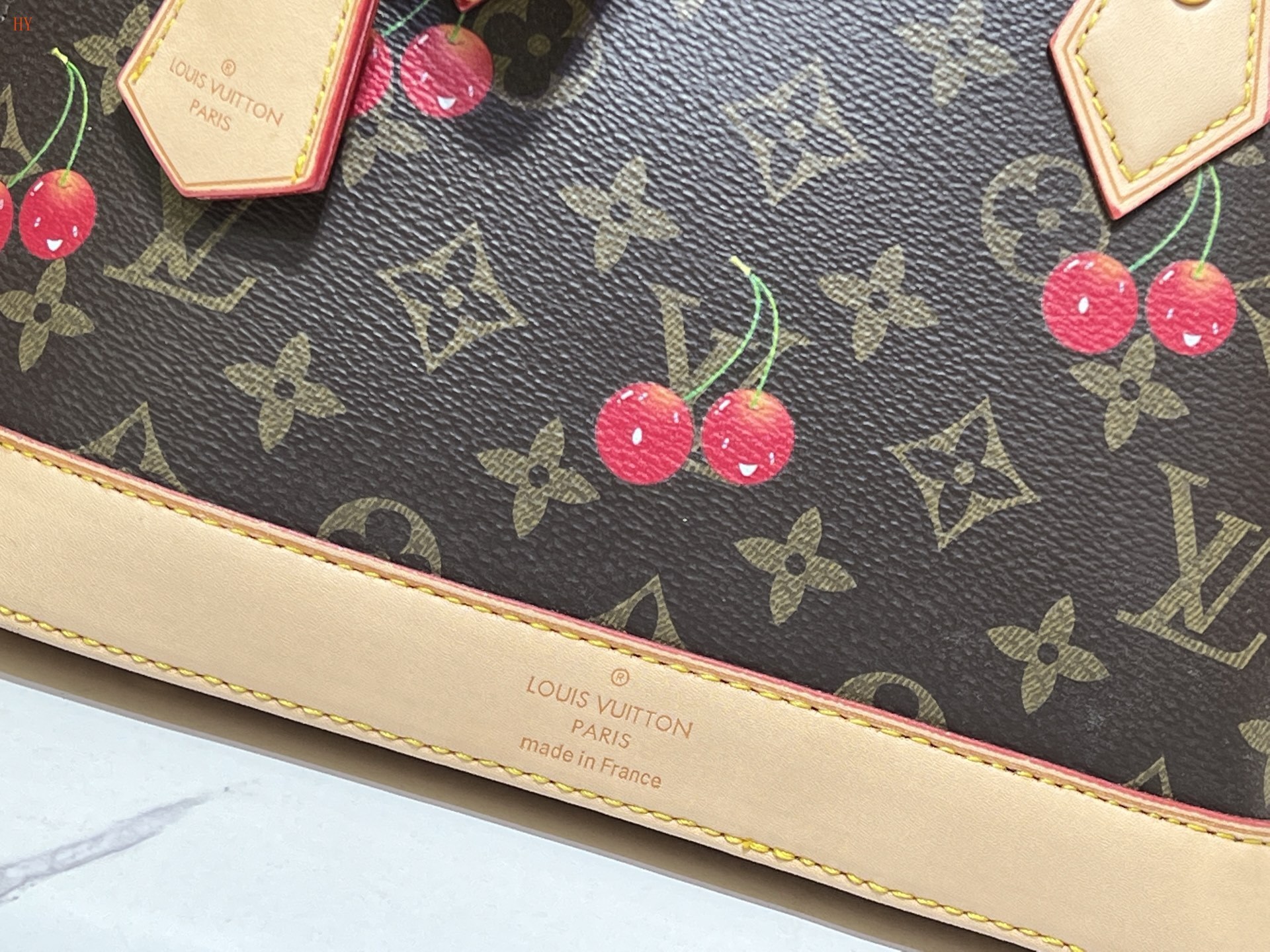 The handbag showcases a unique cherry print against the classic LV monogram, complemented by elegant leather accents. It includes a detachable shoulder strap for versatile carrying options.
