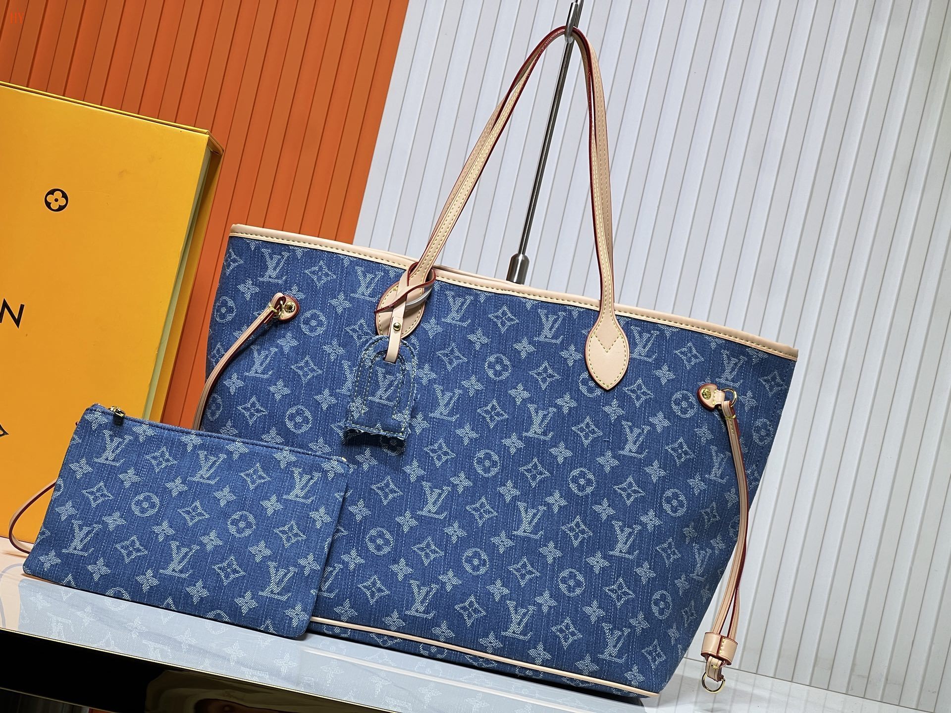 The bag is crafted from high-quality denim, adorned with the iconic Louis Vuitton monogram. It includes a matching pouch for added convenience, making it easy to organize your essentials. The sturdy leather handles ensure comfort while carrying.
