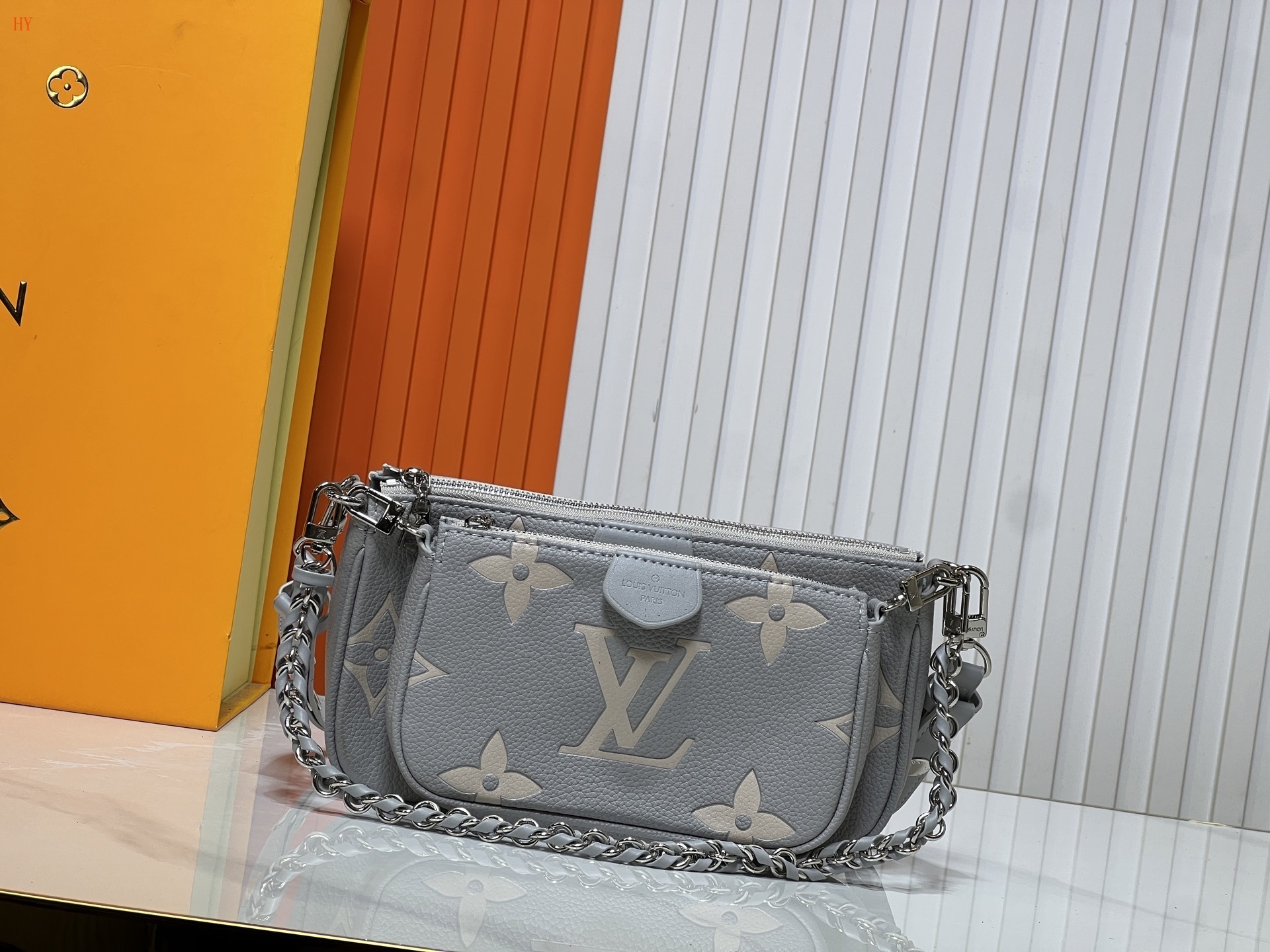 Elevate your accessory game with the Louis Vuitton Gray Monogram Chain Bag. Measuring 23.5 cm x 14.3 cm x 4.5 cm, this bag features a chic design adorned with the iconic LV monogram. The soft gray leather is complemented by a stylish chain strap, making it both fashionable and functional.