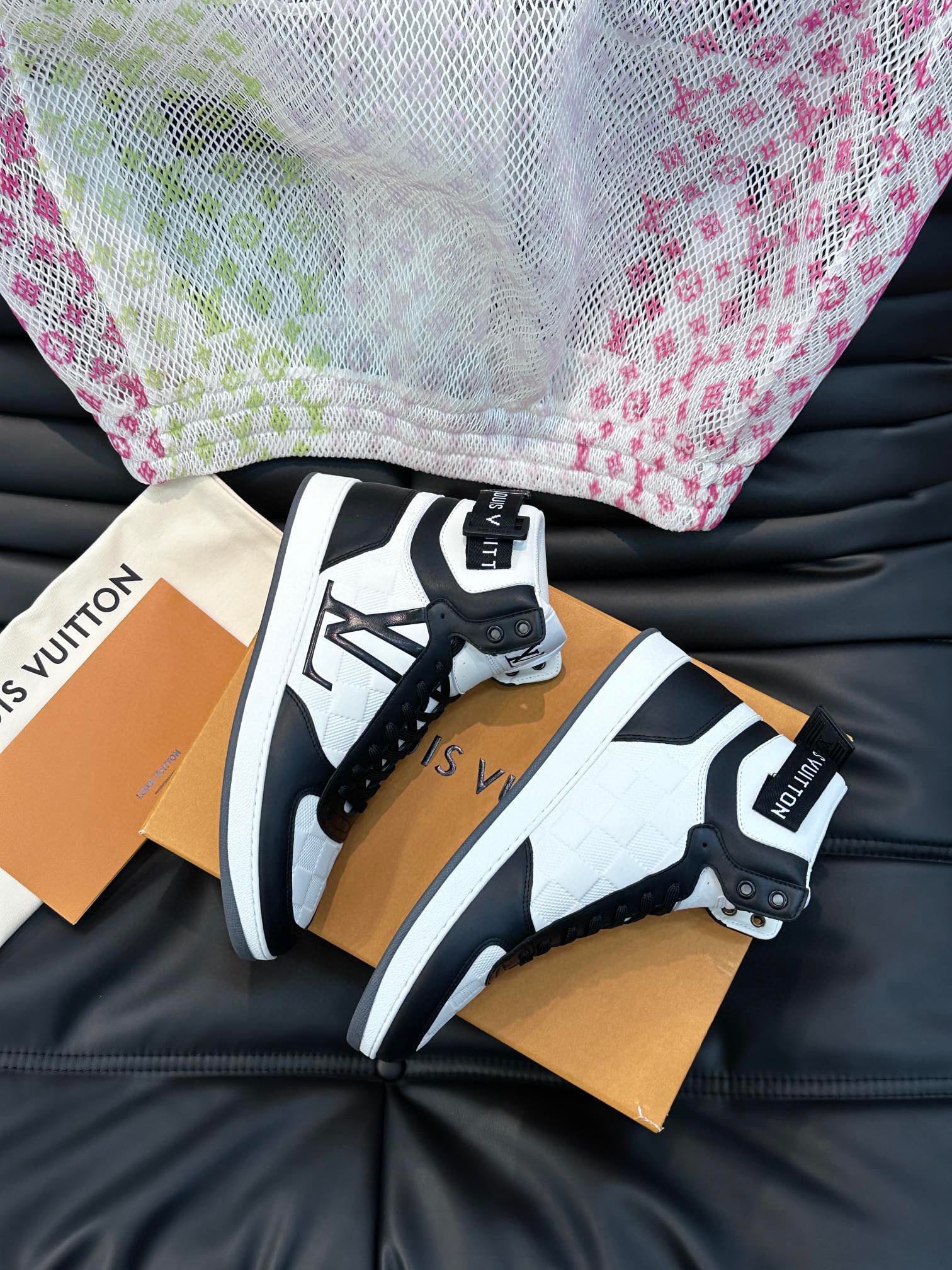 Step into luxury with the Louis Vuitton High-Top Sneakers, designed for both comfort and style. These sneakers feature a striking black and white color scheme, showcasing the iconic LV logo for a bold statement.