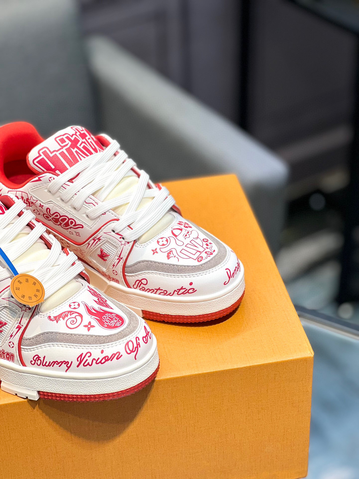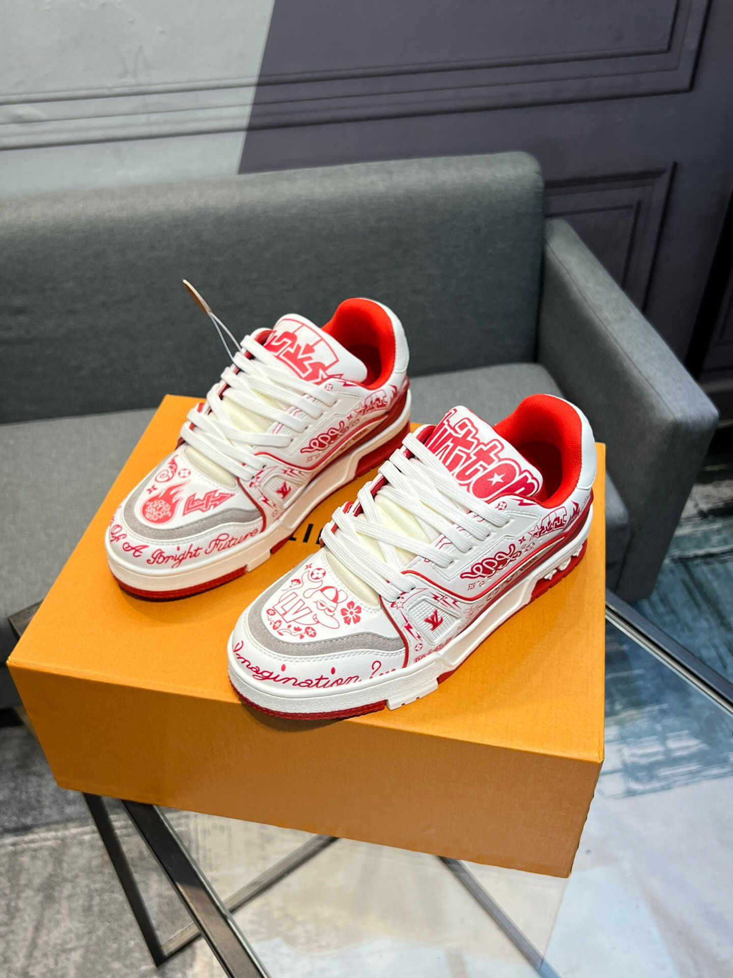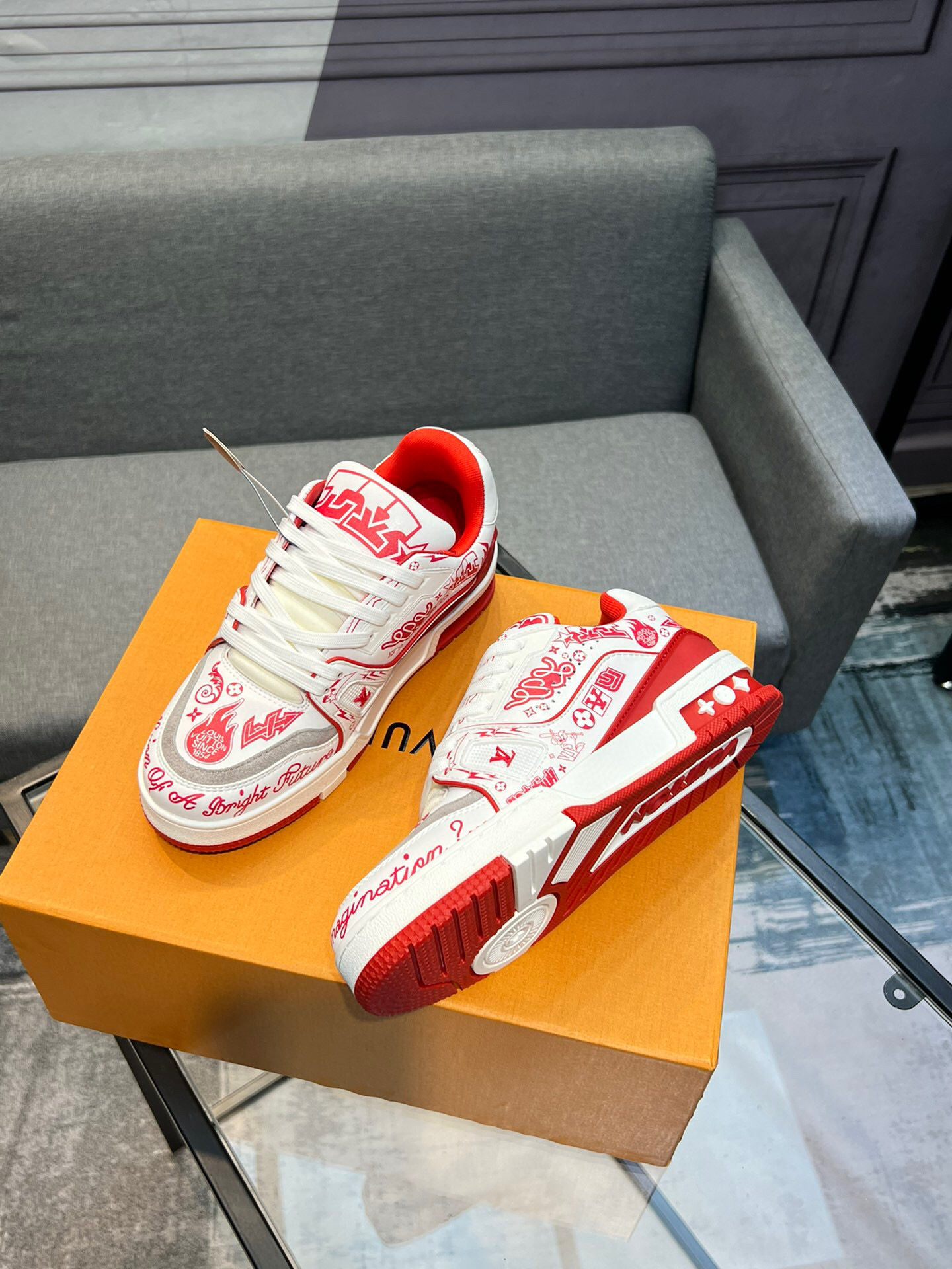 Step out in style with the Louis Vuitton L Couple Sneakers, designed for both comfort and fashion. These sneakers feature a striking red and white color scheme, adorned with unique graphics that make a bold statement.