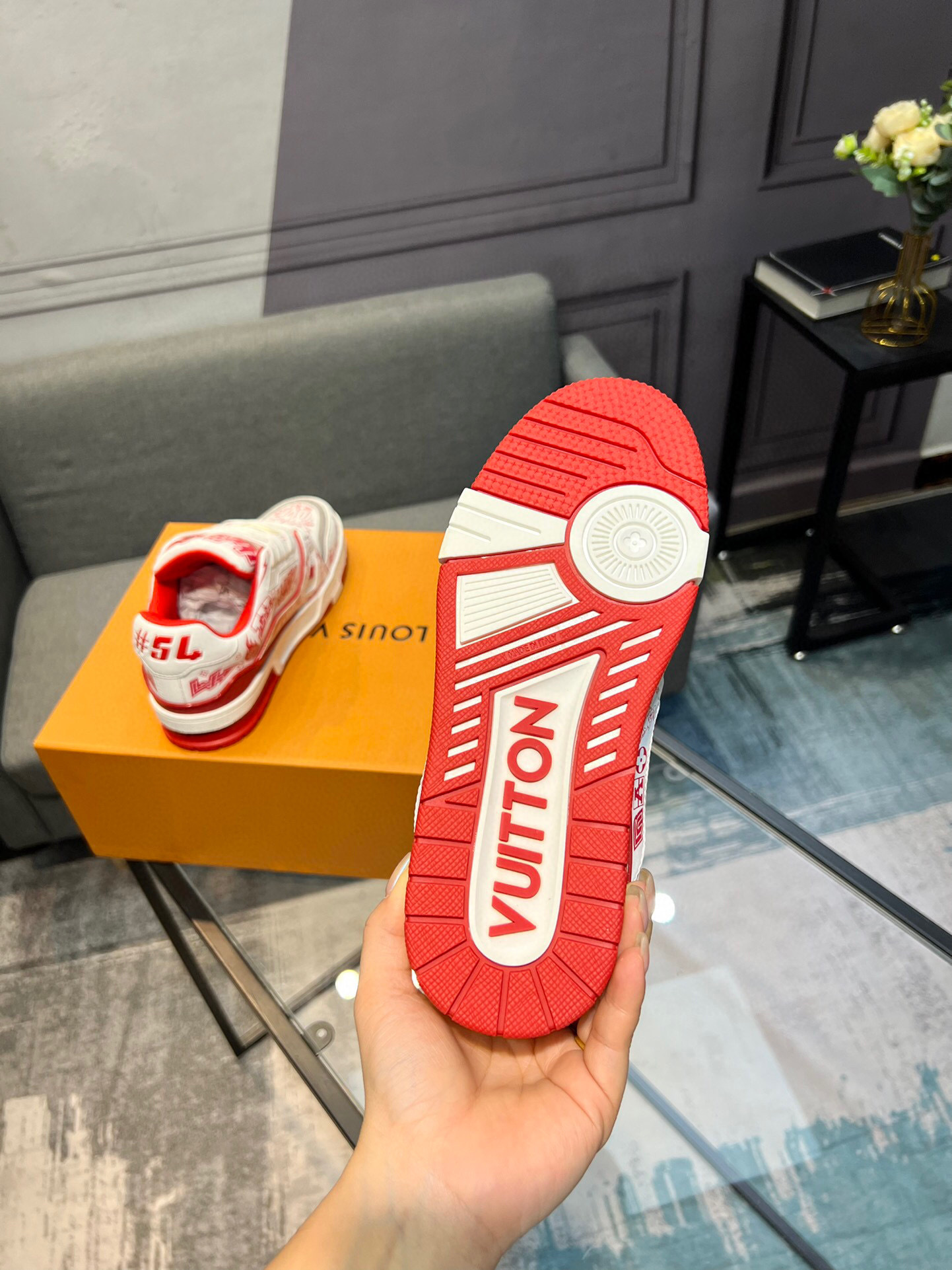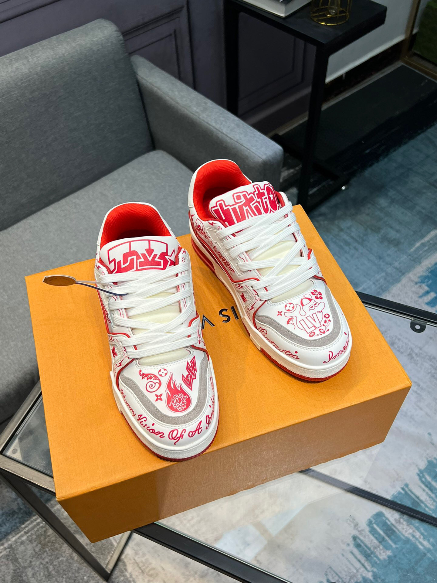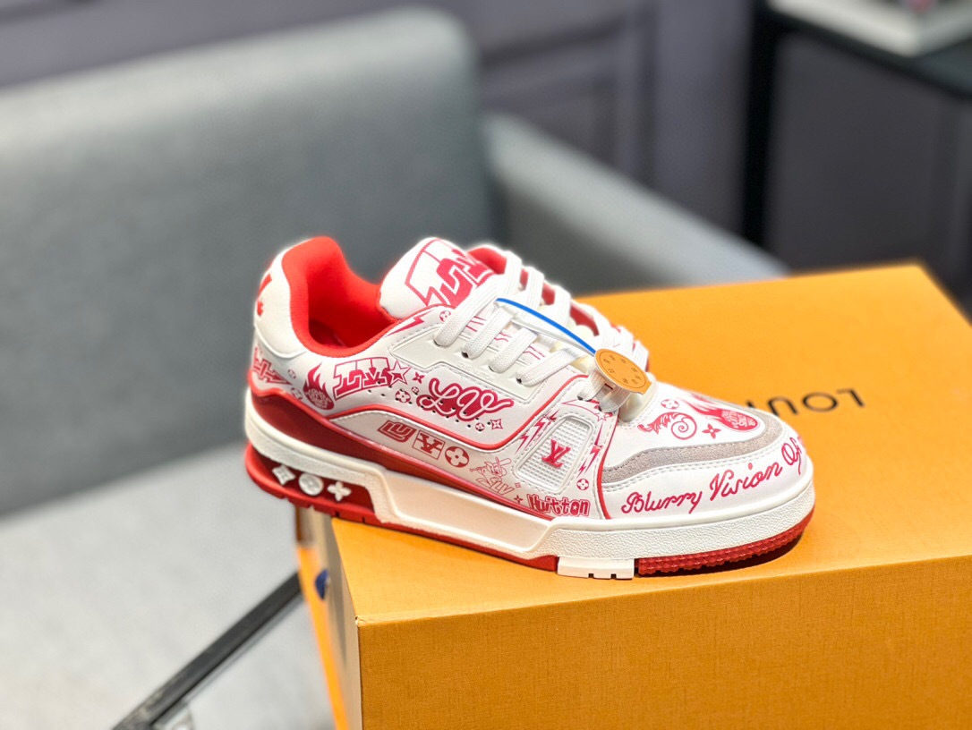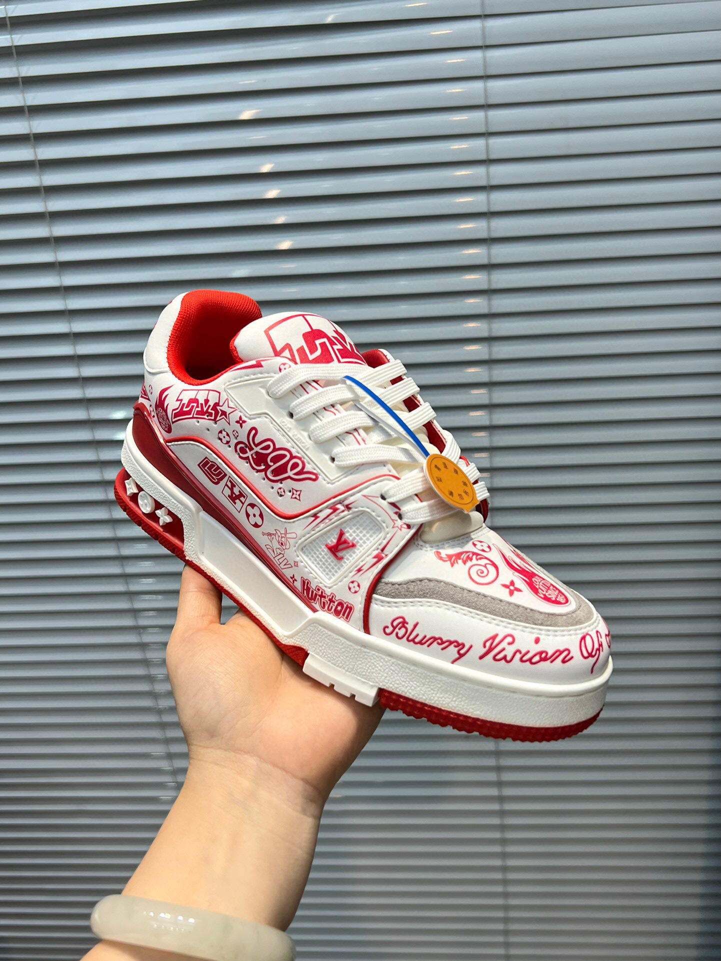 Step out in style with the Louis Vuitton L Couple Sneakers, designed for both comfort and fashion. These sneakers feature a striking red and white color scheme, adorned with unique graphics that make a bold statement.