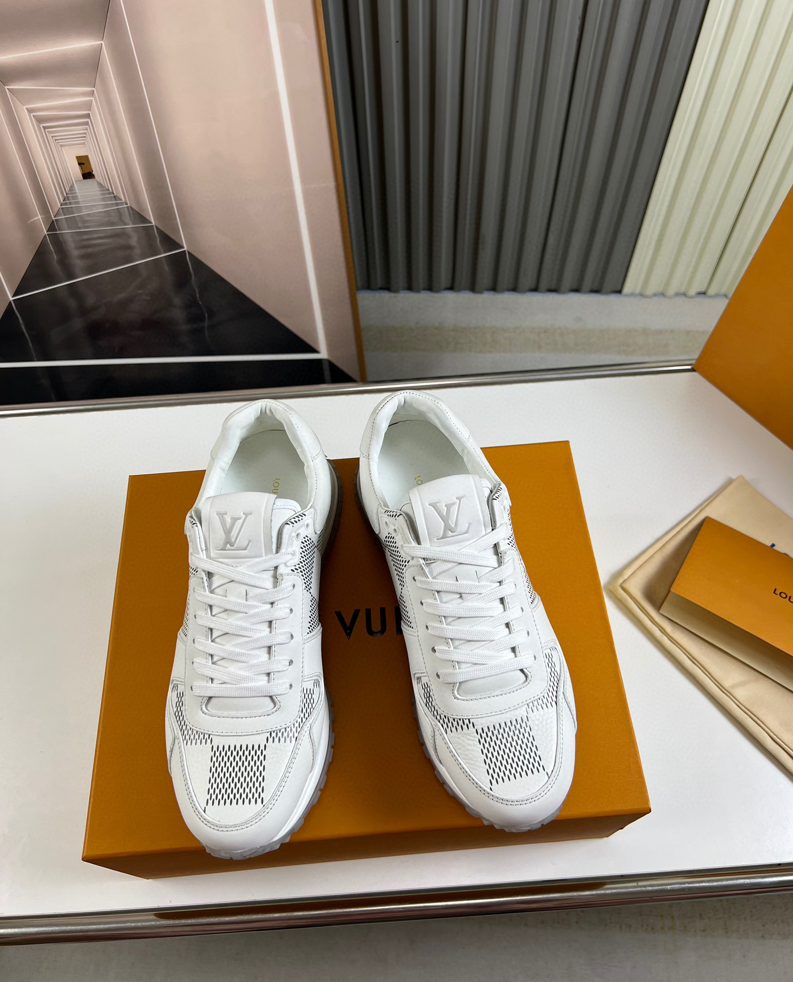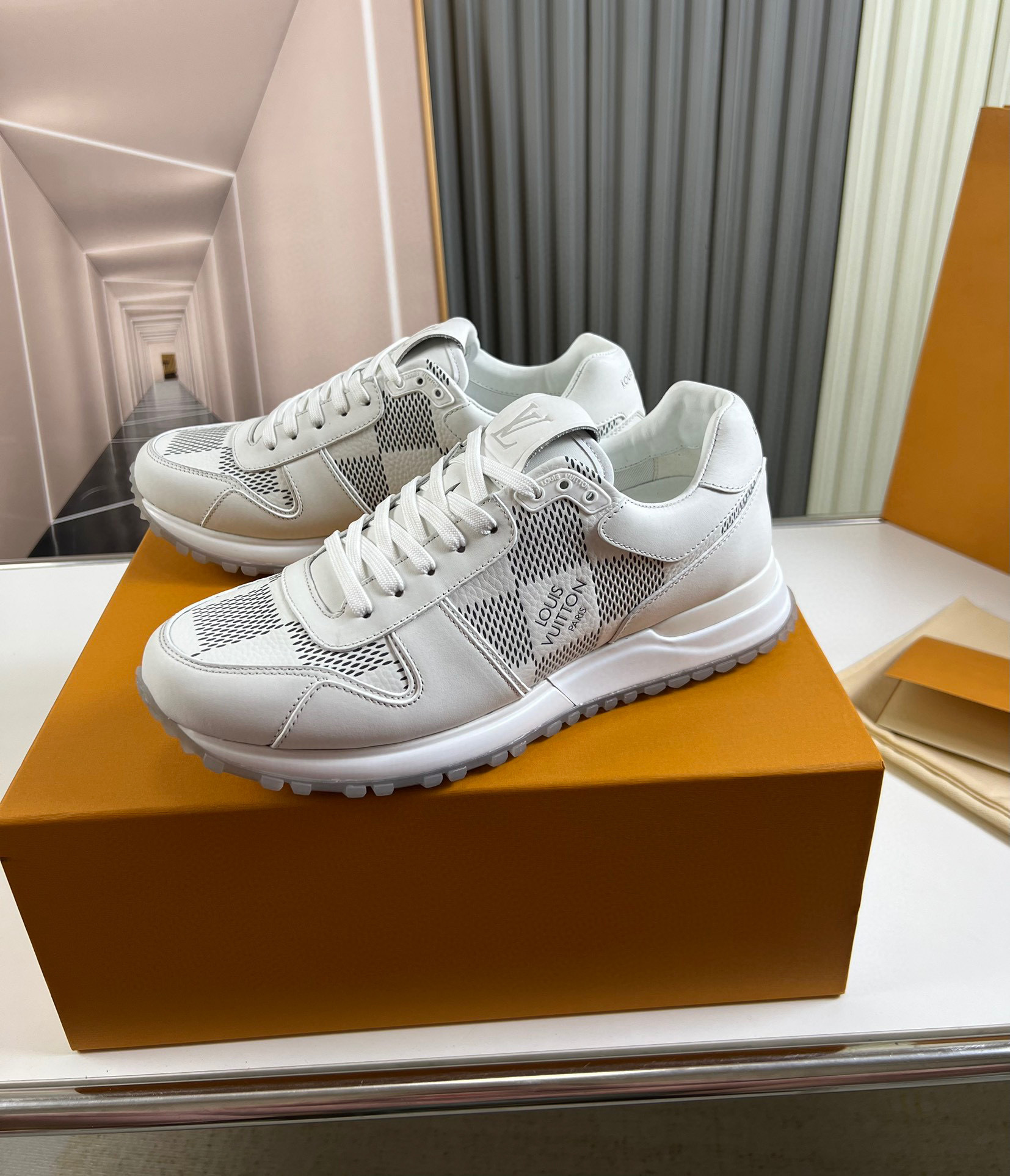 Discover the perfect blend of luxury and comfort with the Louis Vuitton L High-End Sneakers. Designed for both style and functionality, these sneakers feature a sleek white exterior with breathable mesh panels.