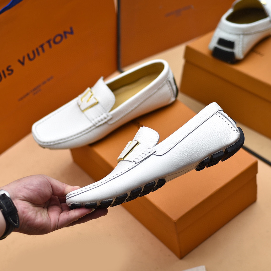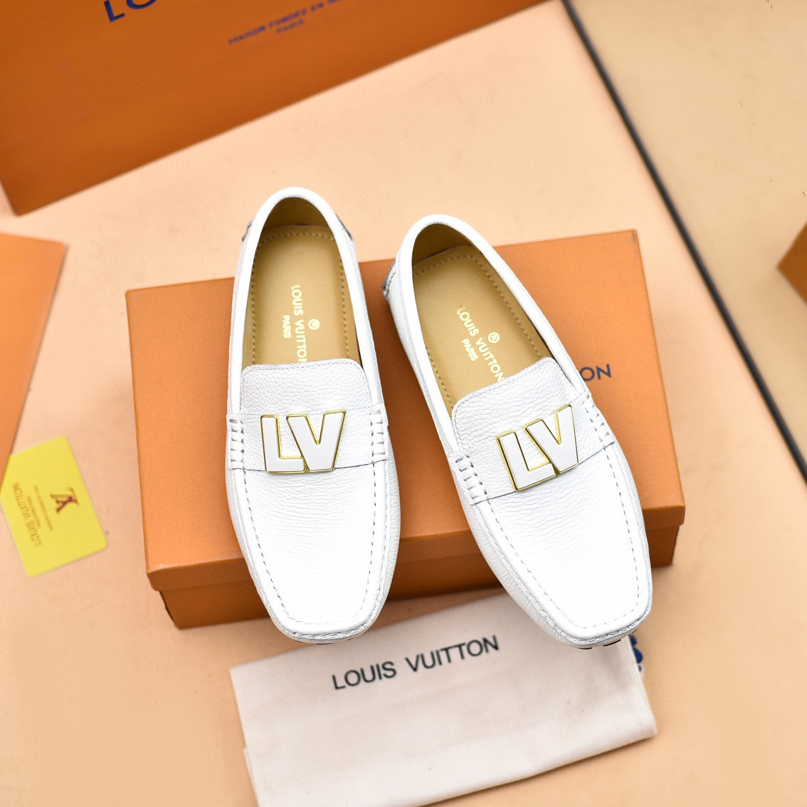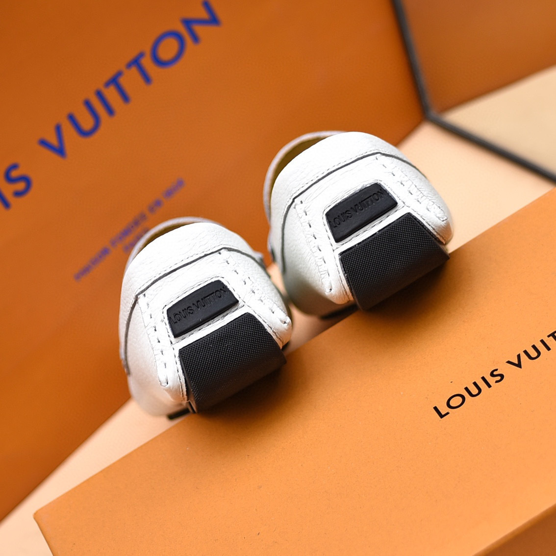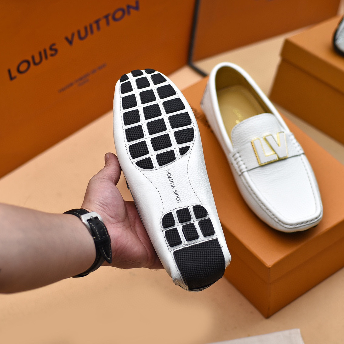 Experience luxury and comfort with the Louis Vuitton L Slip-On Shoes. Crafted from premium materials, these shoes feature a sleek white design complemented by a distinctive LV logo.