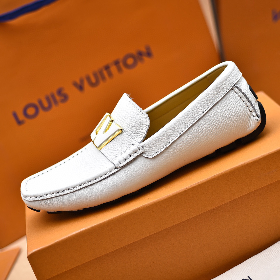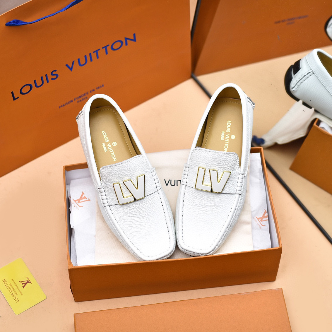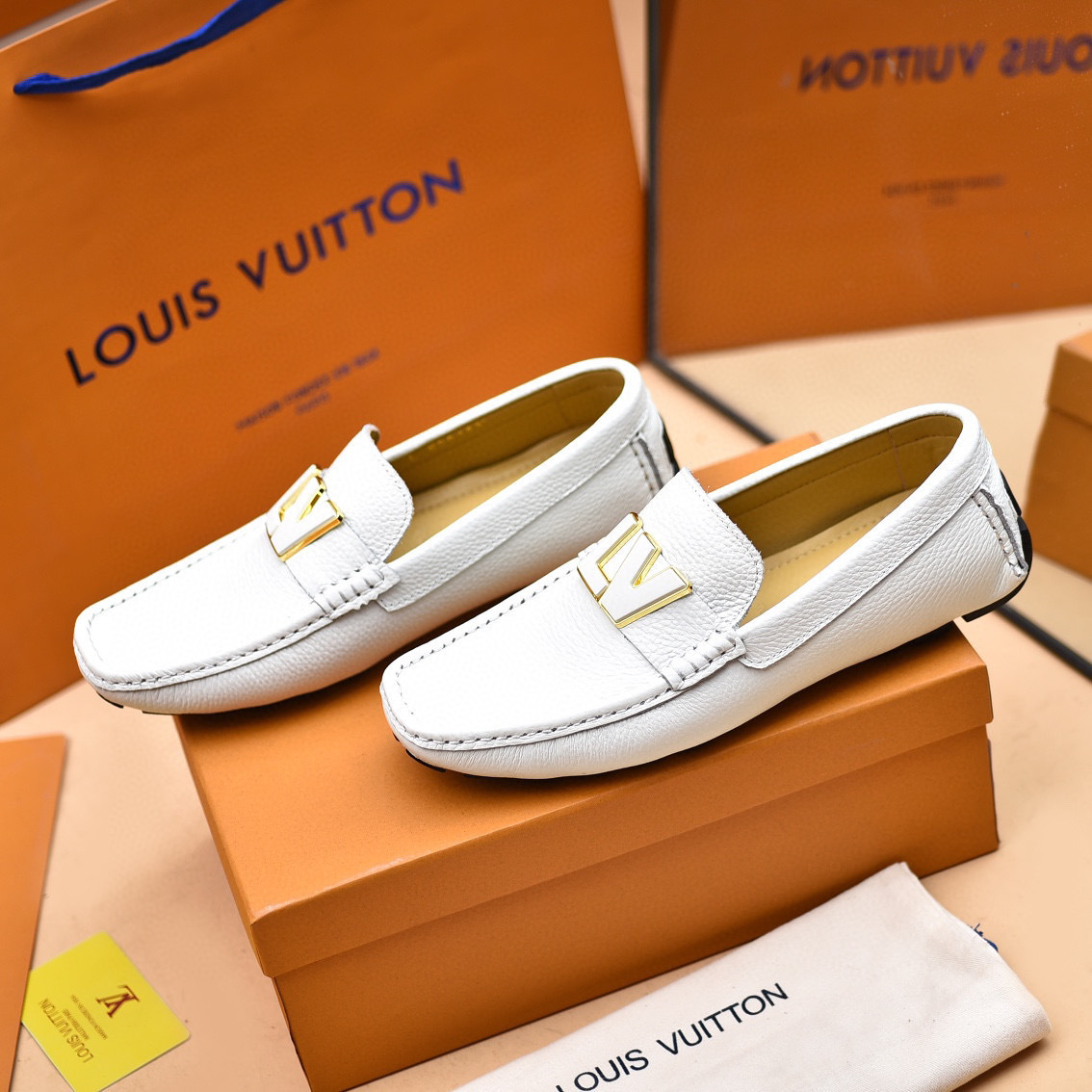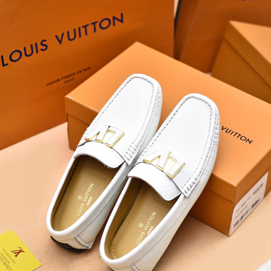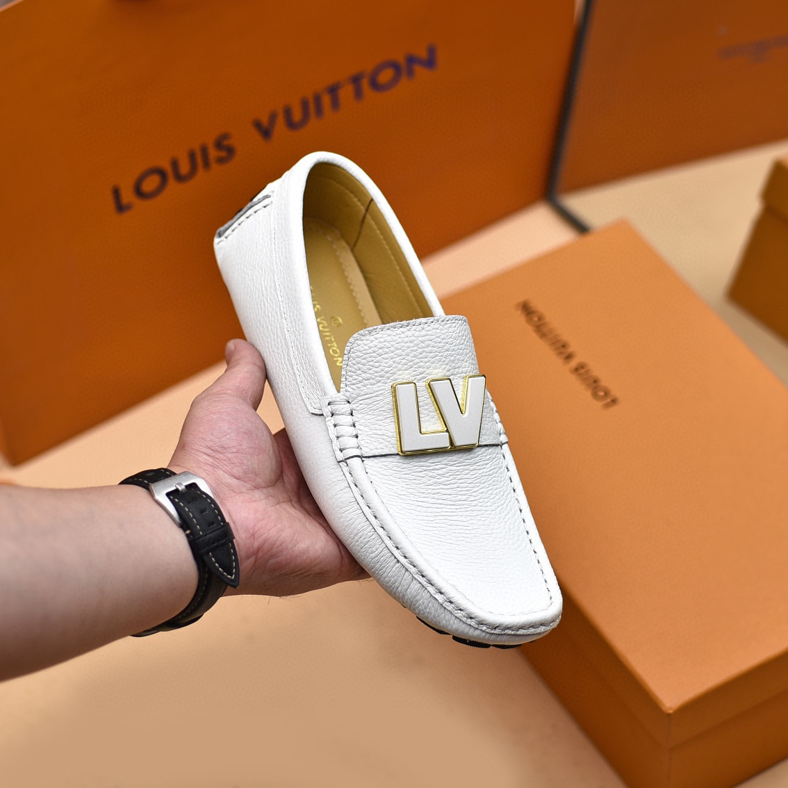 Experience luxury and comfort with the Louis Vuitton L Slip-On Shoes. Crafted from premium materials, these shoes feature a sleek white design complemented by a distinctive LV logo.