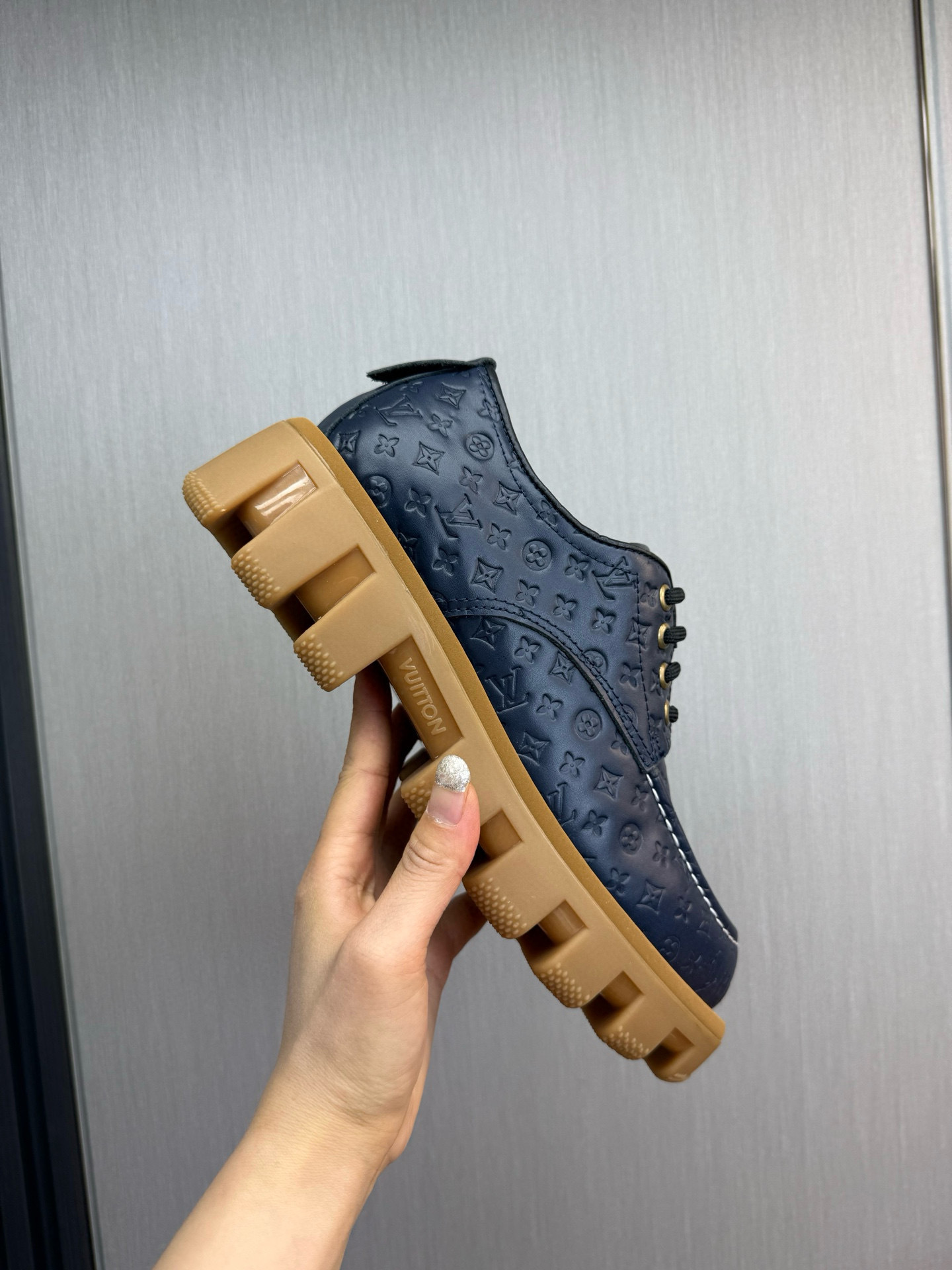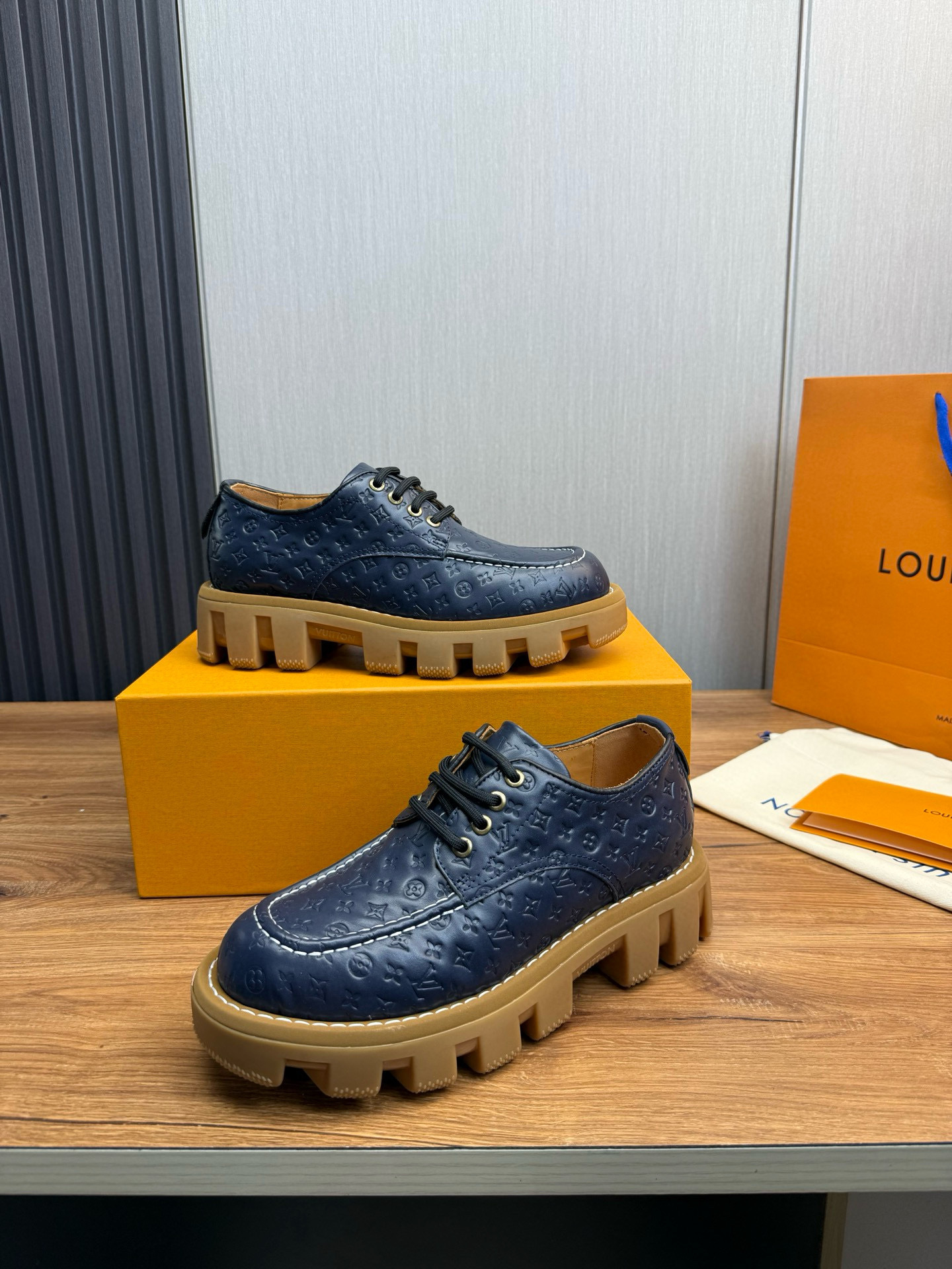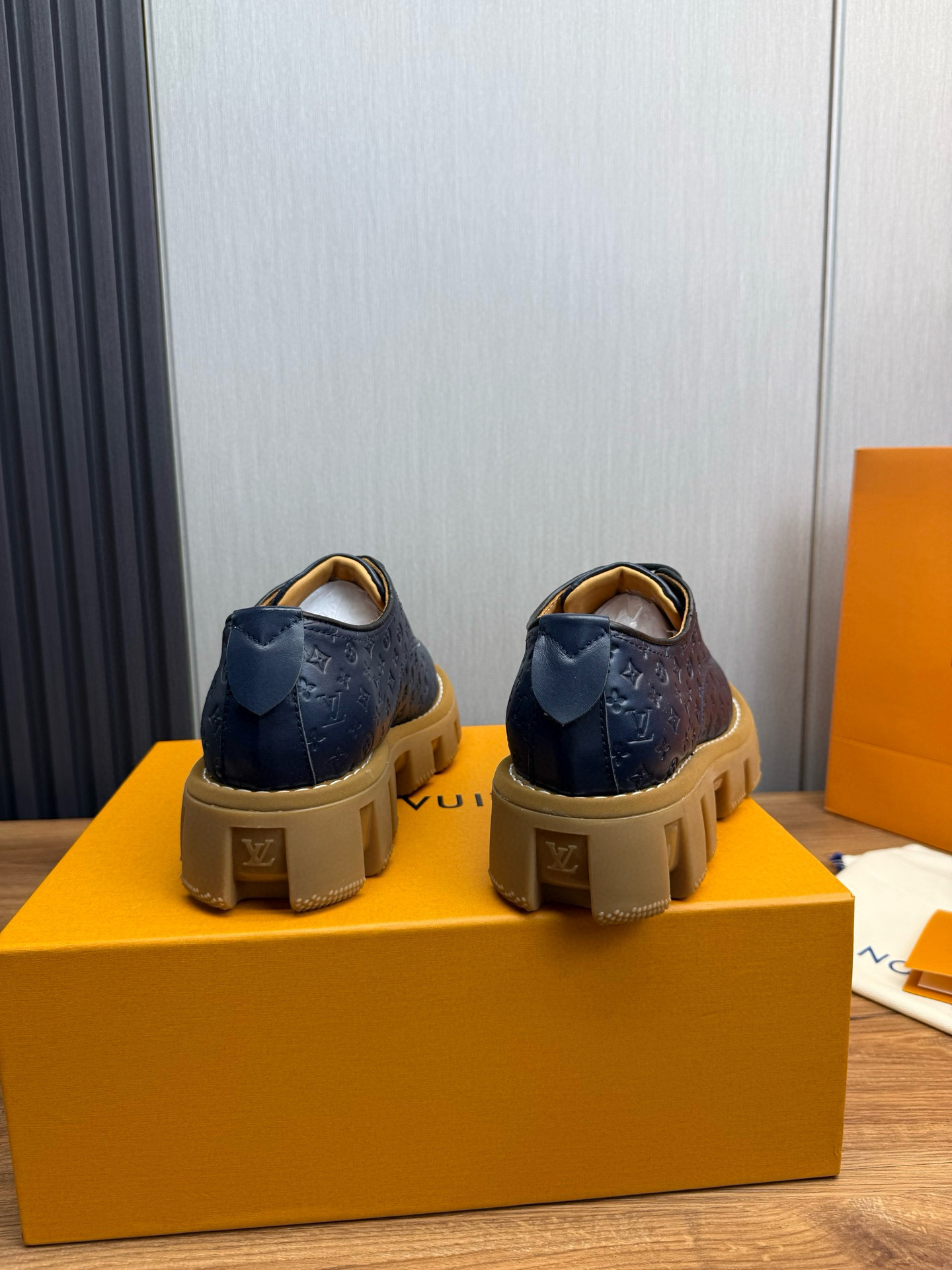 Discover the perfect blend of luxury and comfort with these Louis Vuitton leather shoes. Designed in a striking navy color, these shoes feature the iconic Louis Vuitton monogram embossed on the upper, showcasing a sophisticated aesthetic.