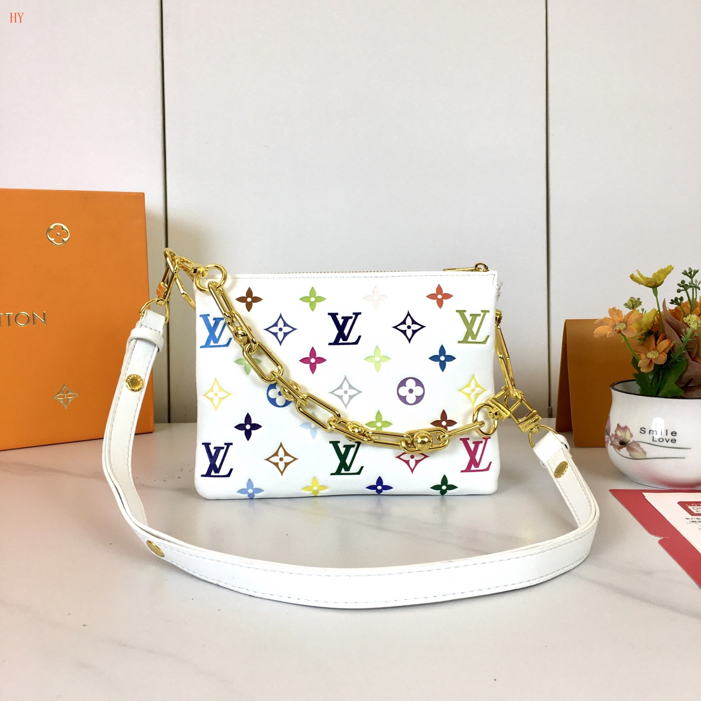 The bag showcases a playful mix of colors on a classic white background, adorned with the iconic LV monogram. It features a chic gold chain and a comfortable white strap for versatile styling options.