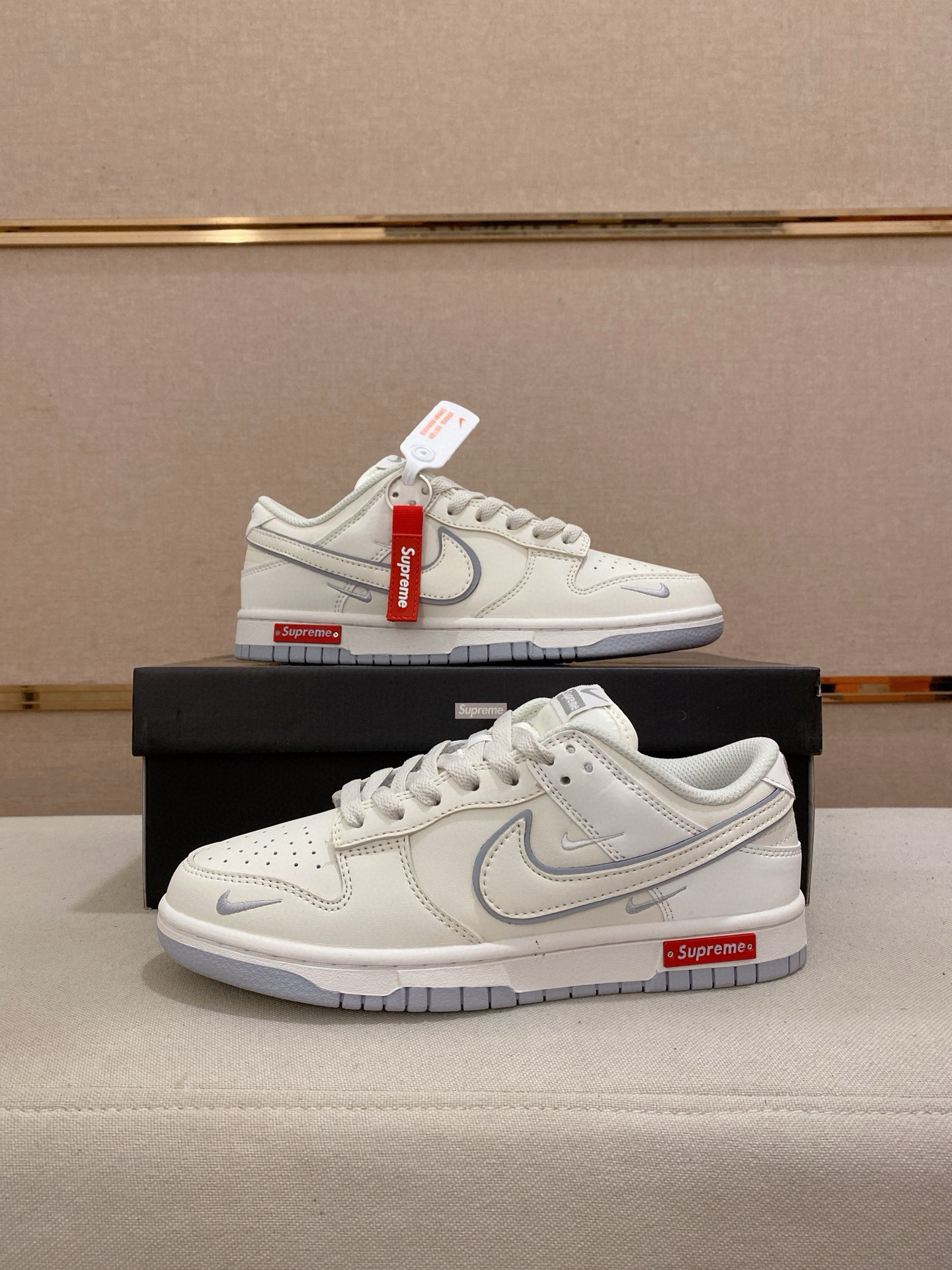 The Nike Dunk Low x Supreme in White is a stylish collaboration that combines iconic design with premium materials. This sneaker features a clean white leather upper with subtle grey accents, making it a versatile addition to any wardrobe.