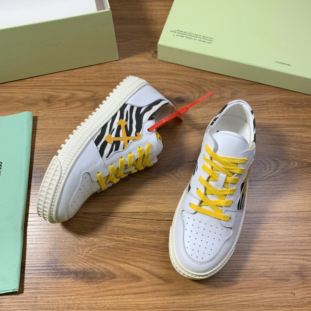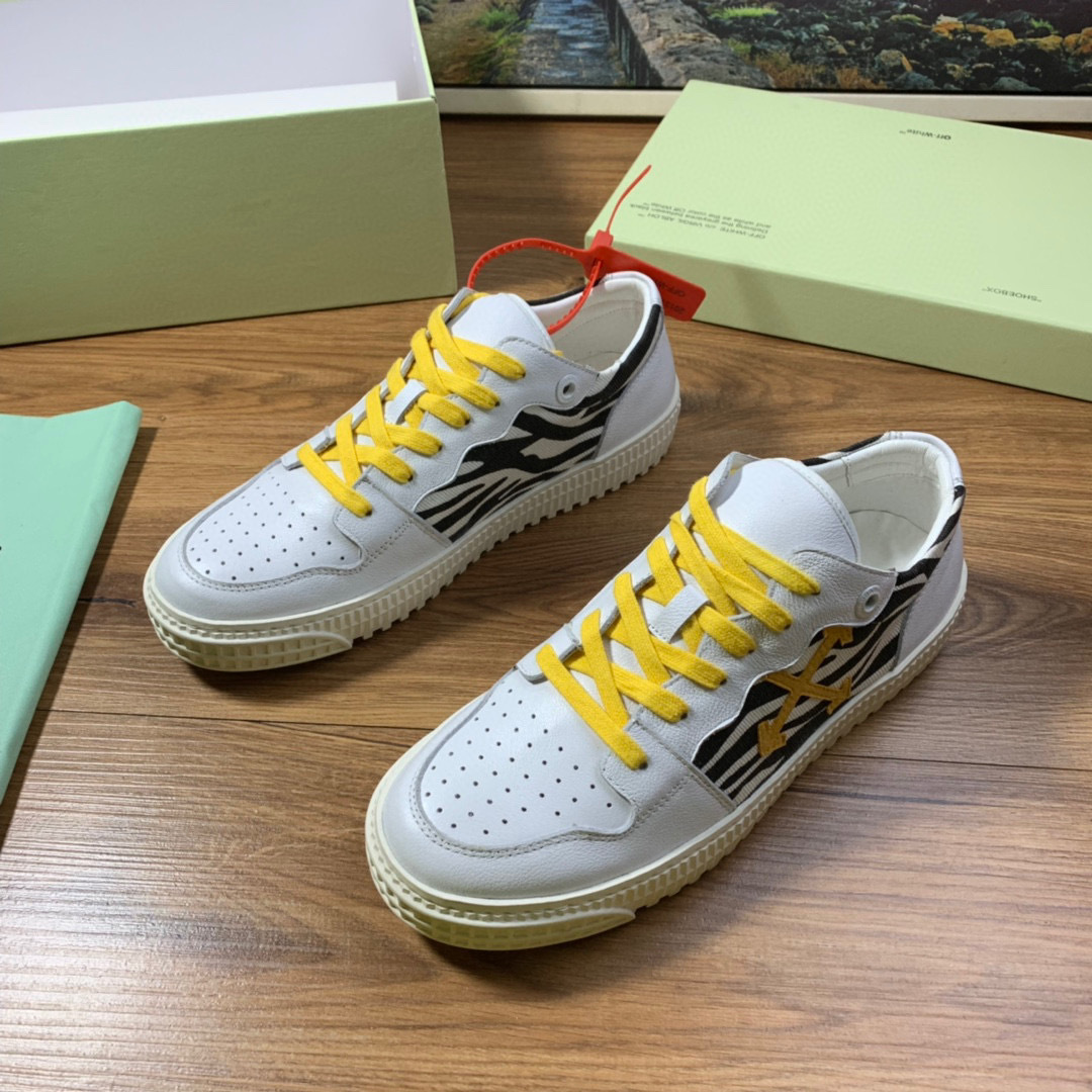 Step out in style with these Off-White casual shoes, available in sizes 38-44. The shoes showcase a striking combination of white leather and zebra print, complemented by vibrant yellow laces and branding.