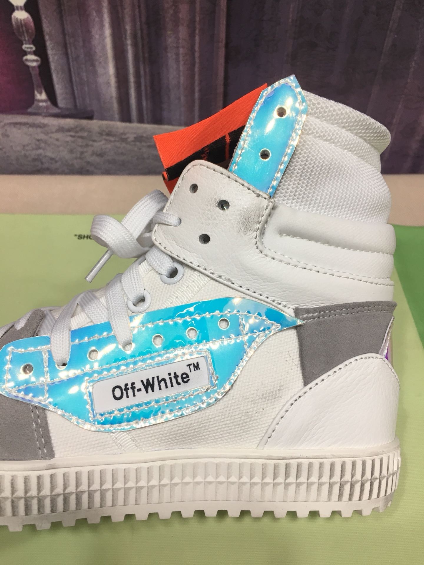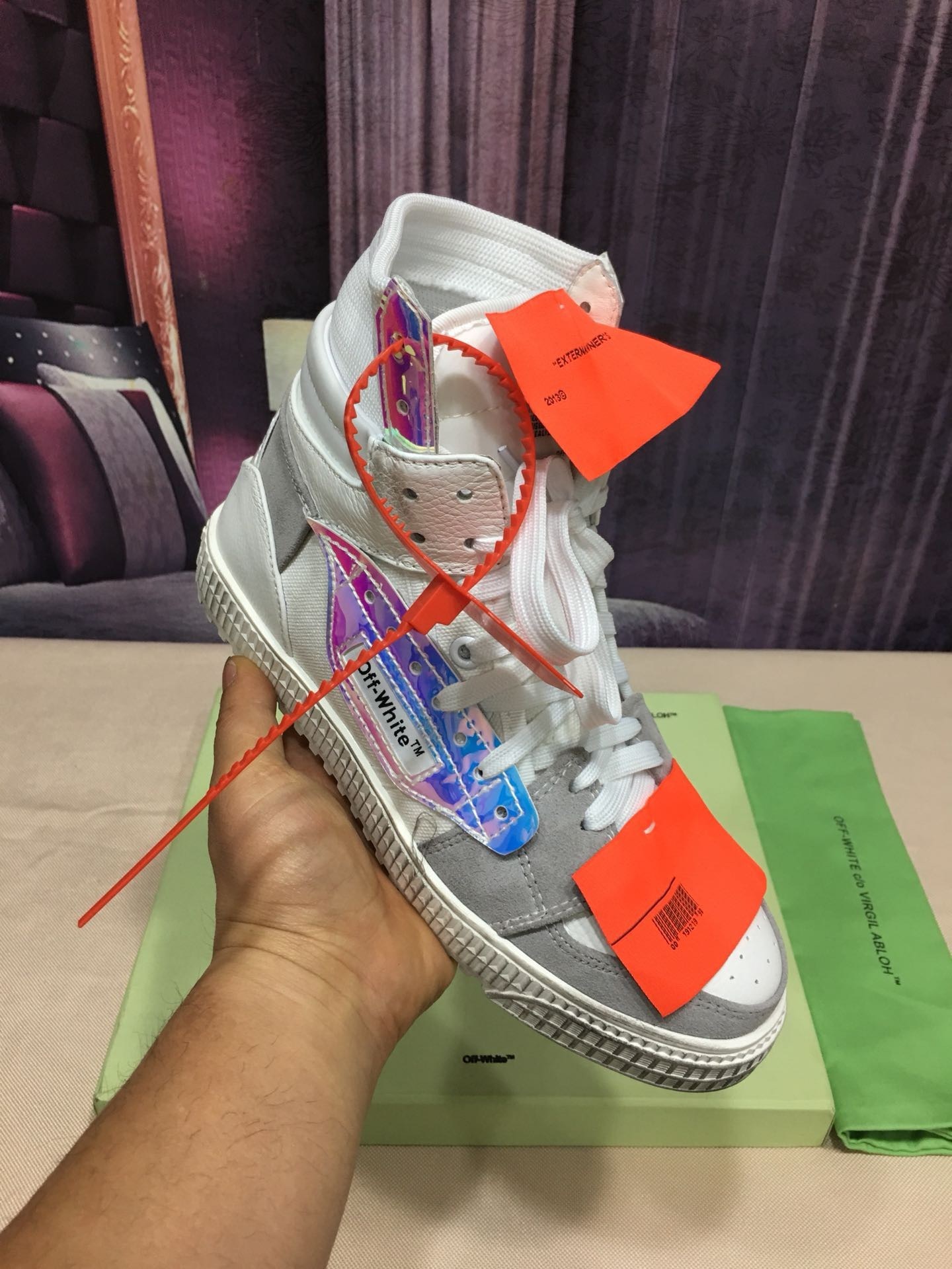 Step out in style with these Off-White high-top sneakers, perfect for couples looking to make a fashion statement. Crafted with a unique design, these sneakers feature a combination of premium materials and a modern silhouette.
