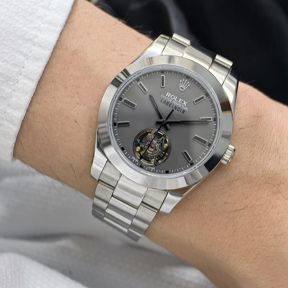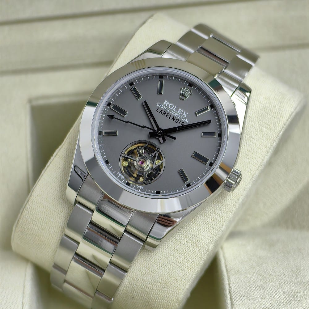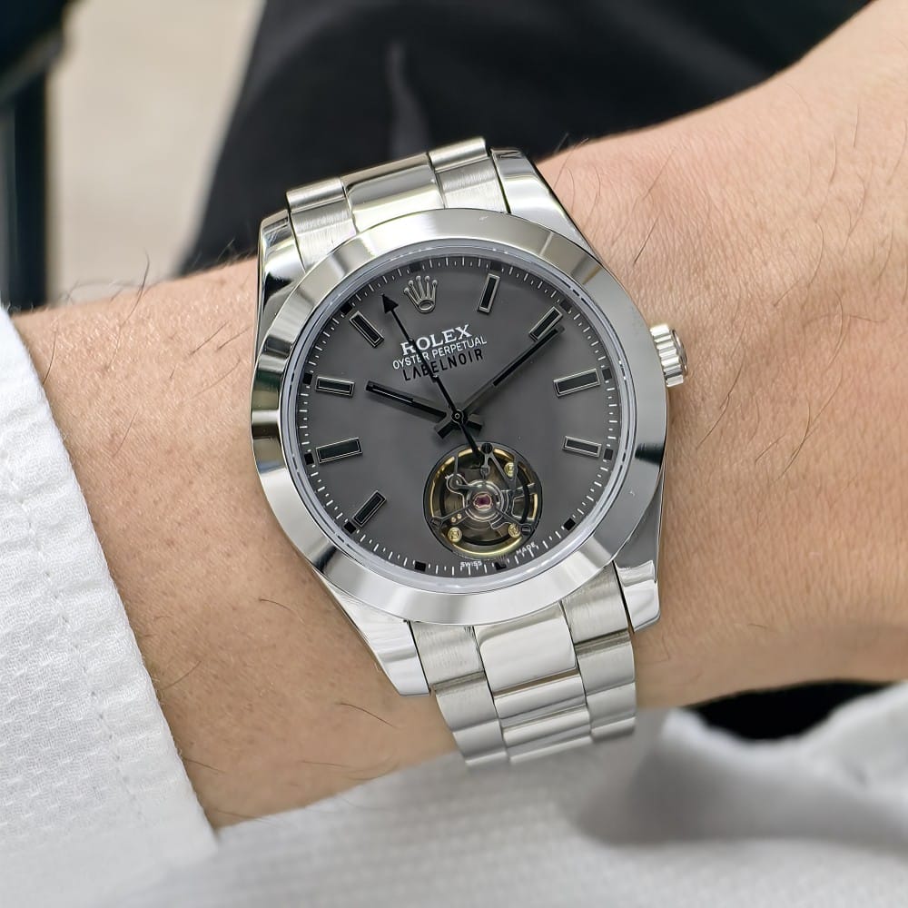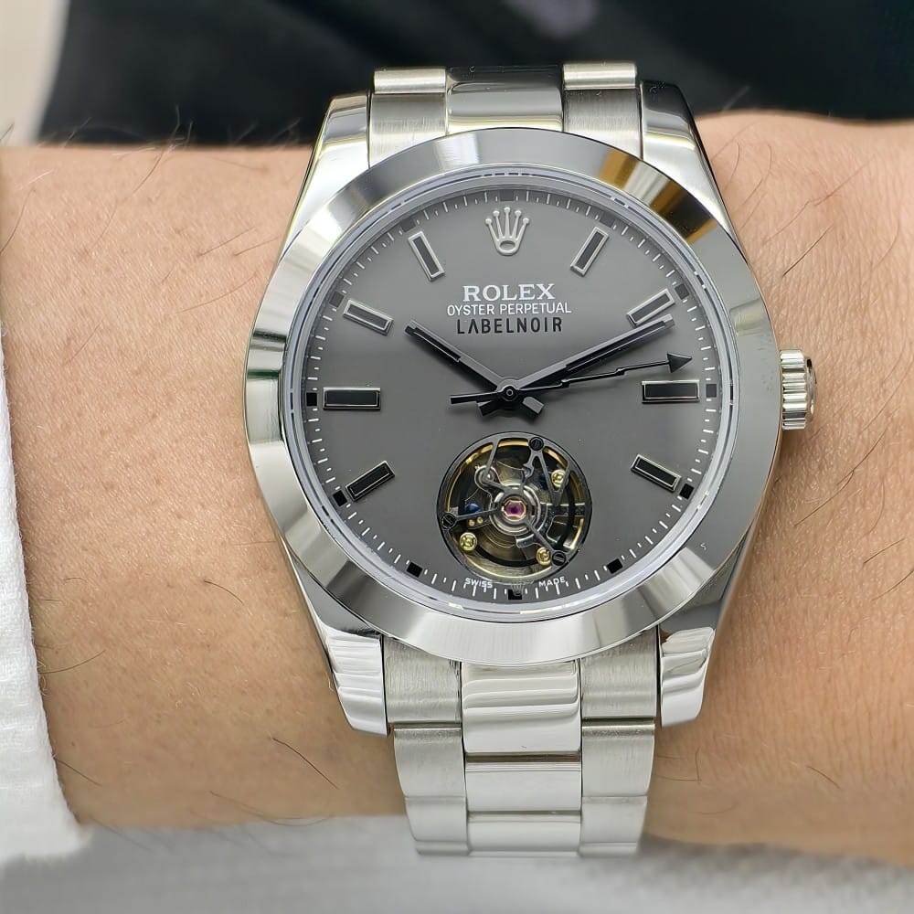 The Rolex Label Noir Silver is a stunning timepiece that combines luxury with functionality. With a 41mm case made from durable 316L stainless steel, this watch is designed to withstand the test of time while maintaining its sophisticated appearance.