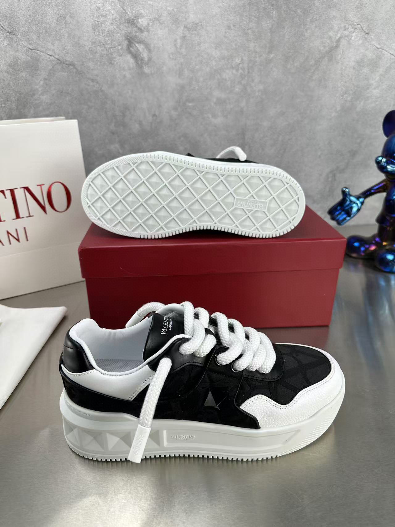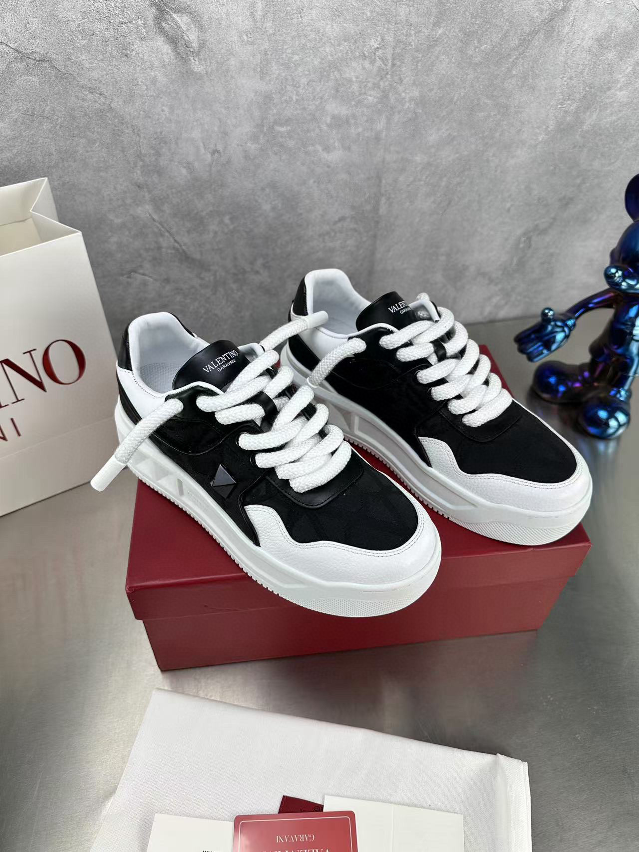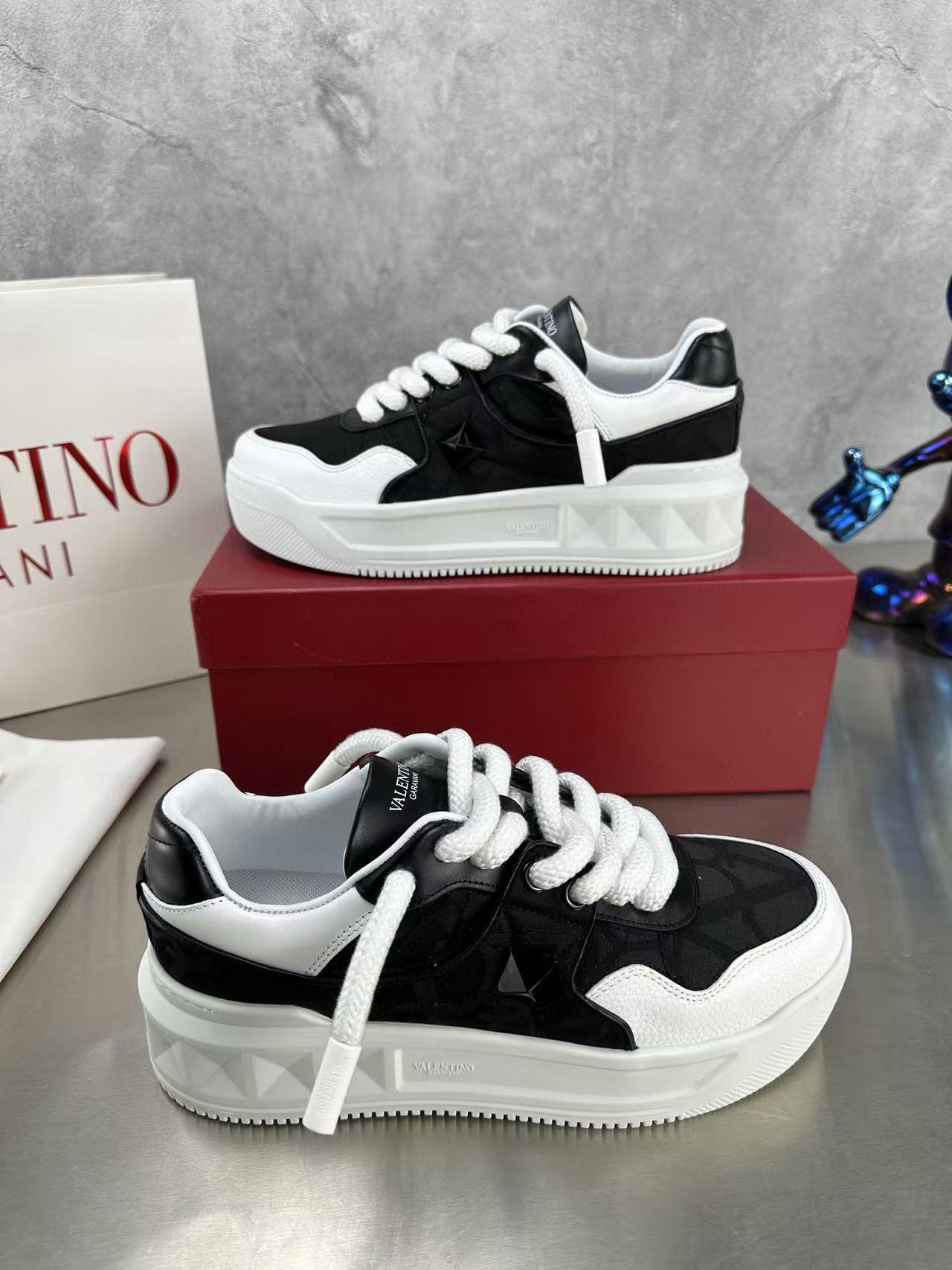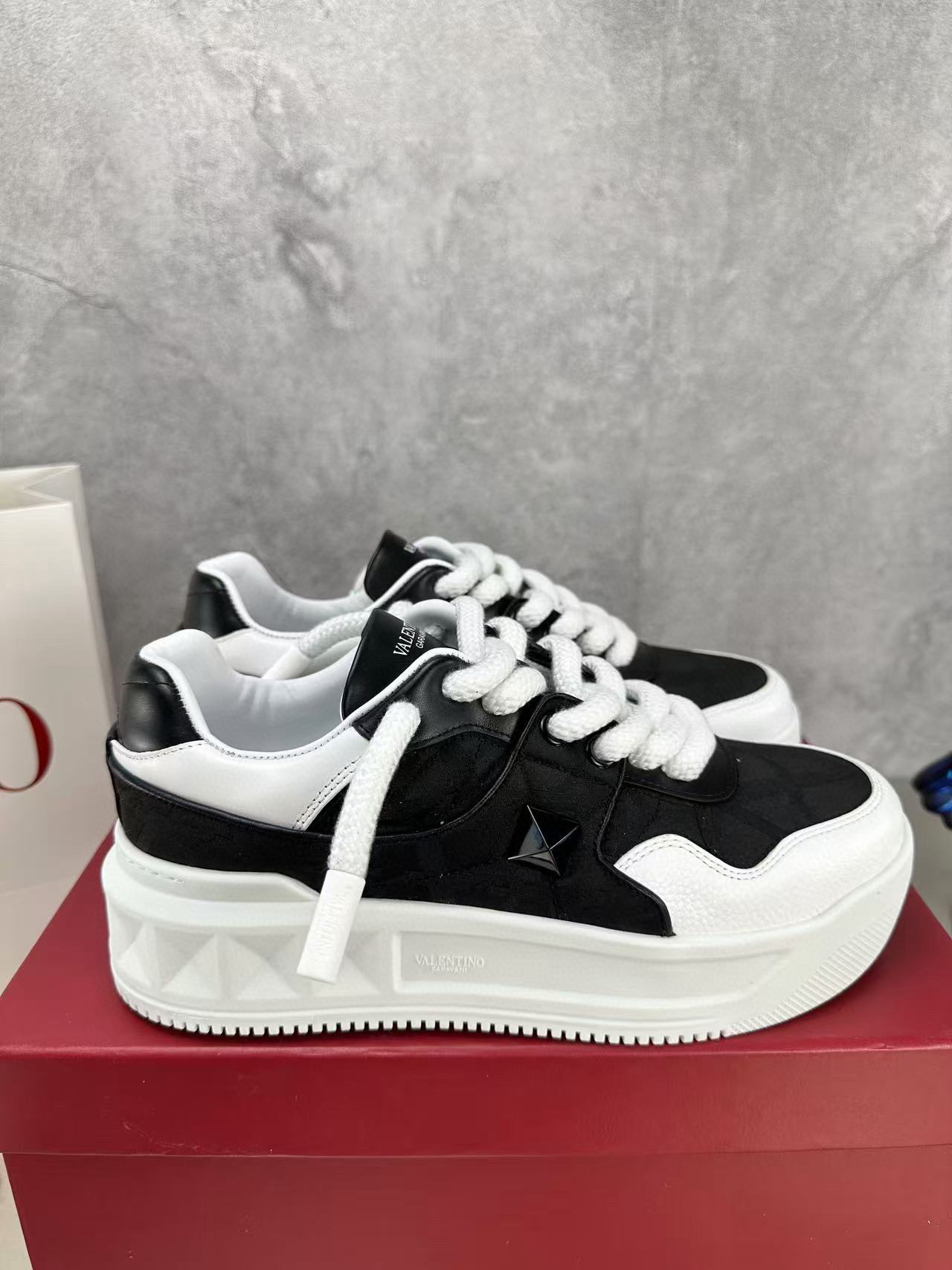 Step out in style with these Valentino couples sneakers, designed for both comfort and fashion. Featuring a sleek black and white color scheme, these sneakers are perfect for casual outings or a day on the town.