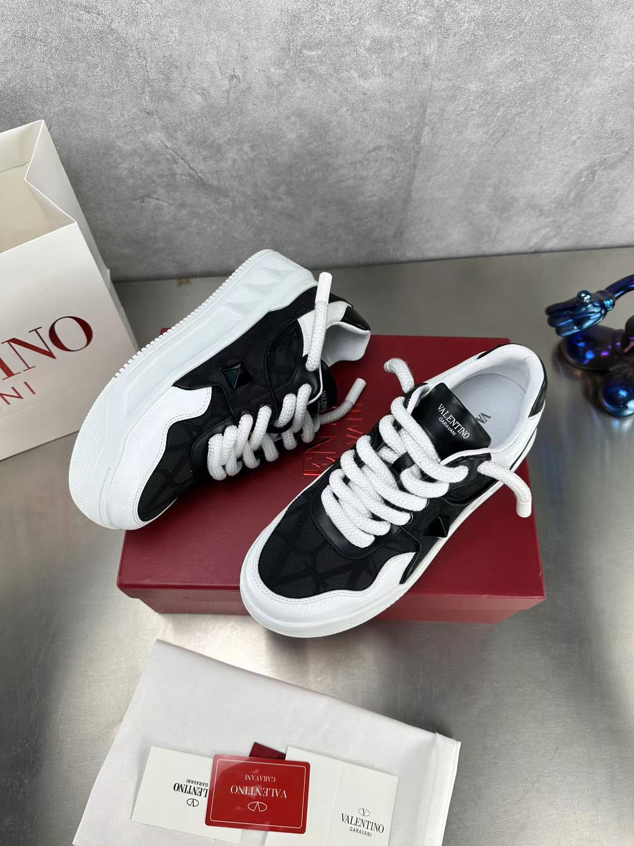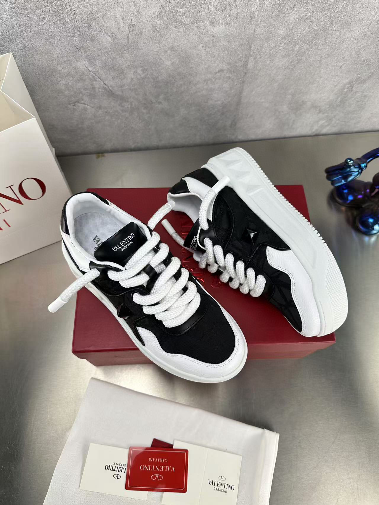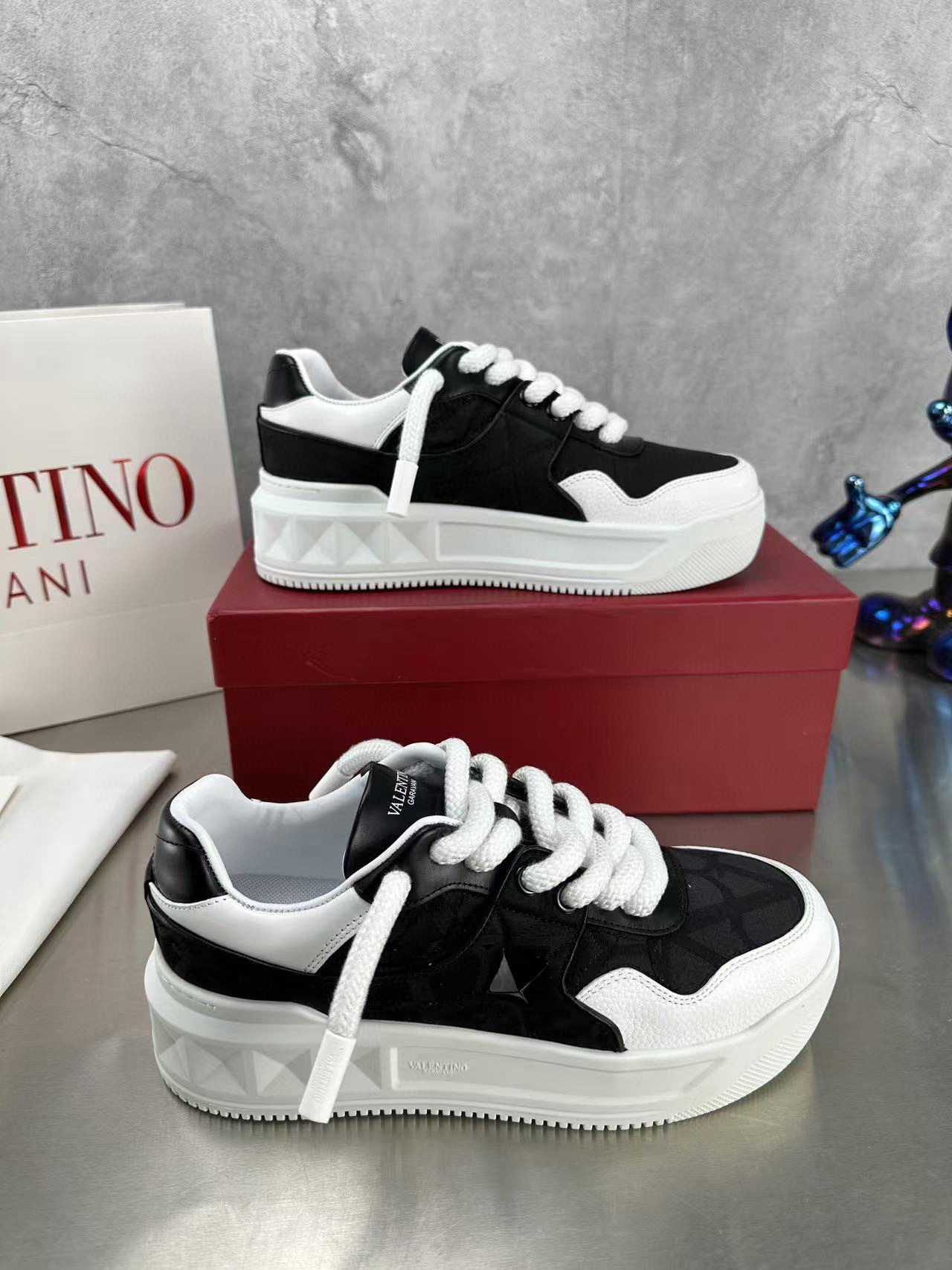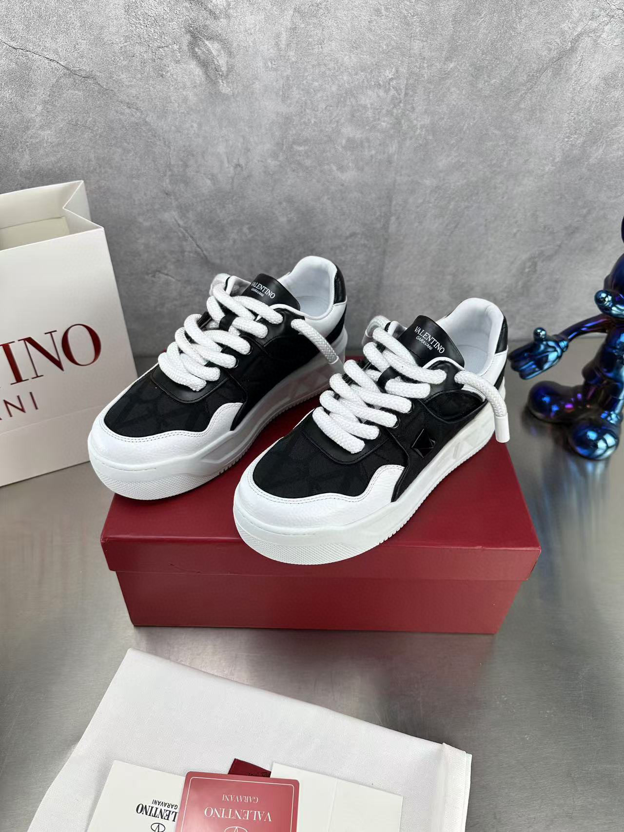 Step out in style with these Valentino couples sneakers, designed for both comfort and fashion. Featuring a sleek black and white color scheme, these sneakers are perfect for casual outings or a day on the town.