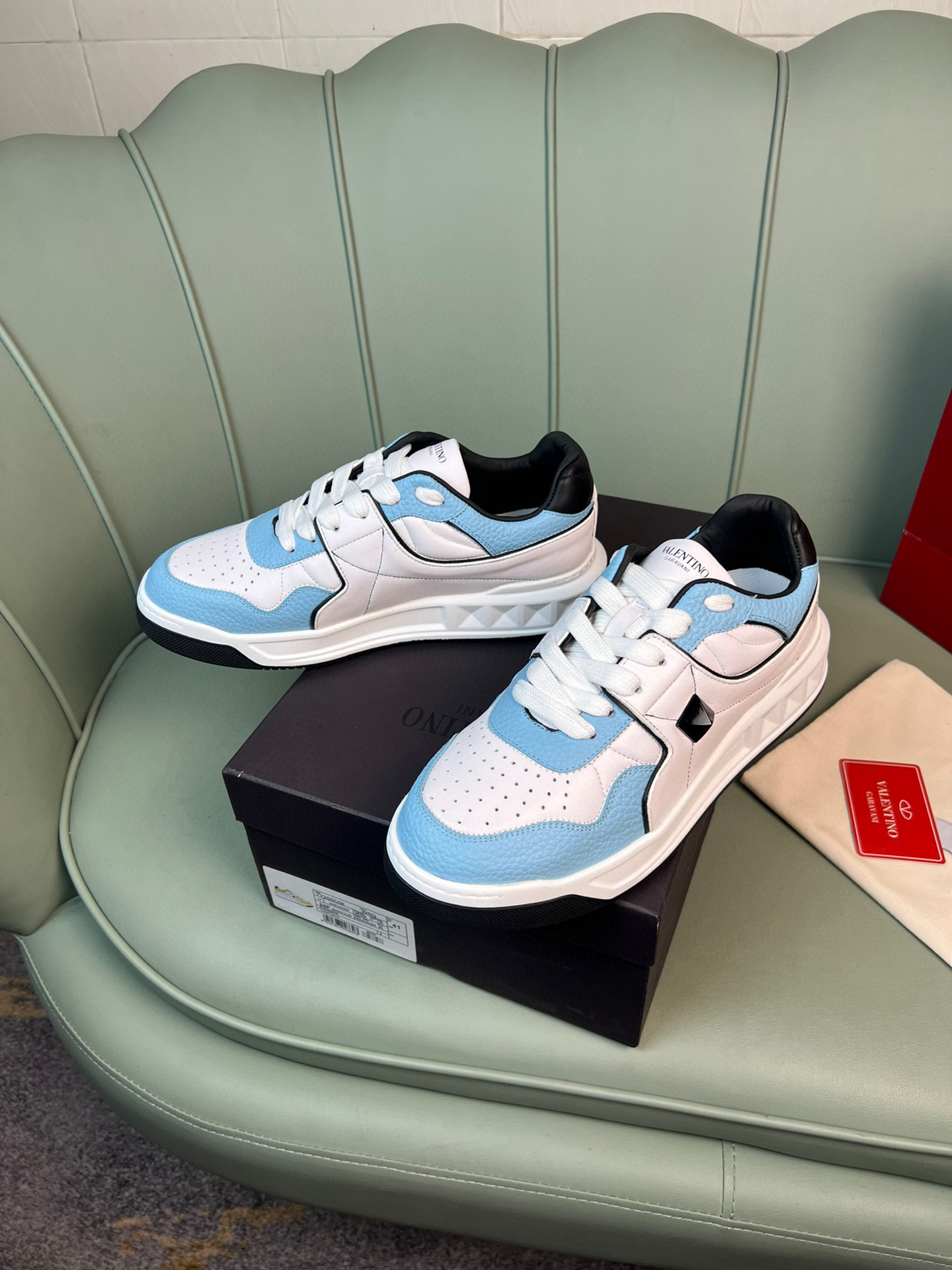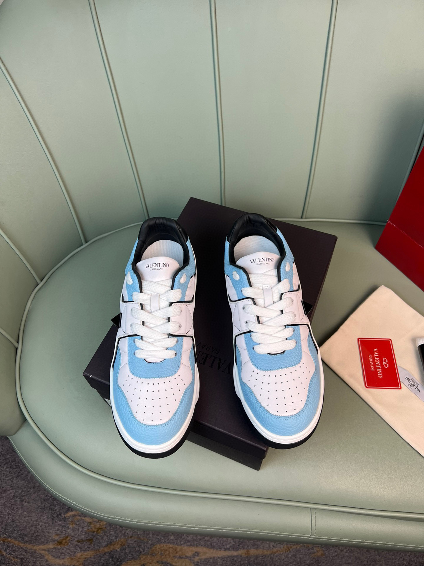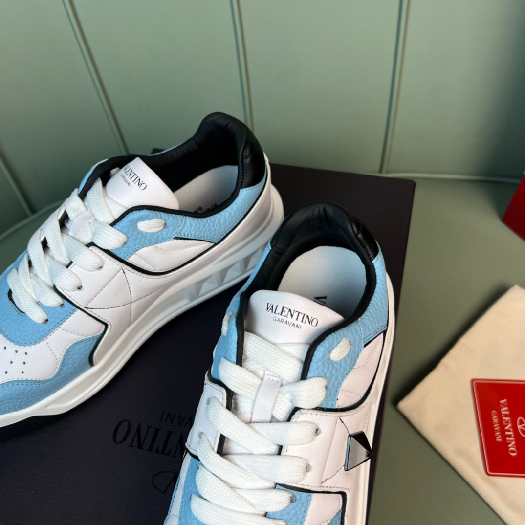 Elevate your footwear collection with these chic Valentino couples sneakers. Designed for both comfort and style, these sneakers feature a striking blue and white color scheme that complements any outfit.