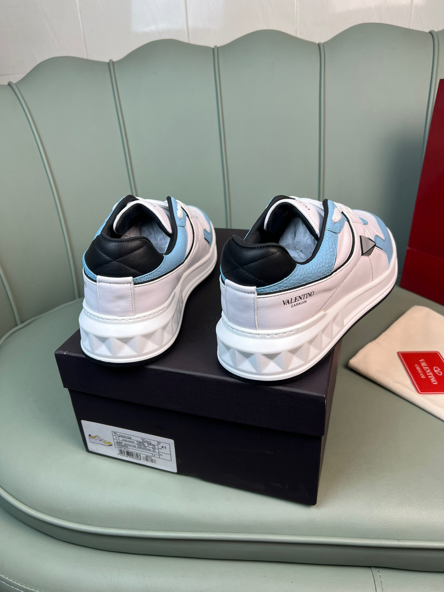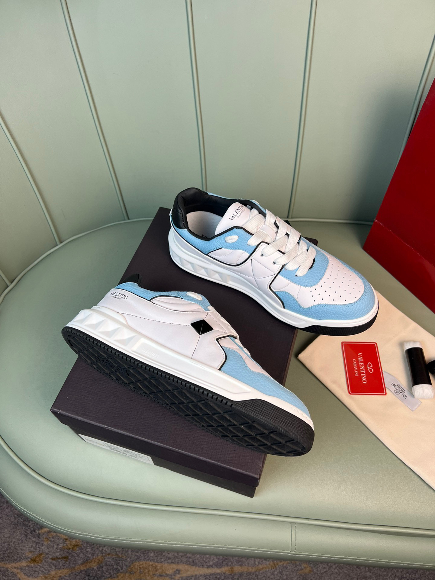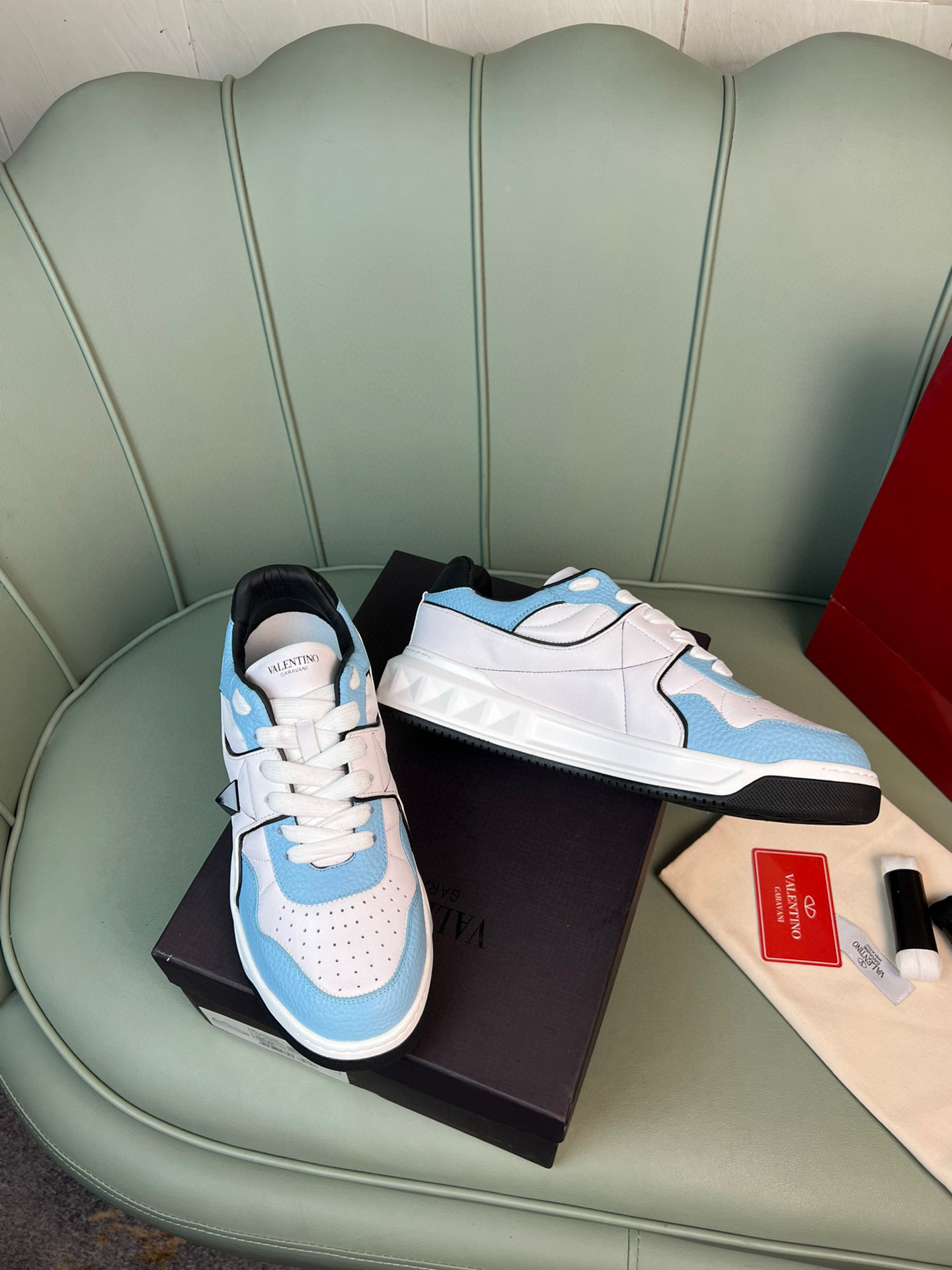 Elevate your footwear collection with these chic Valentino couples sneakers. Designed for both comfort and style, these sneakers feature a striking blue and white color scheme that complements any outfit.