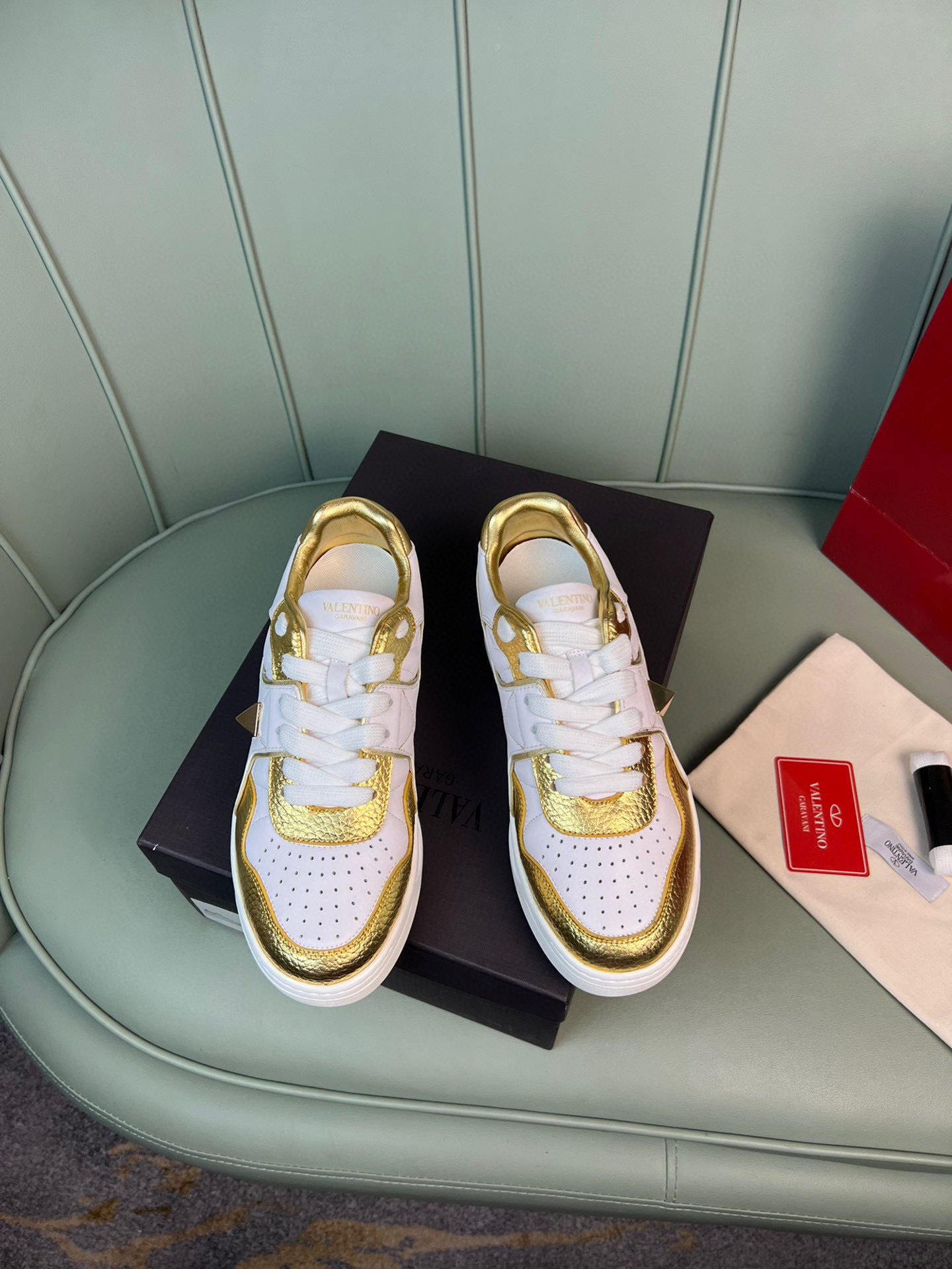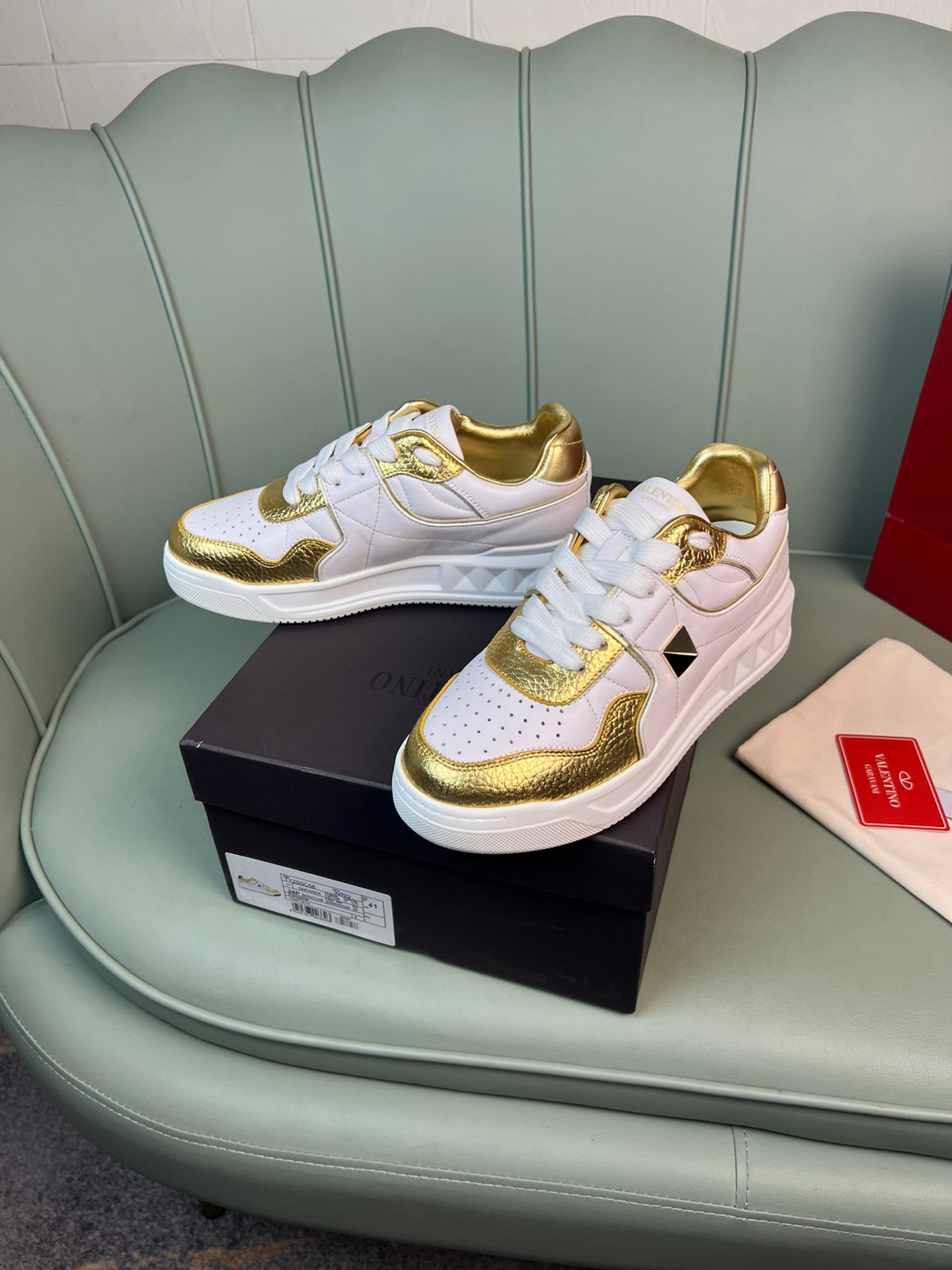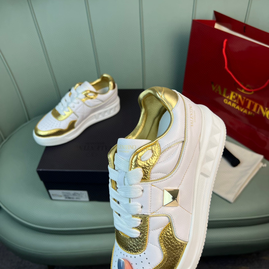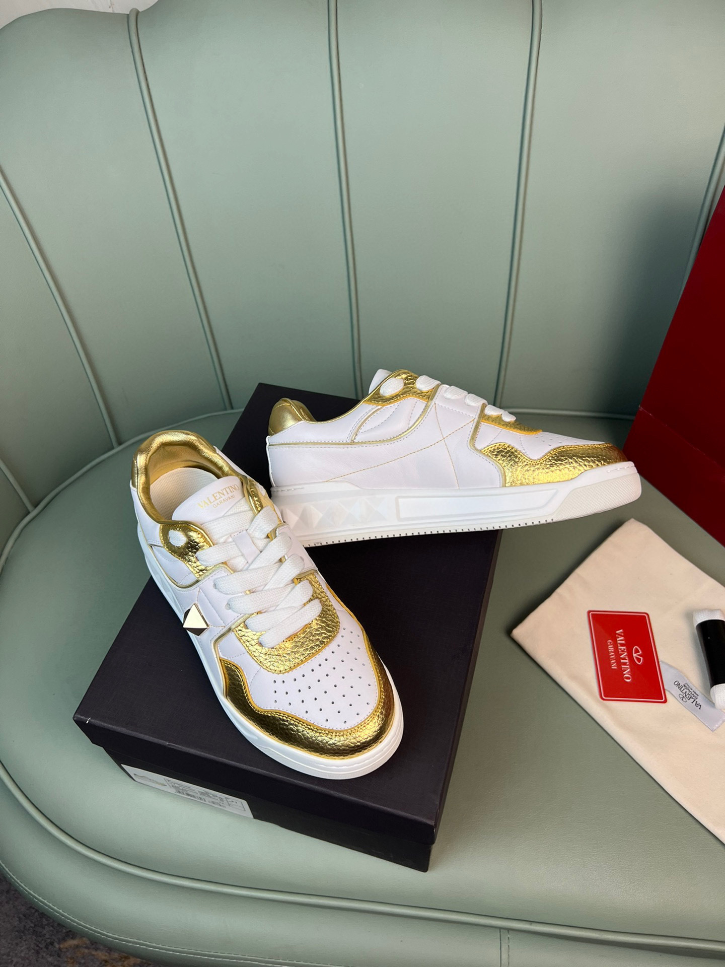 Step out in style with these Valentino couples sneakers, designed for both comfort and fashion. The sneakers feature a sleek white base with eye-catching gold accents, making them perfect for casual outings or special occasions.