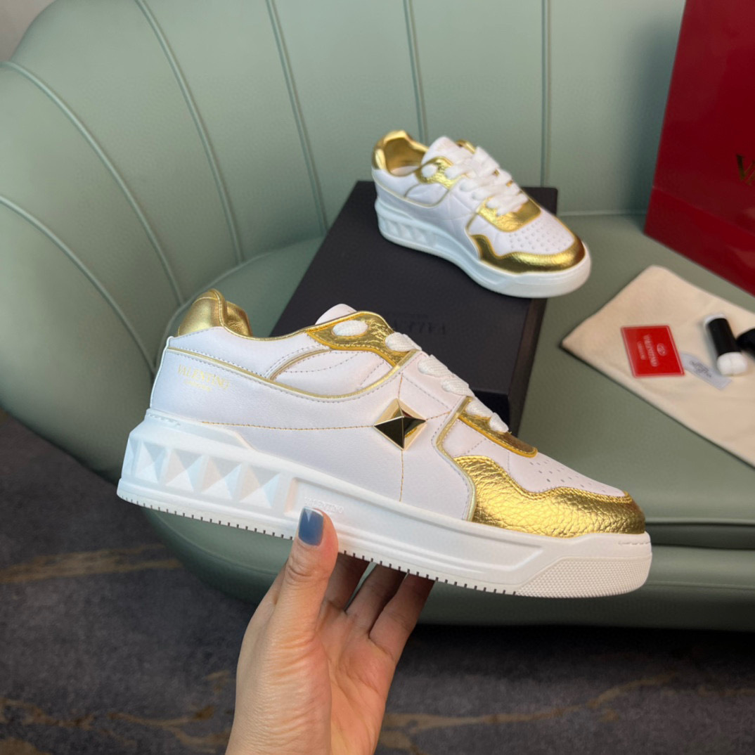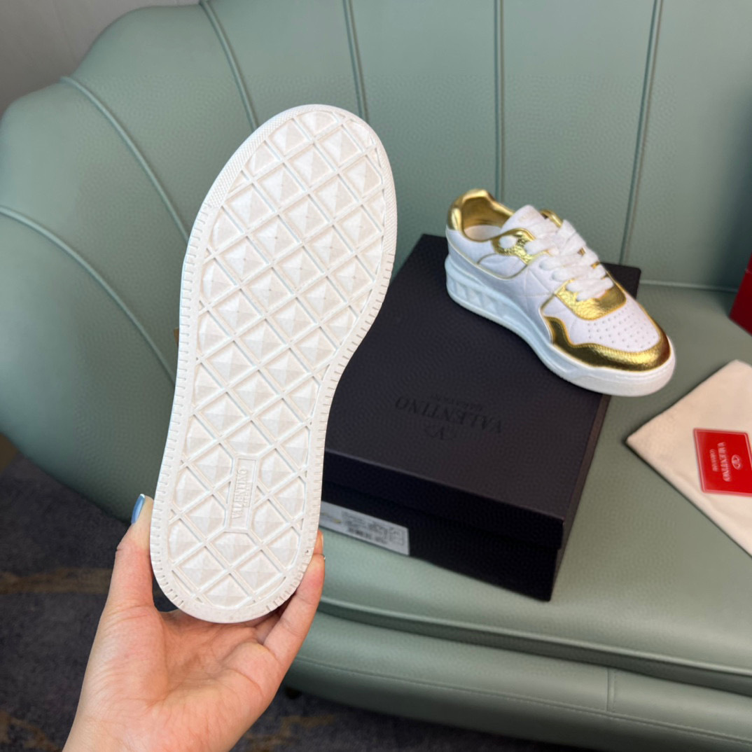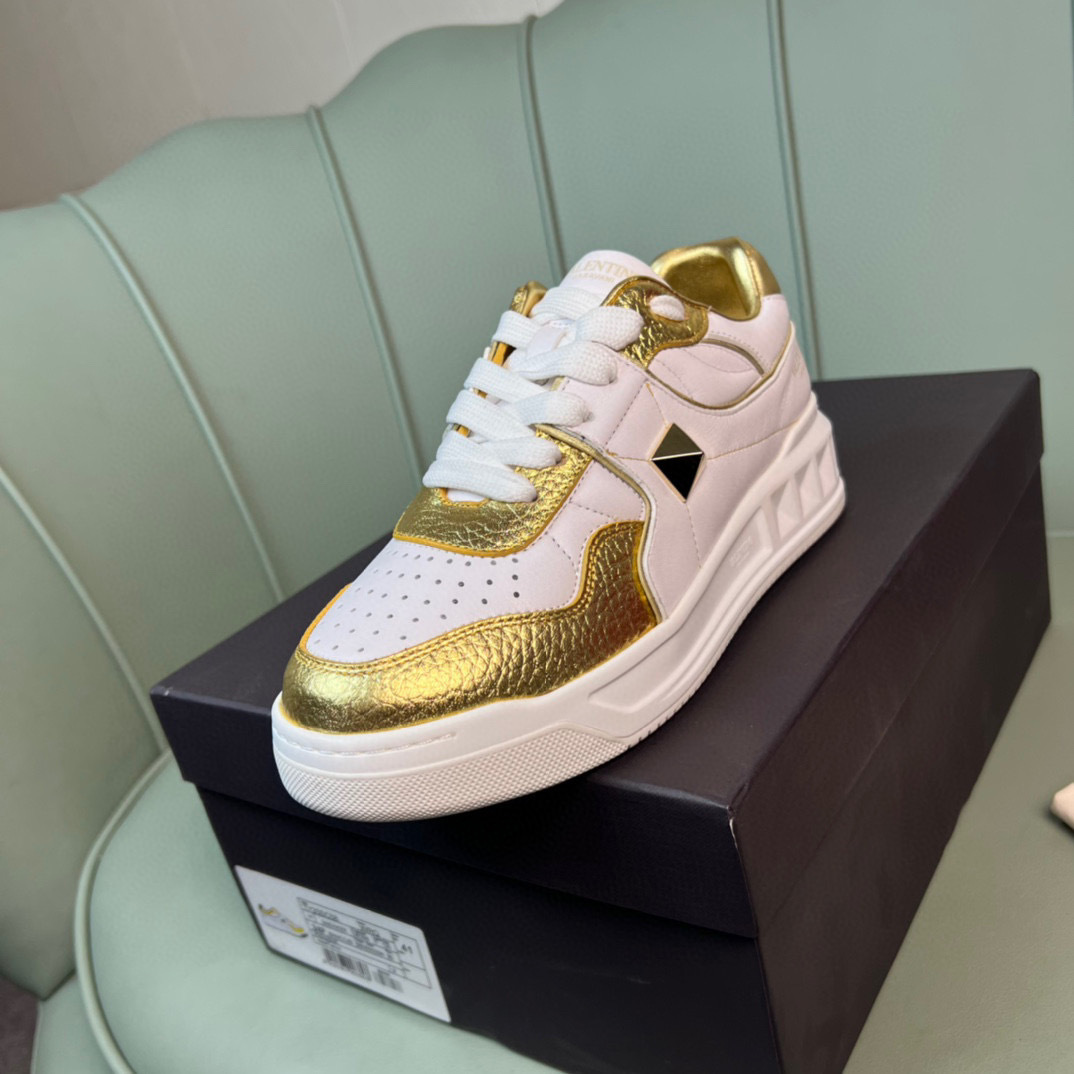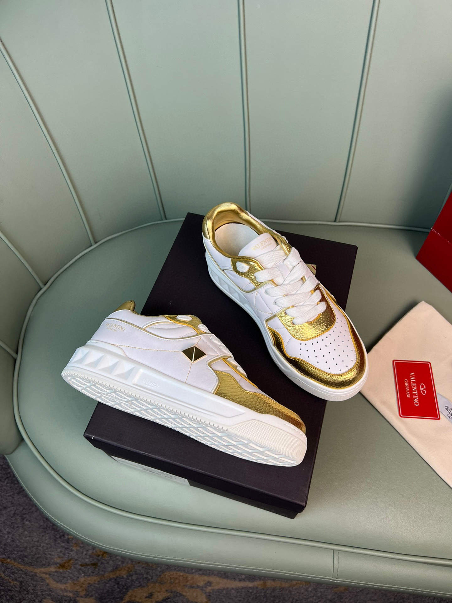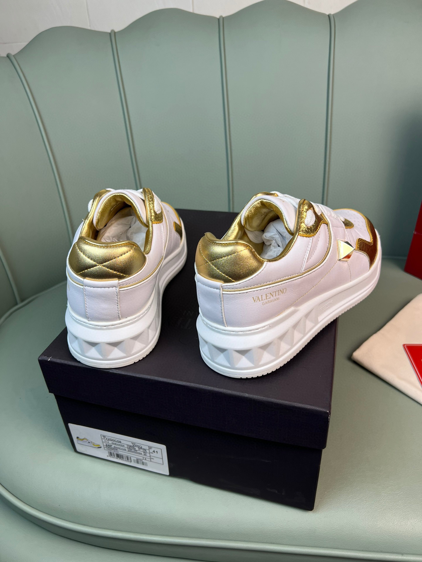 Step out in style with these Valentino couples sneakers, designed for both comfort and fashion. The sneakers feature a sleek white base with eye-catching gold accents, making them perfect for casual outings or special occasions.