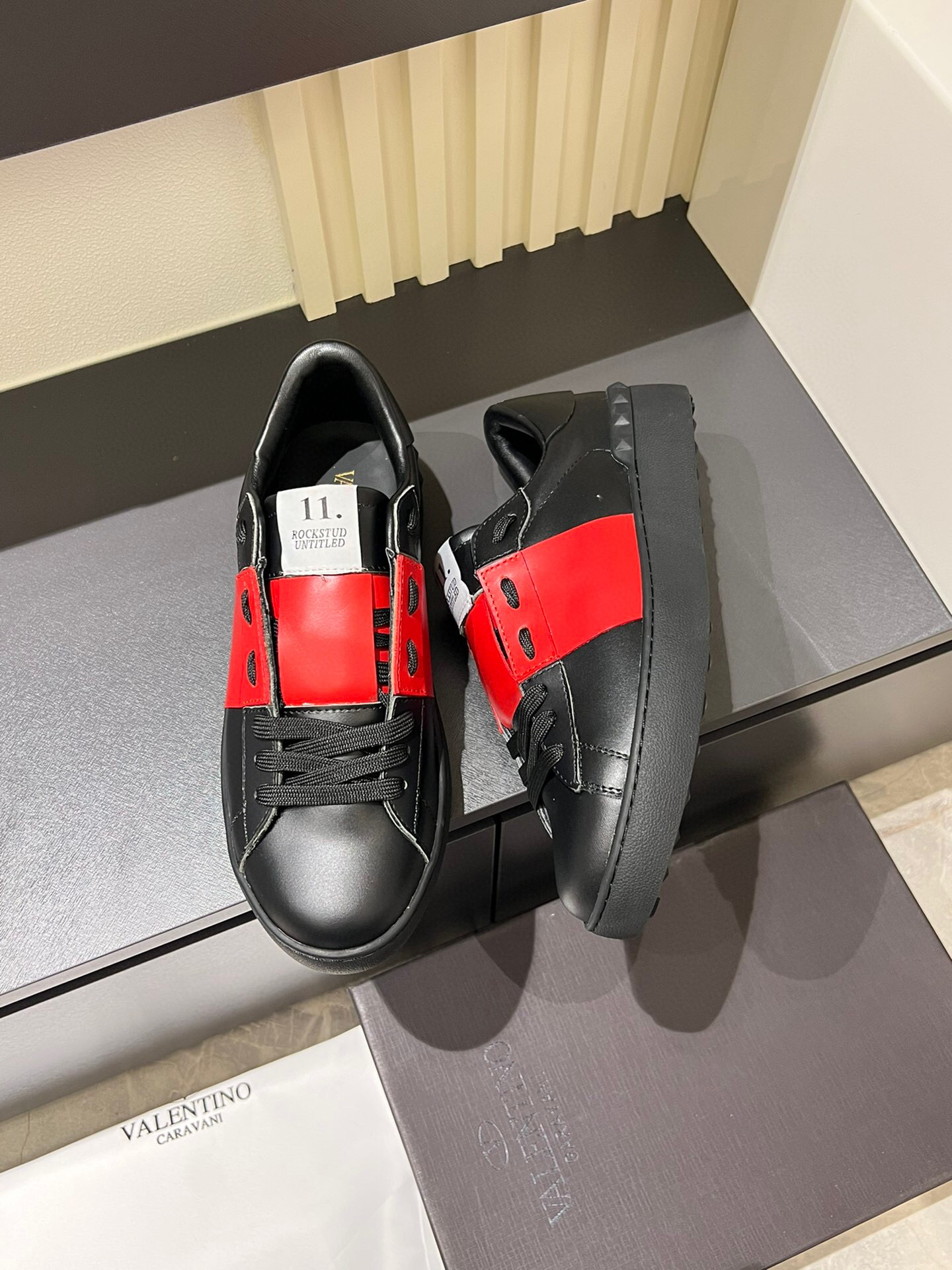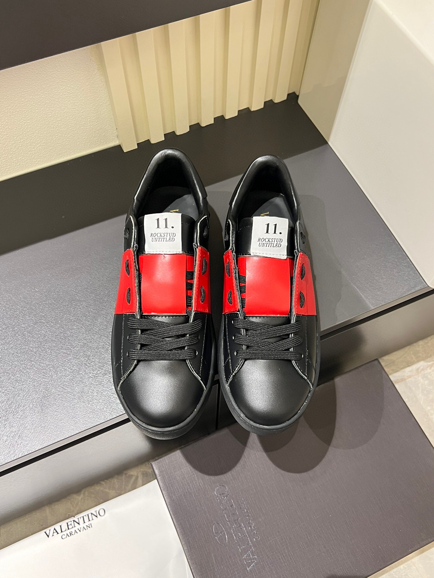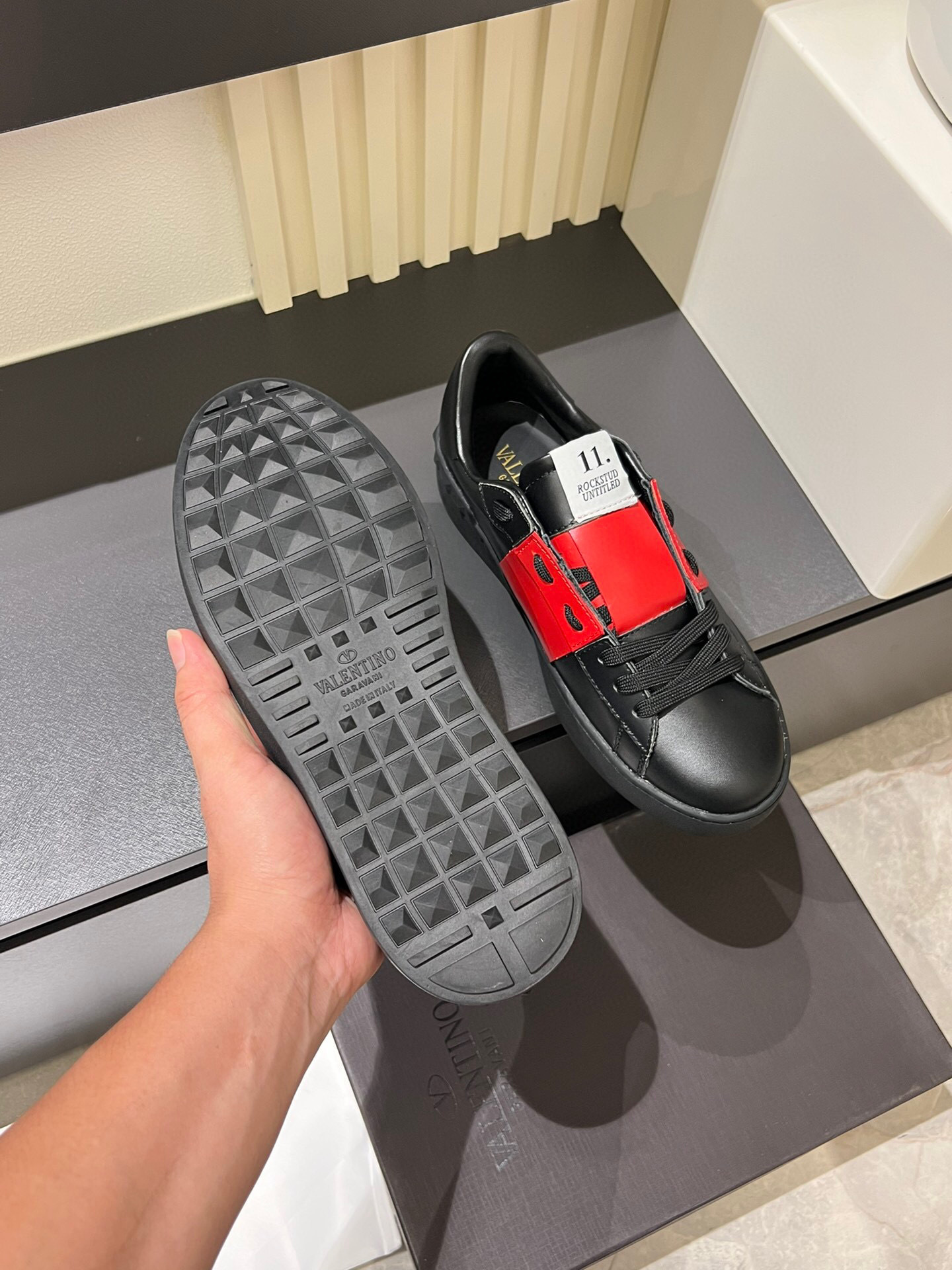 Step into luxury with the Valentino Rockstud Untitled Sneakers, designed for those who appreciate high fashion and comfort. These sneakers feature a bold black and red color scheme, making them a standout addition to any wardrobe.