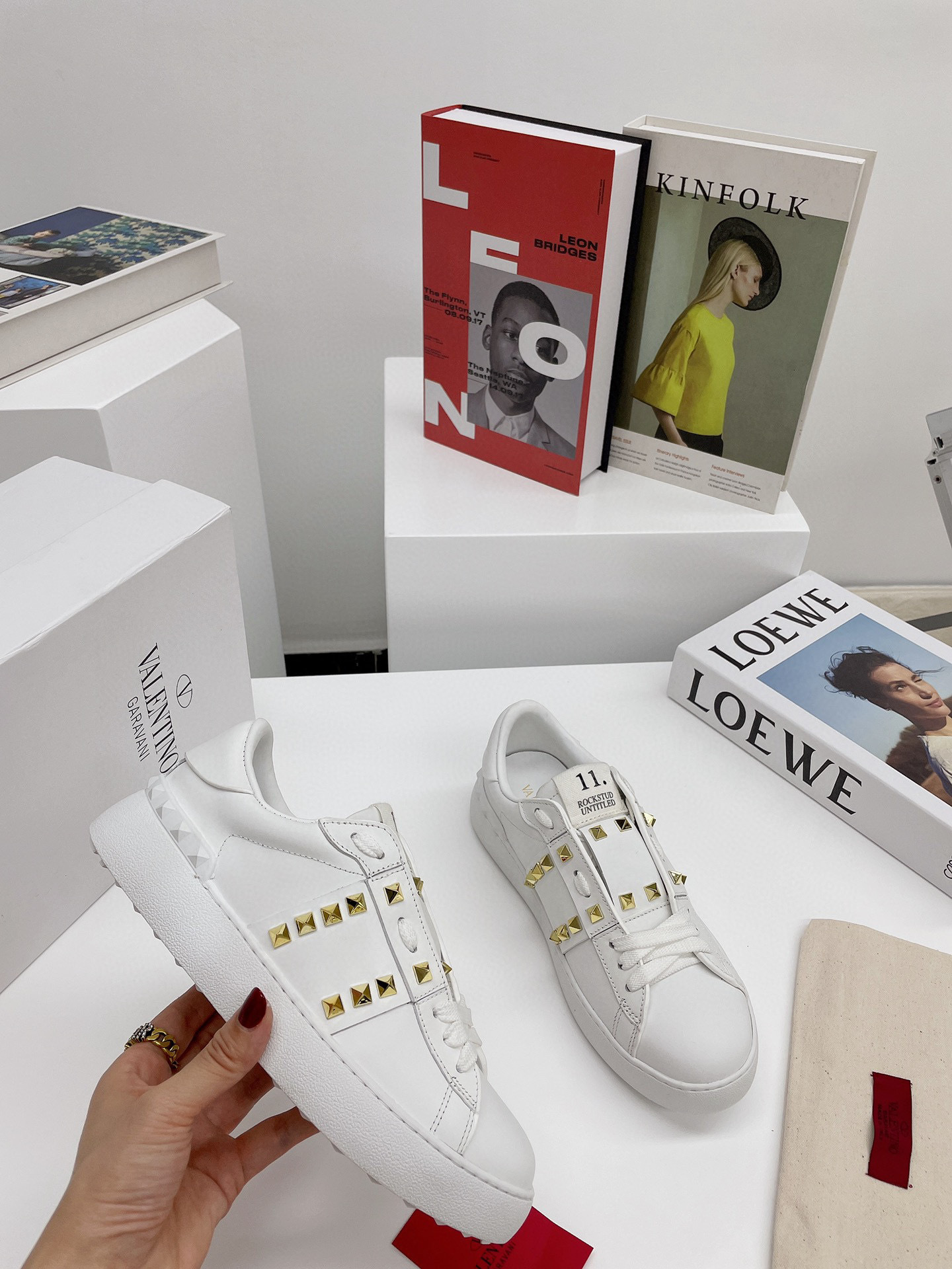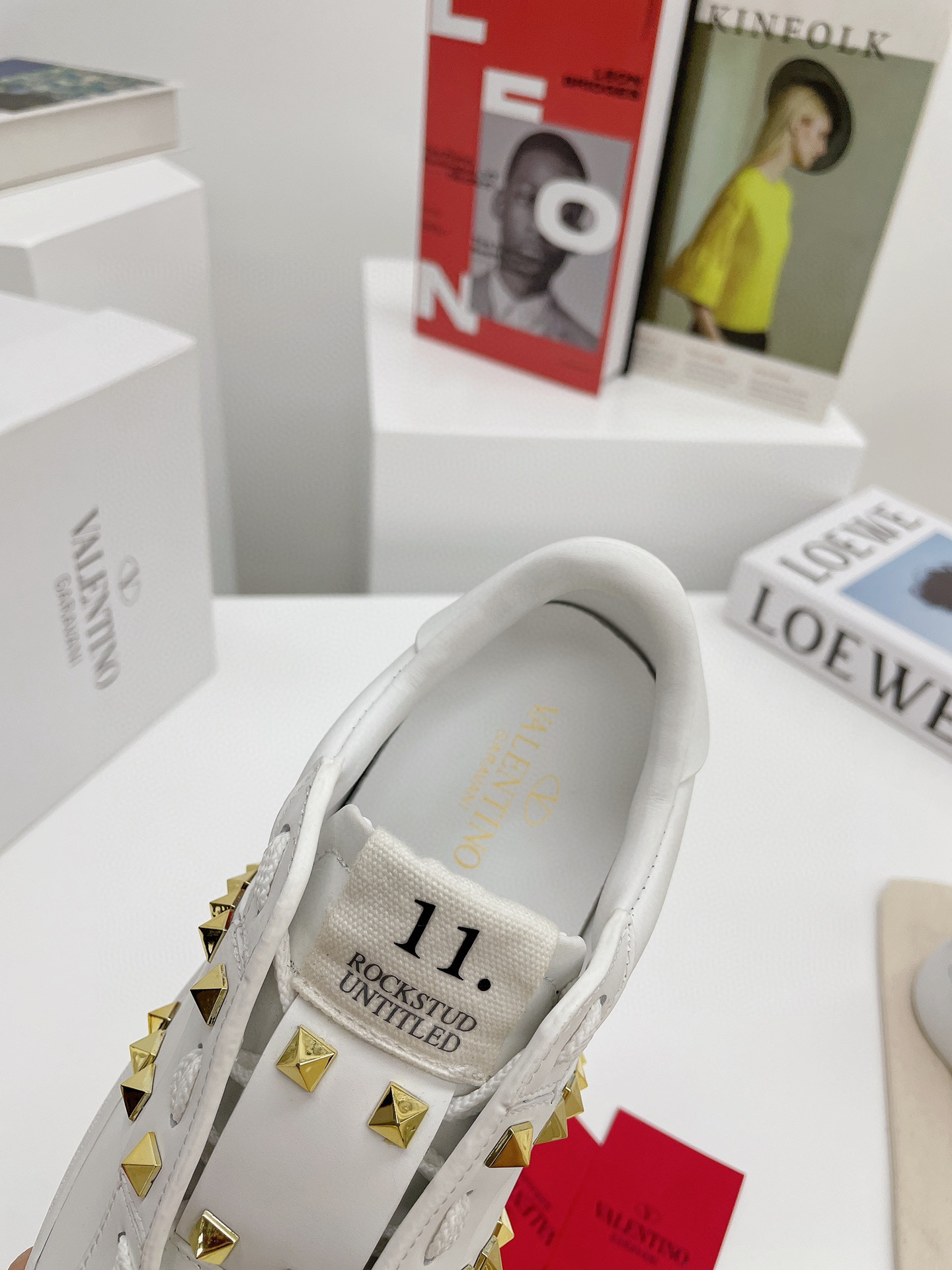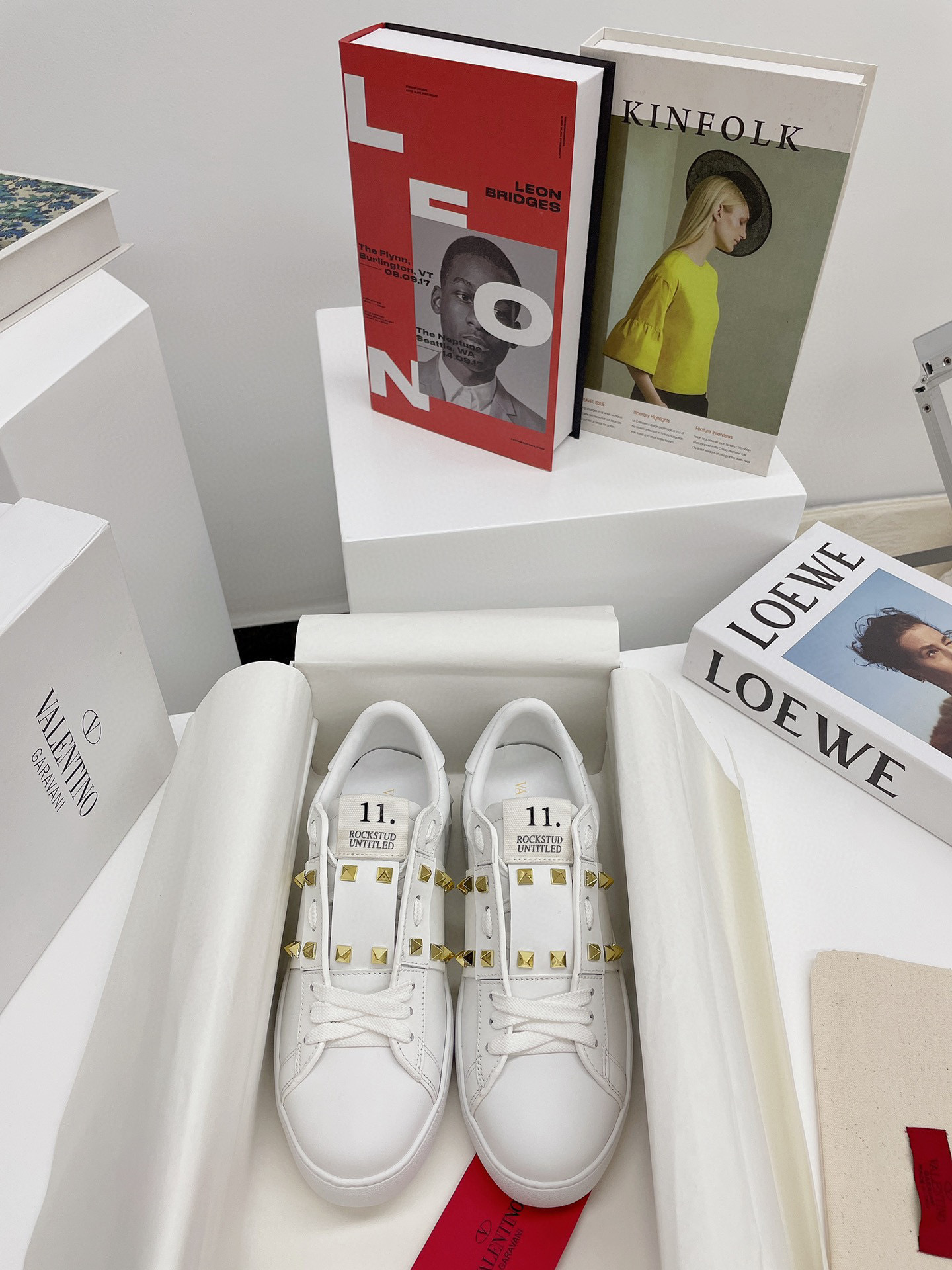 Step into luxury with the Valentino Rockstud Untitled Sneakers, designed for both comfort and style. These sneakers feature a classic white leather exterior adorned with signature gold-tone studs, adding a touch of elegance to any outfit.