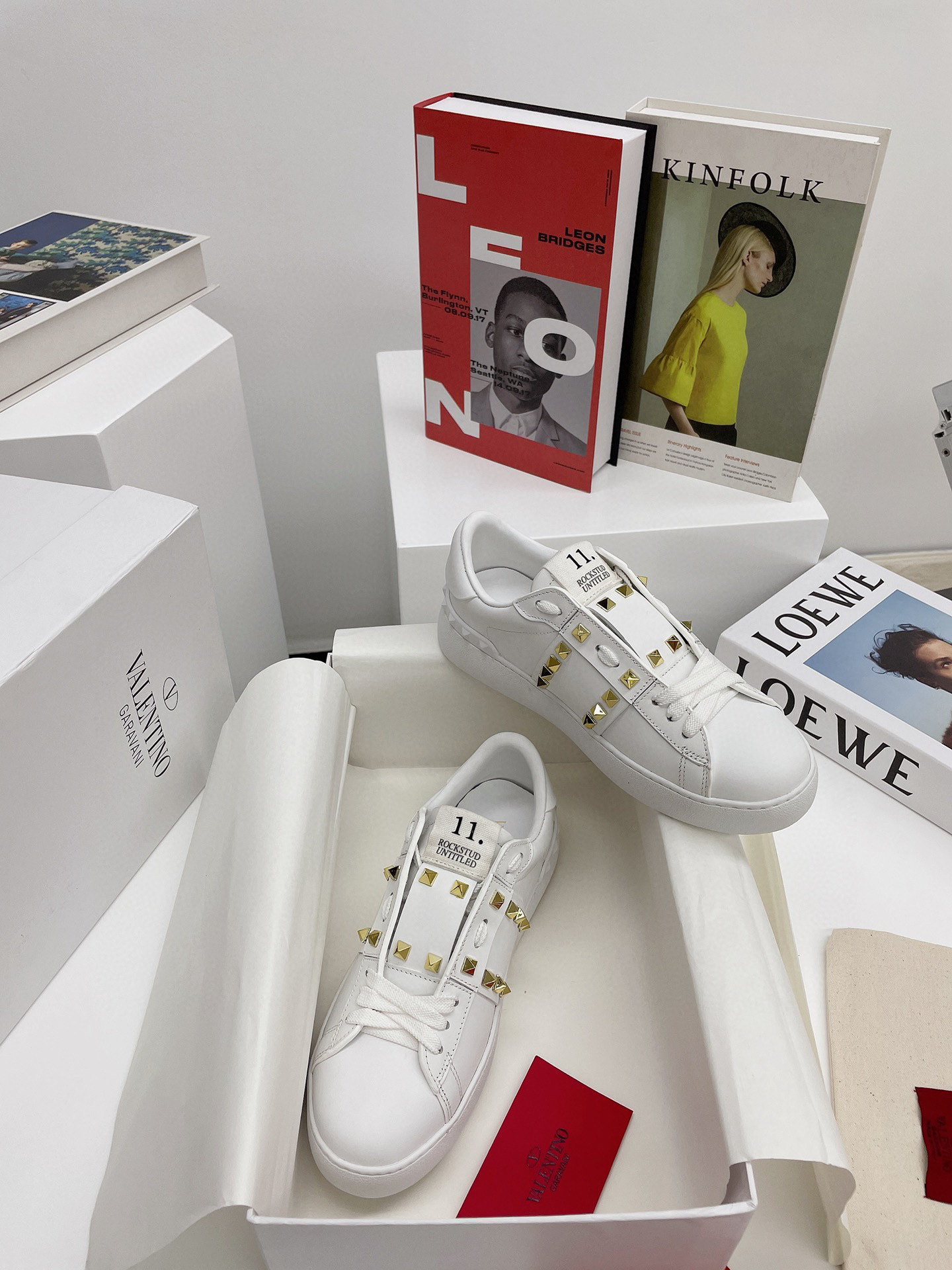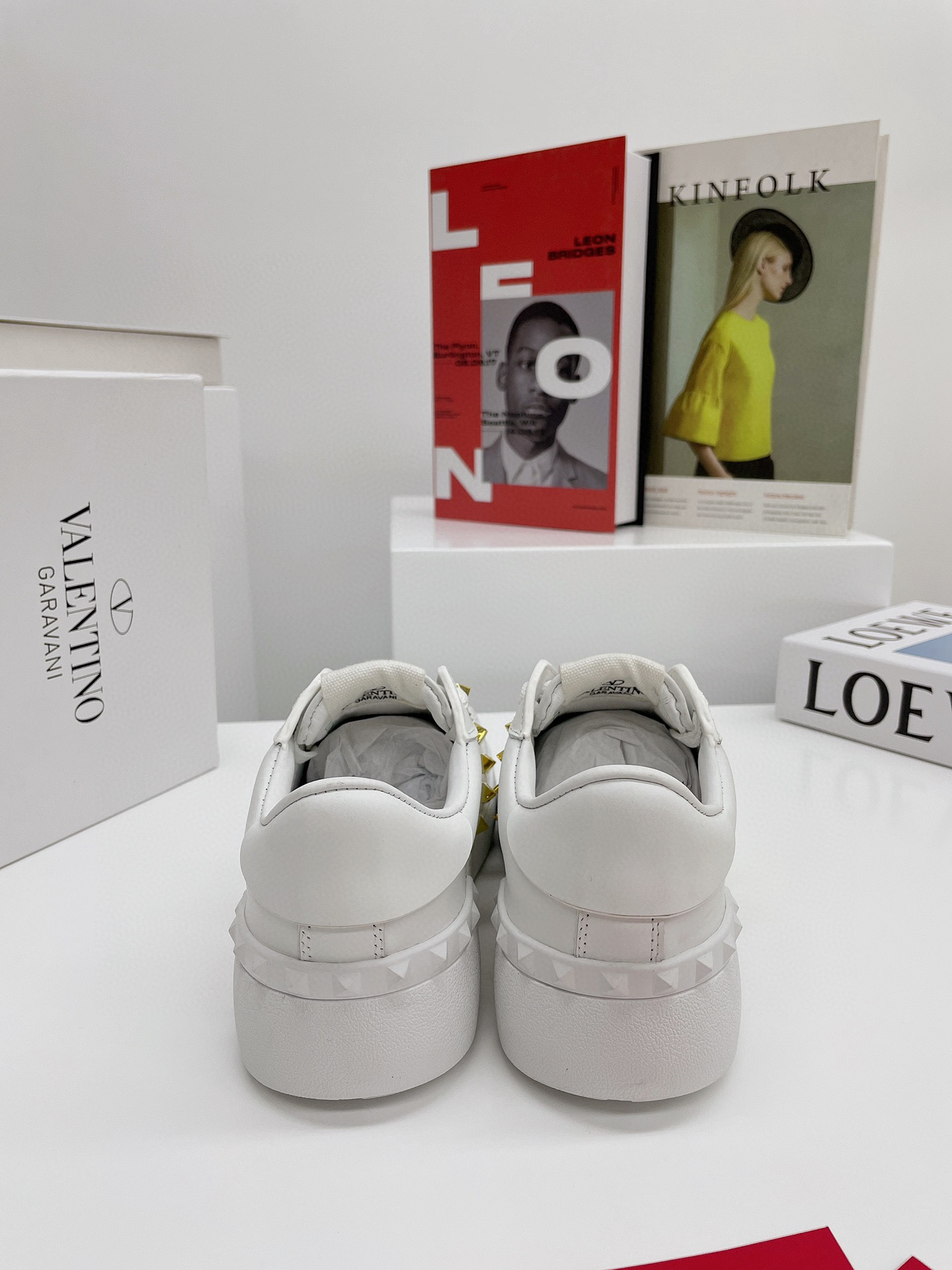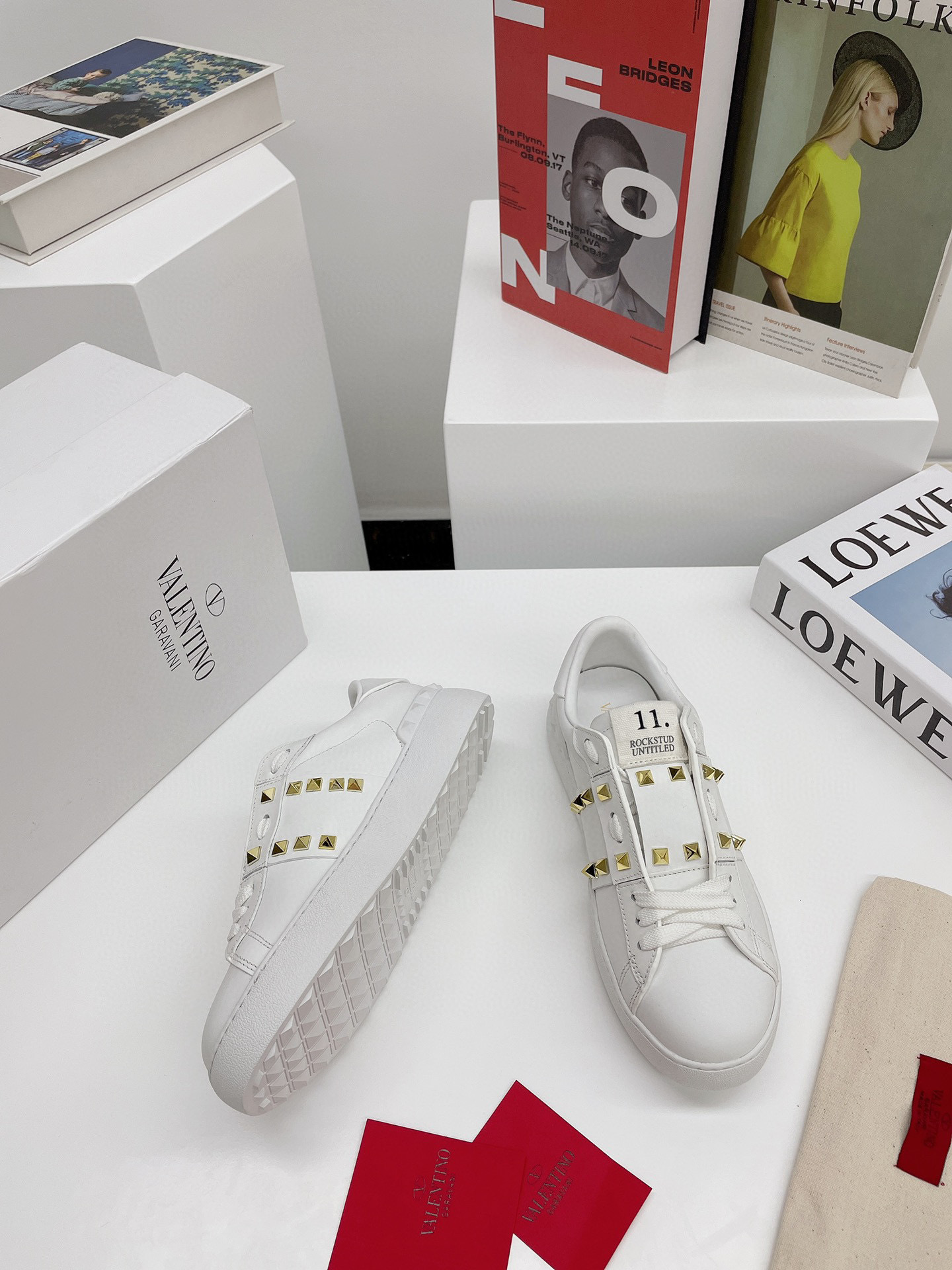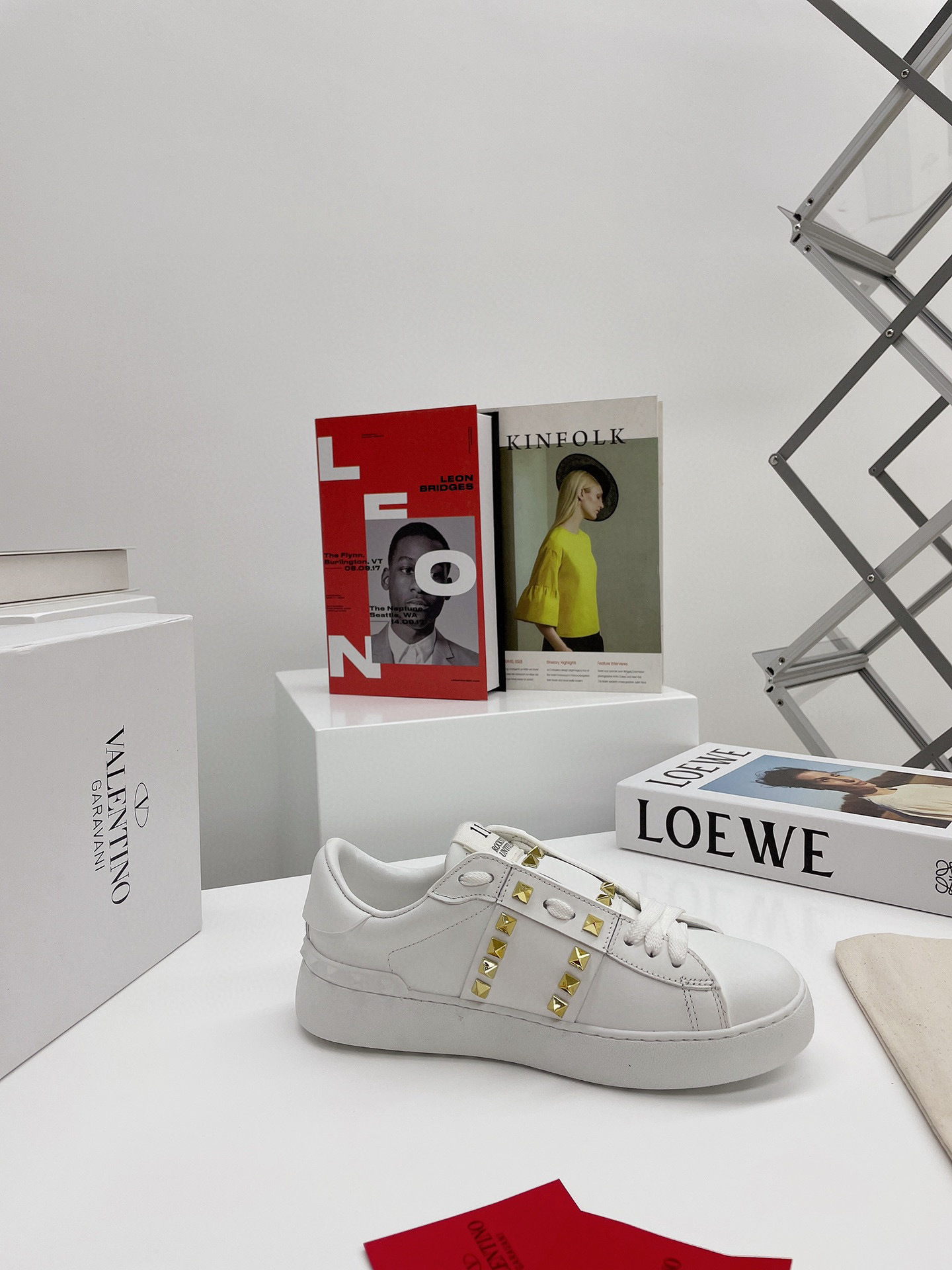 Step into luxury with the Valentino Rockstud Untitled Sneakers, designed for both comfort and style. These sneakers feature a classic white leather exterior adorned with signature gold-tone studs, adding a touch of elegance to any outfit.