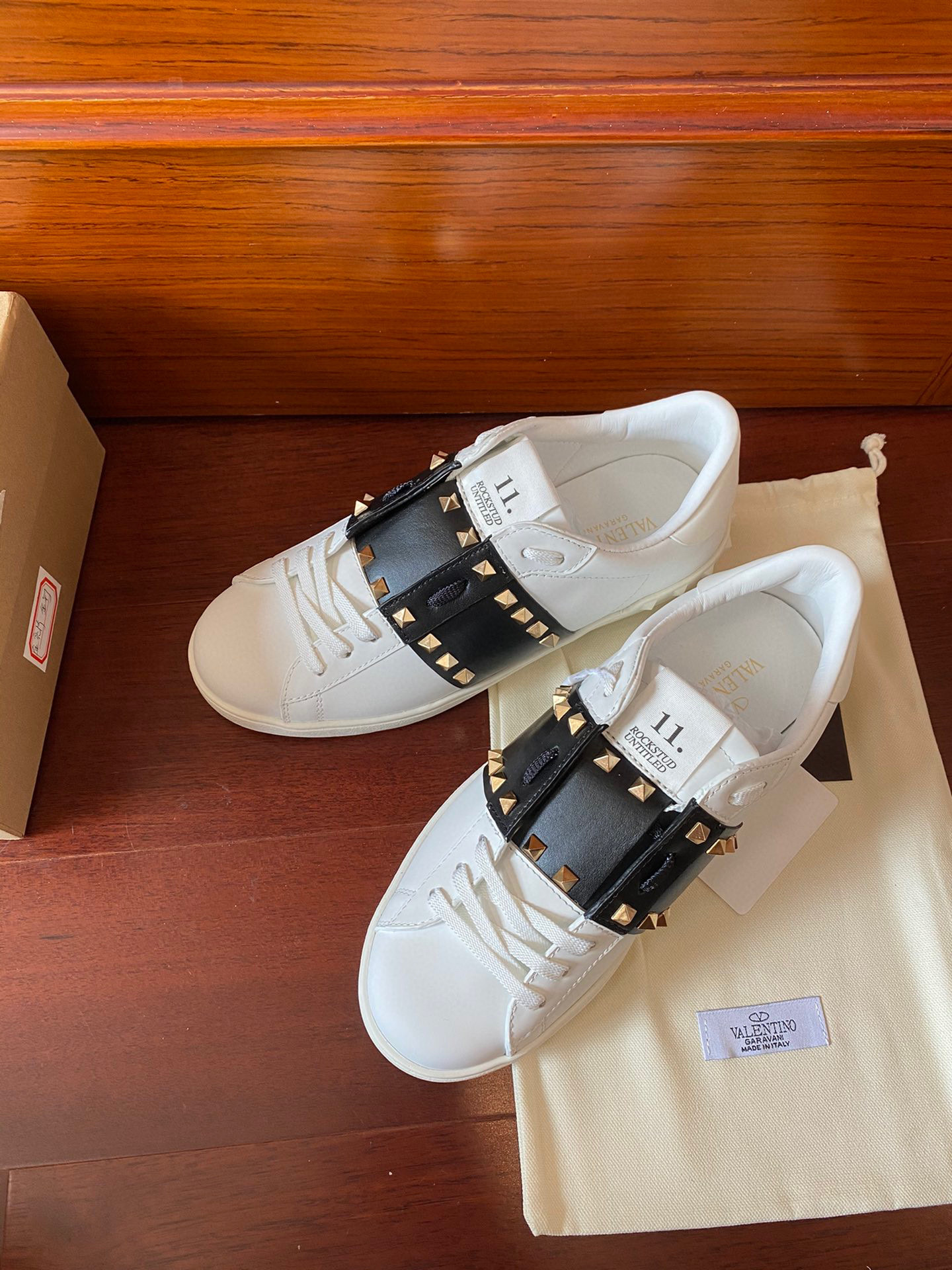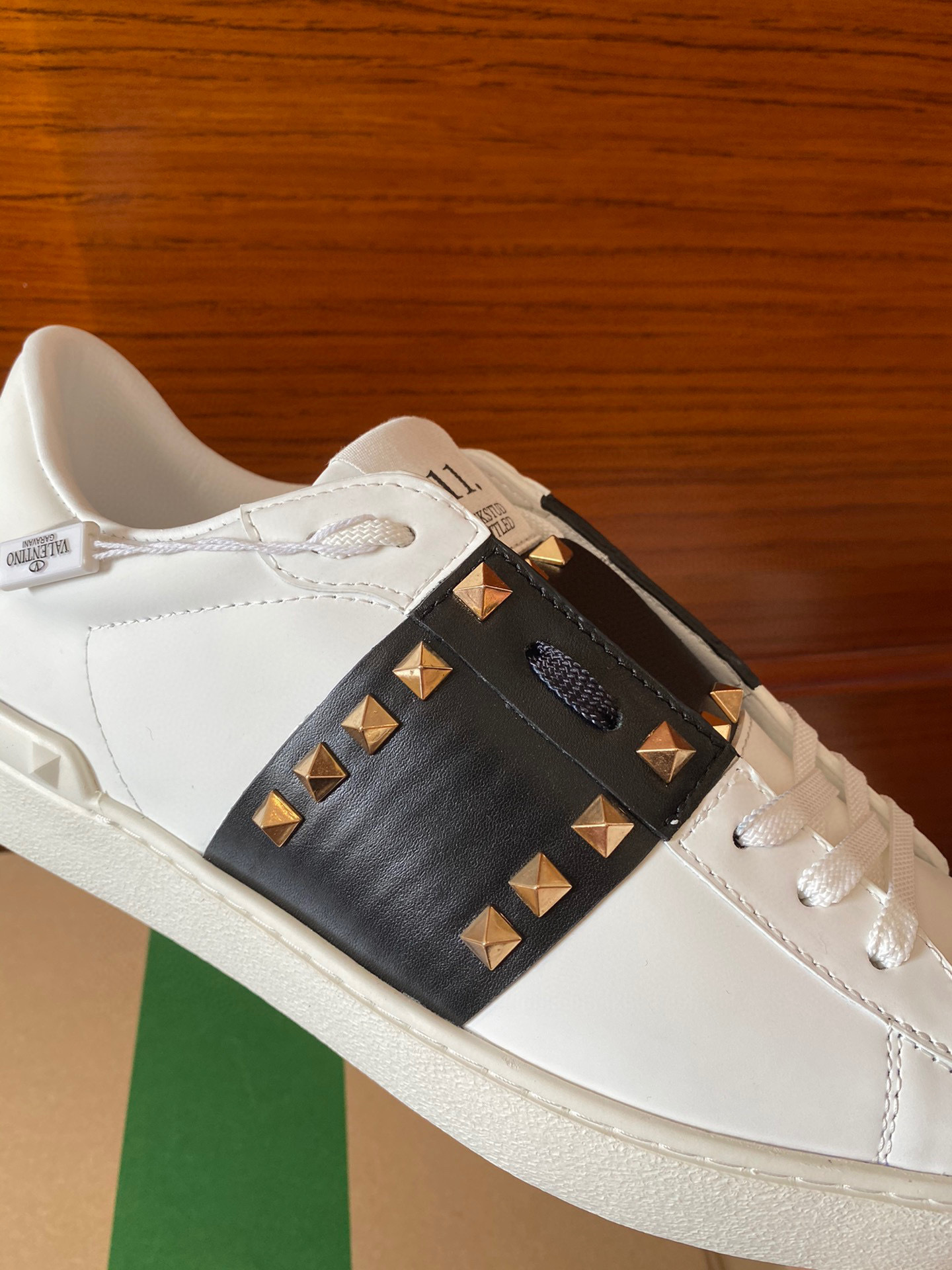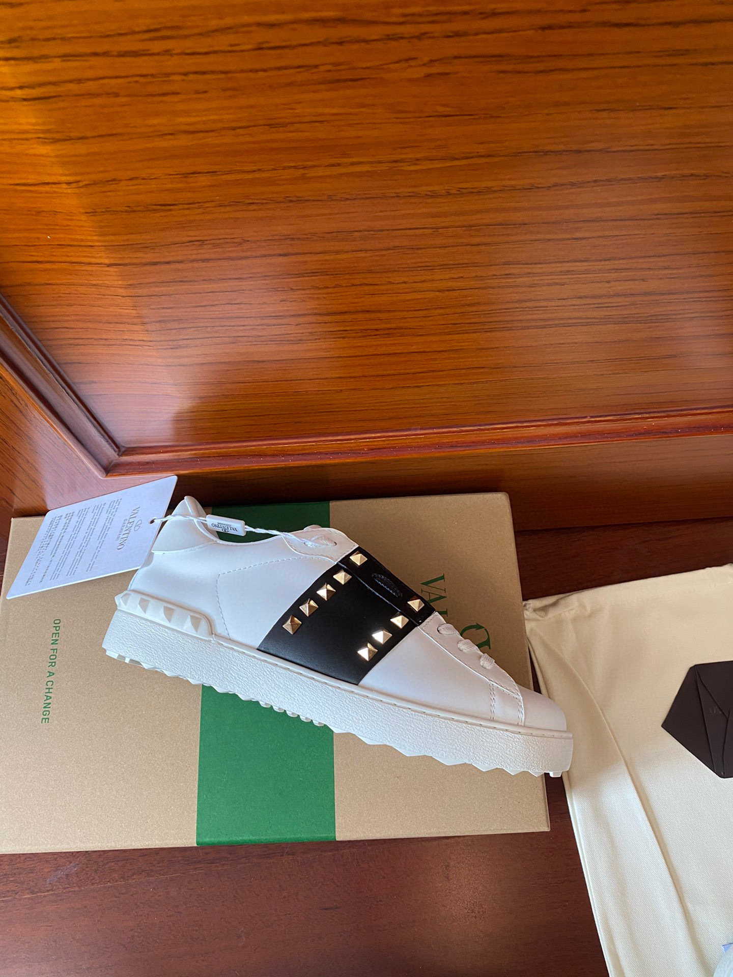 Elevate your footwear collection with these Valentino unisex sneakers, available in sizes 35-44. Designed with a sleek white base, these shoes are accented by a bold black strap adorned with signature studs, making them a standout piece for any outfit.