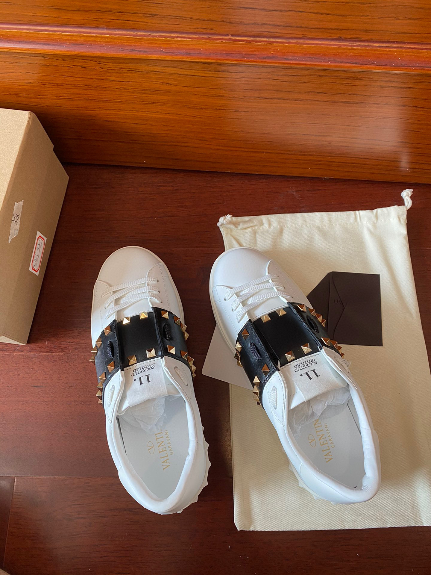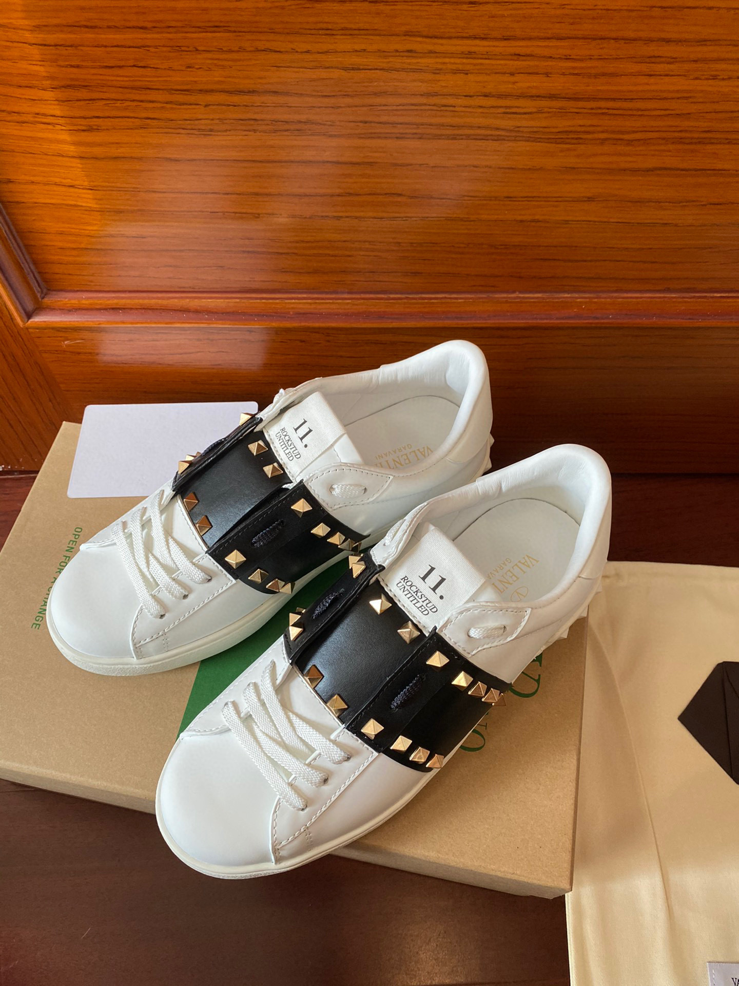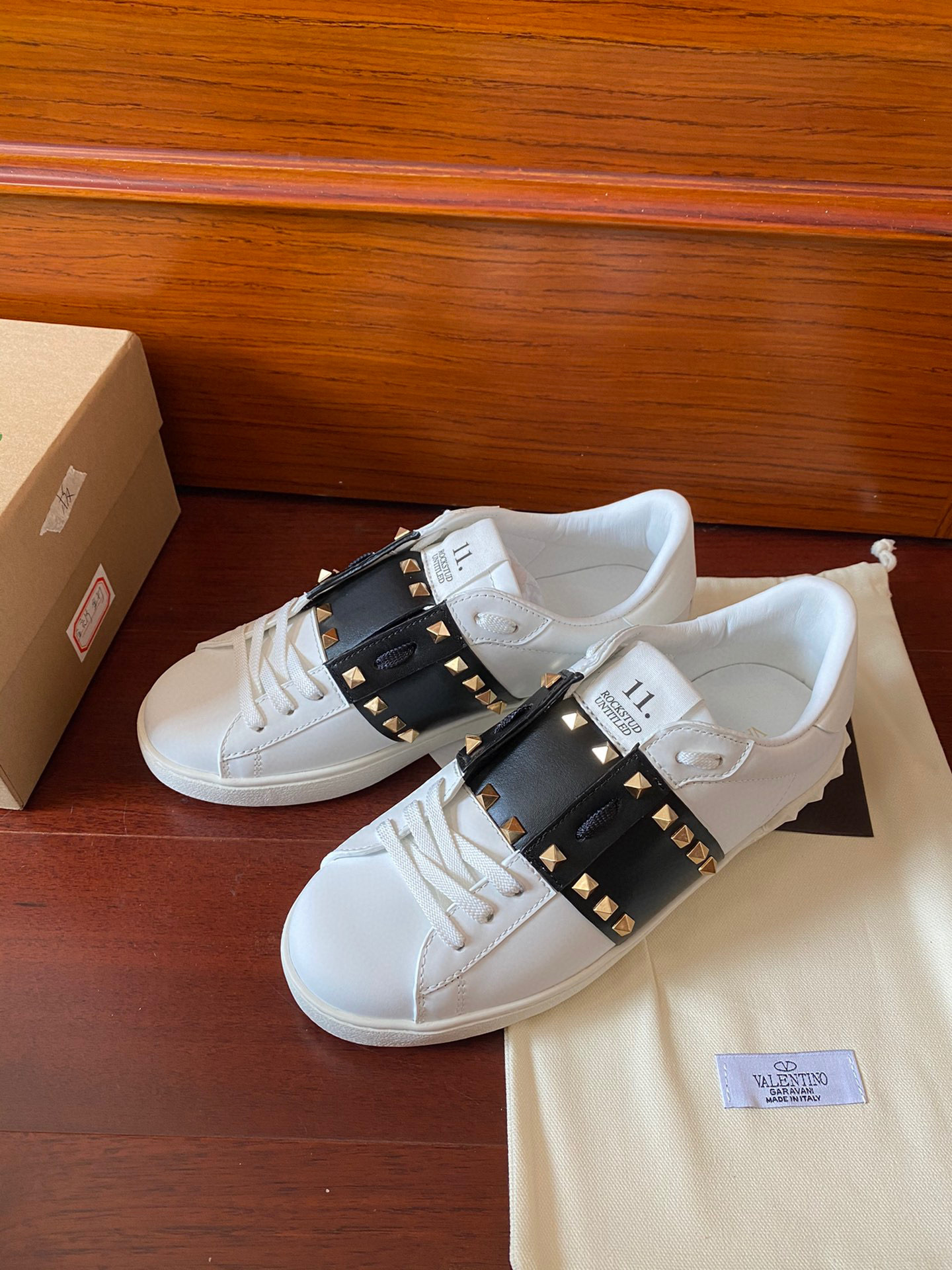 Elevate your footwear collection with these Valentino unisex sneakers, available in sizes 35-44. Designed with a sleek white base, these shoes are accented by a bold black strap adorned with signature studs, making them a standout piece for any outfit.