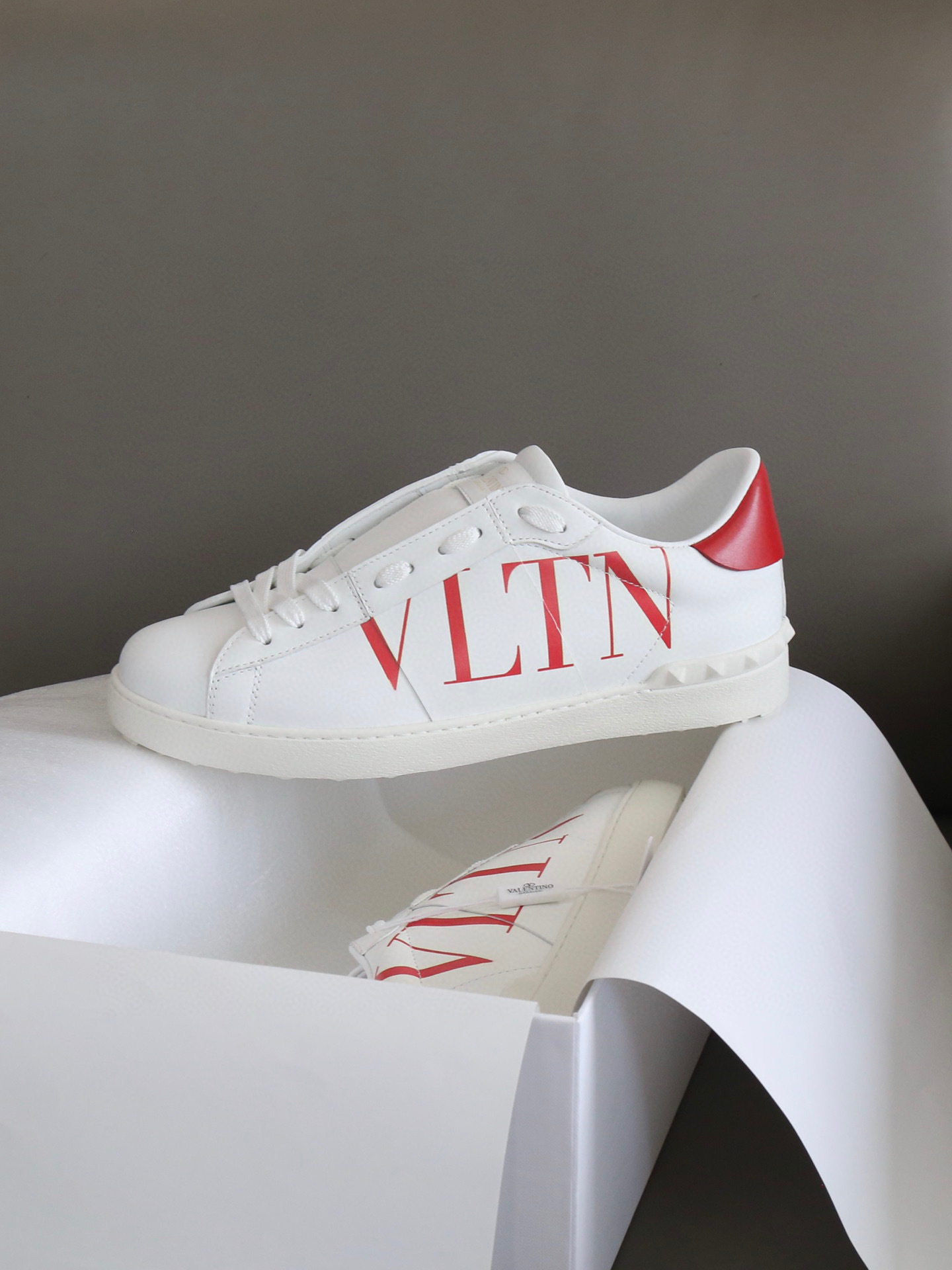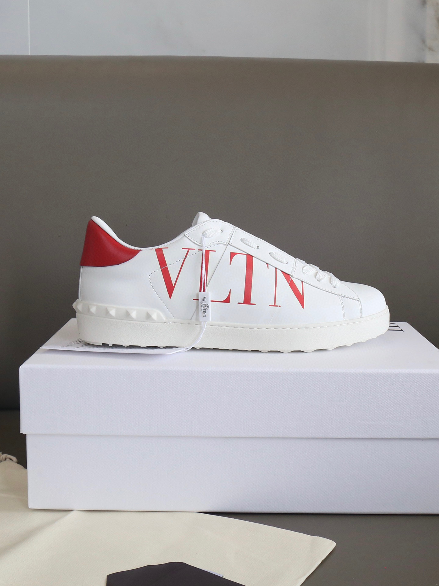 Step out in style with the Valentino VLTN Couples Sneakers, designed for both comfort and fashion. These sneakers showcase a striking white base with a vibrant red heel and a prominent VLTN logo, making them a perfect addition to any wardrobe.