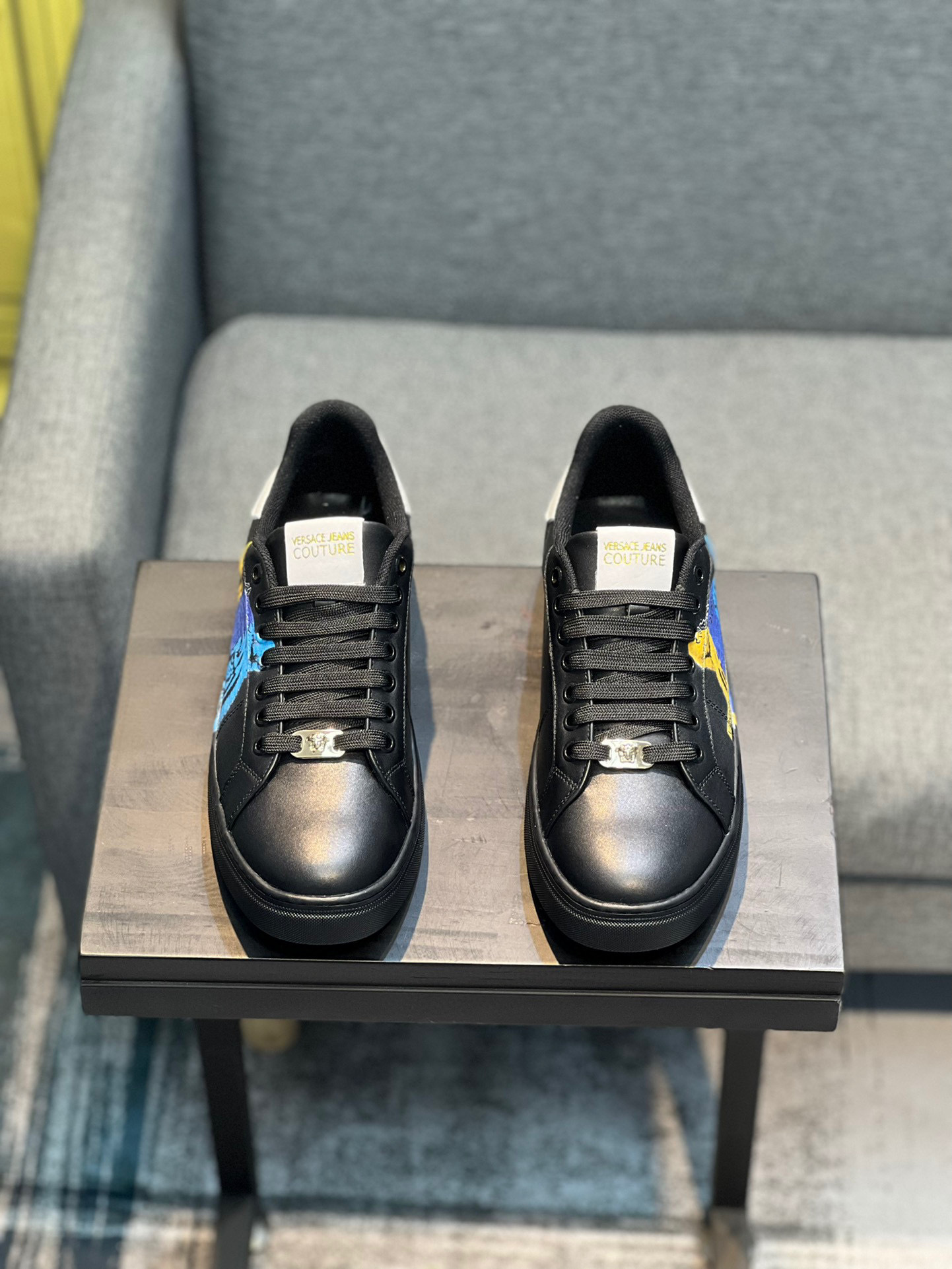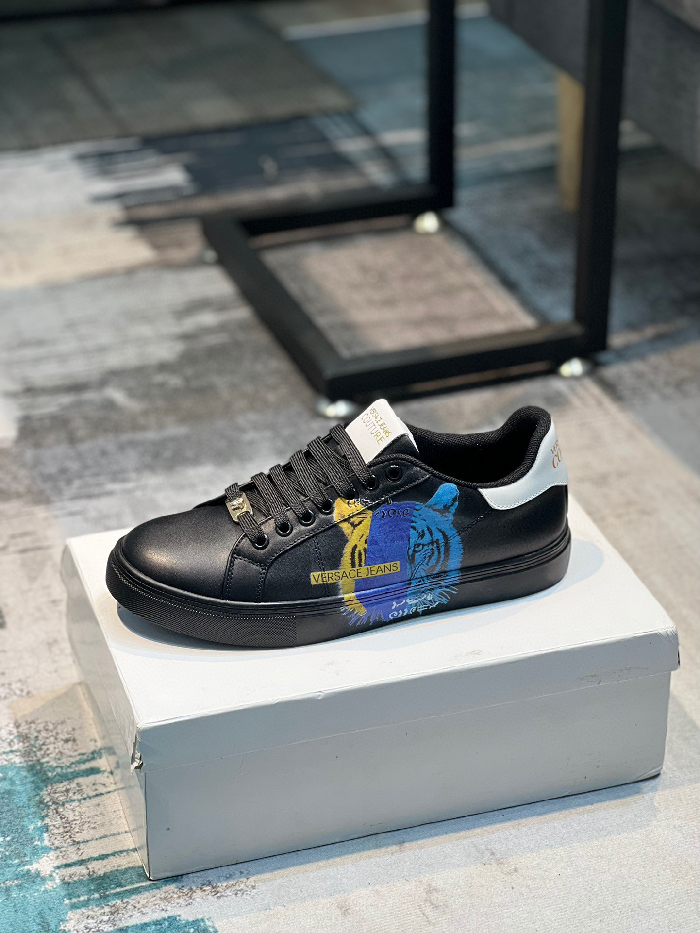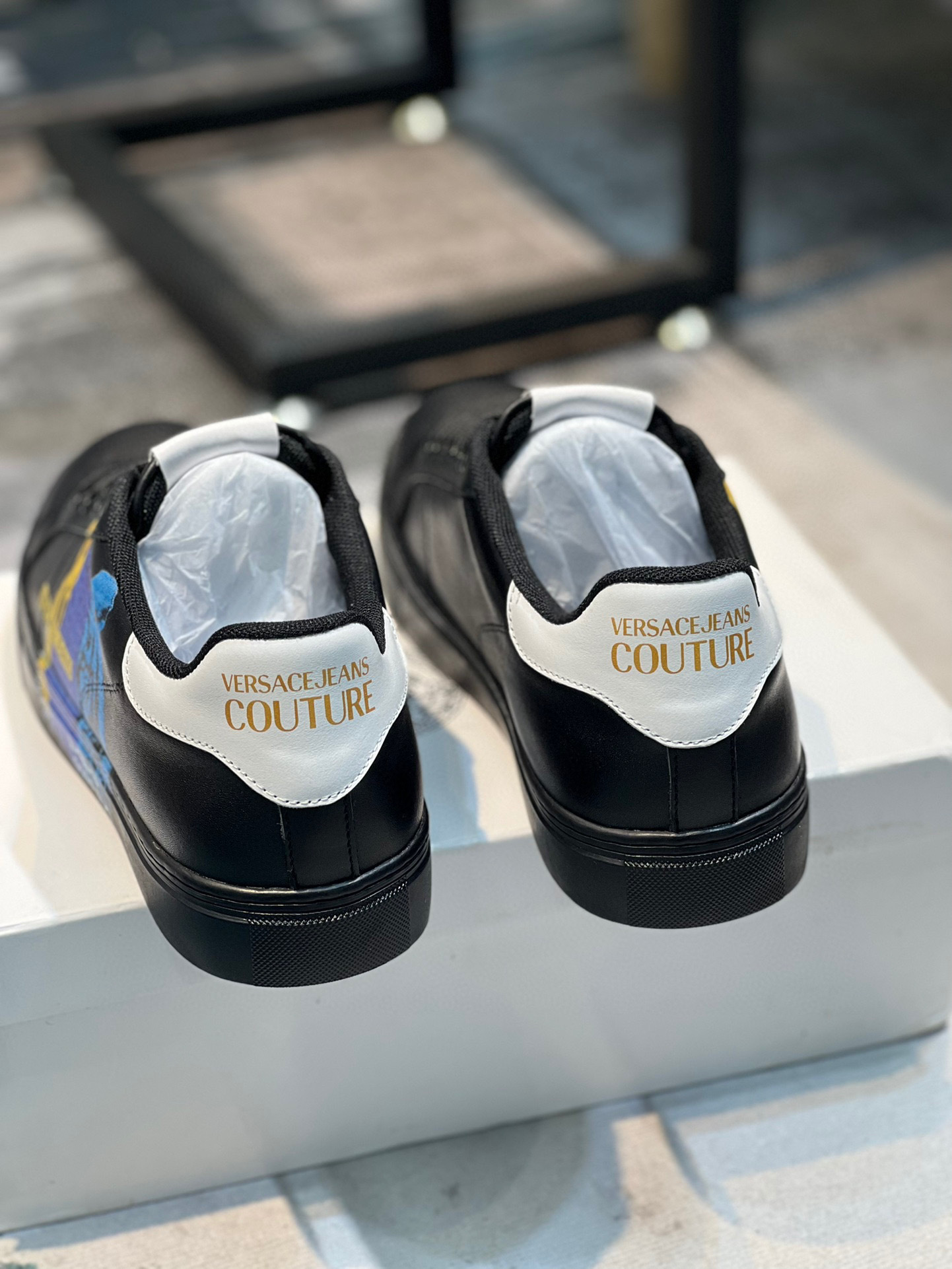 Step out in style with these Versace casual shoes, available in sizes 38-44. The shoes boast a sleek black design complemented by vibrant artistic accents, making them a standout addition to your wardrobe.