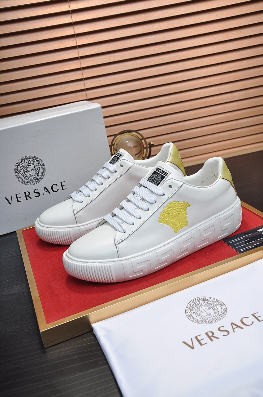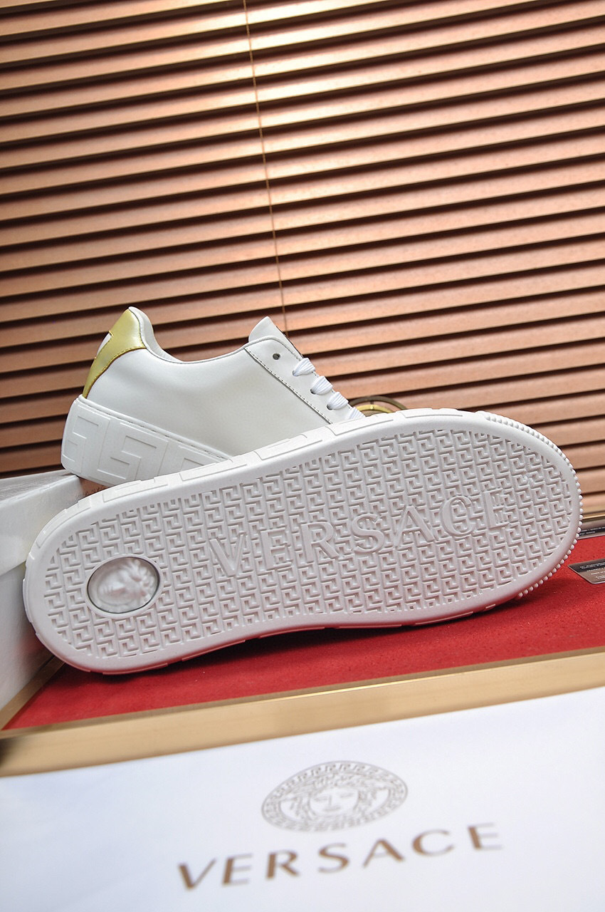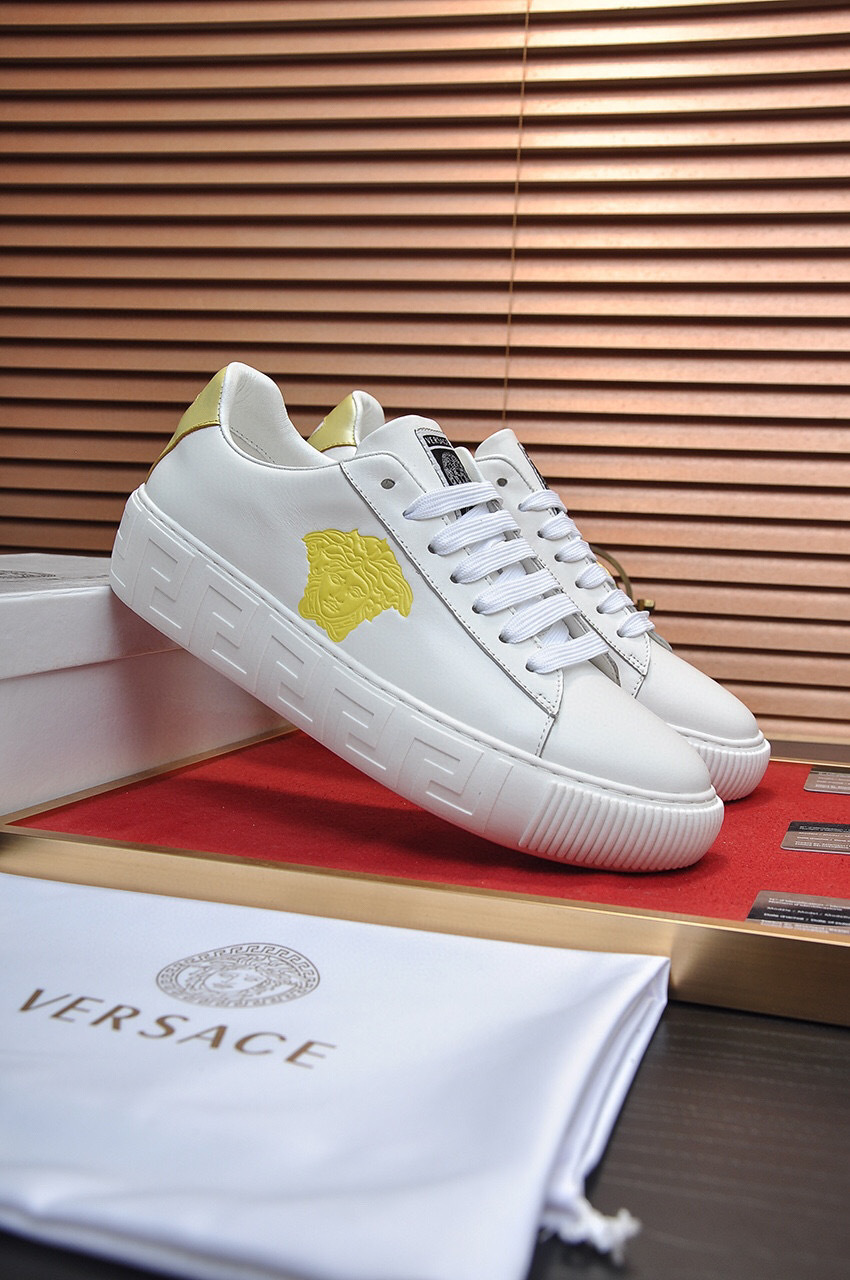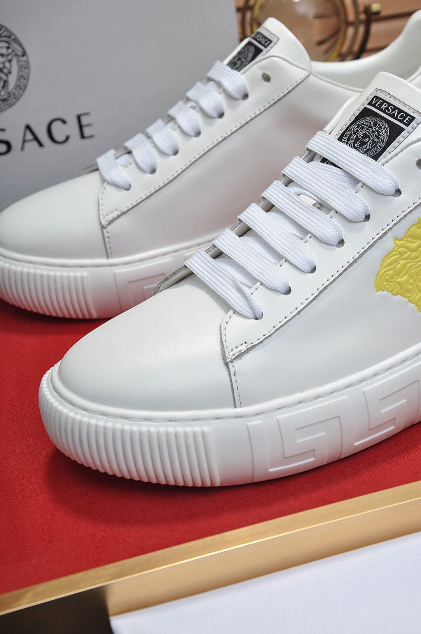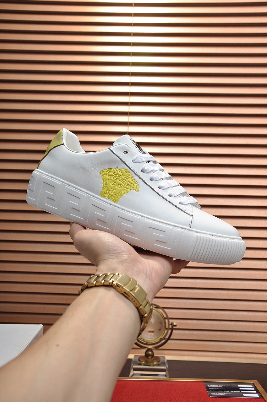 The design features a prominent gold Medusa emblem and elegant gold accents, making them a standout addition to any wardrobe. The durable sole ensures long-lasting wear, while the classic white color adds versatility to your outfits.