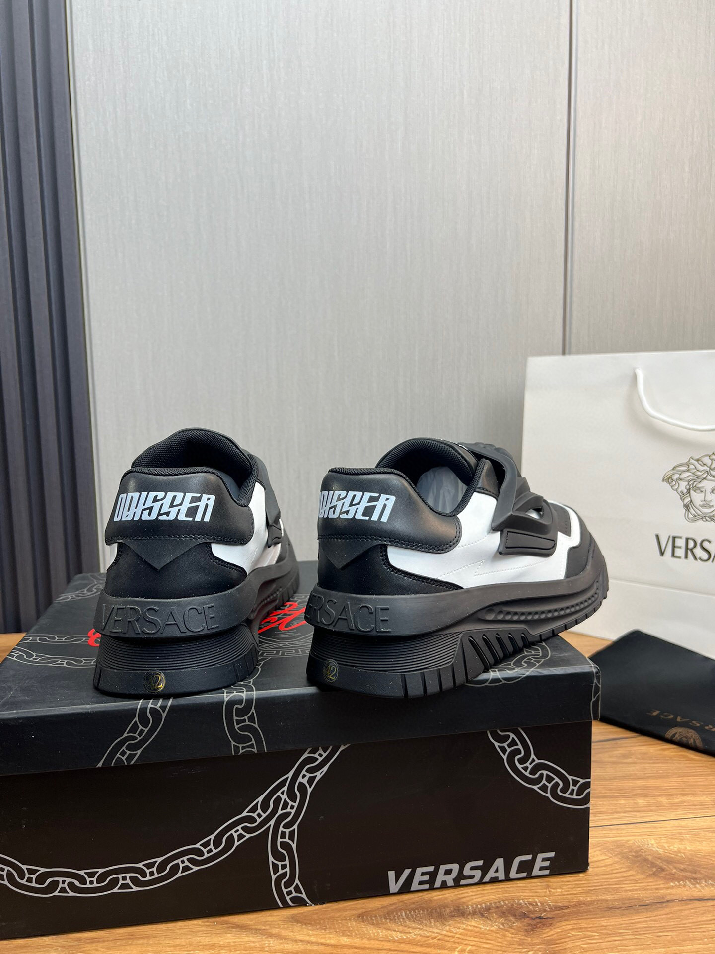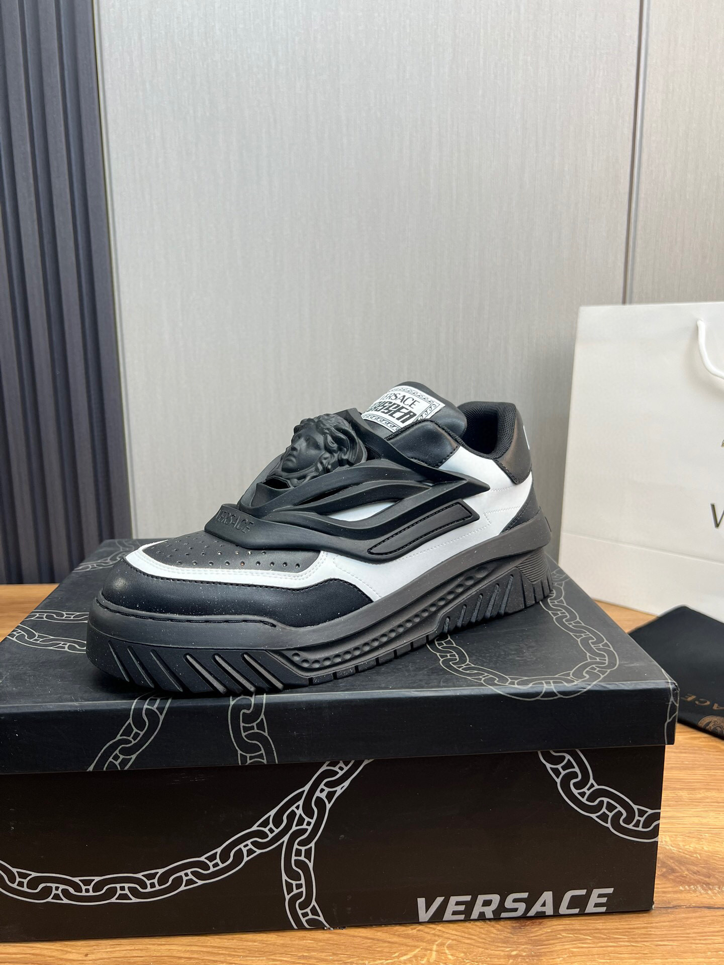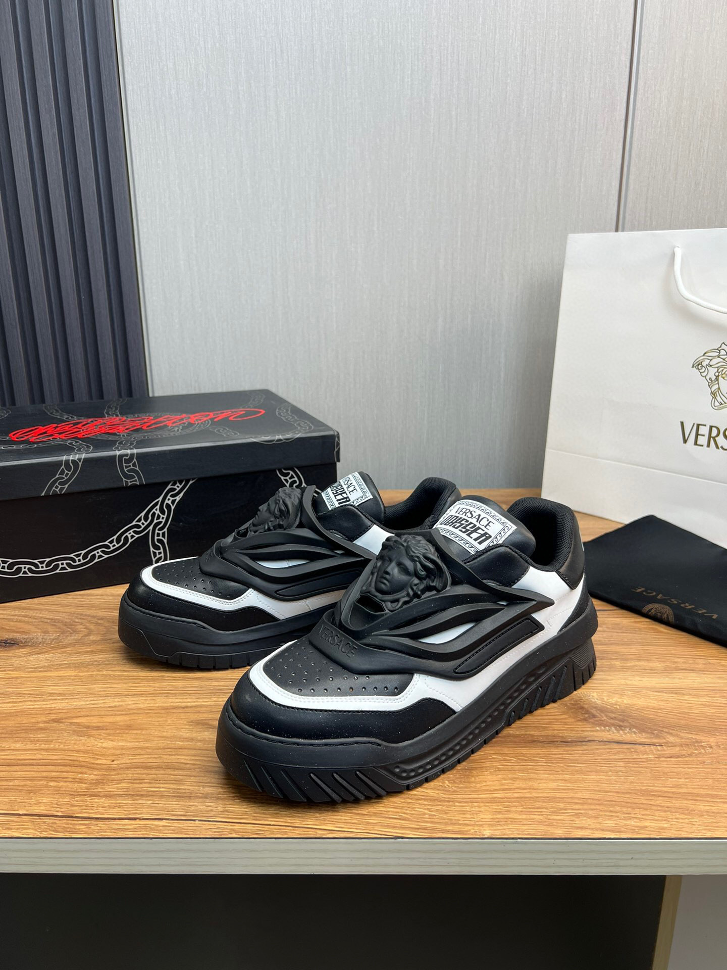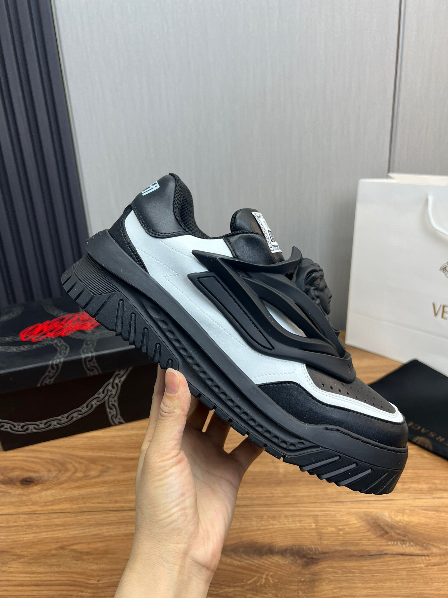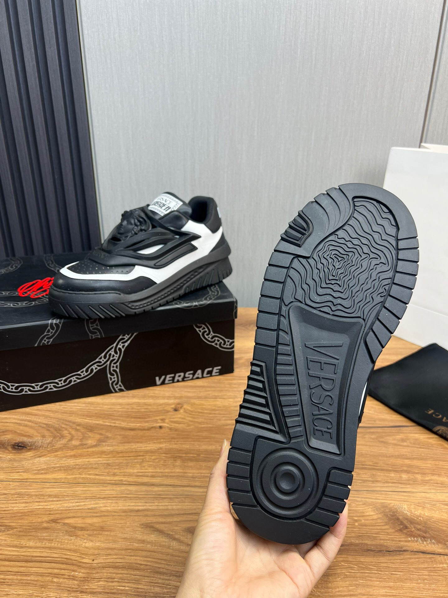 Step into luxury with the Versace Casual Sneakers, designed for both comfort and style. These sneakers feature a striking black and white color scheme, highlighted by the iconic Versace logo and lion head detail.
