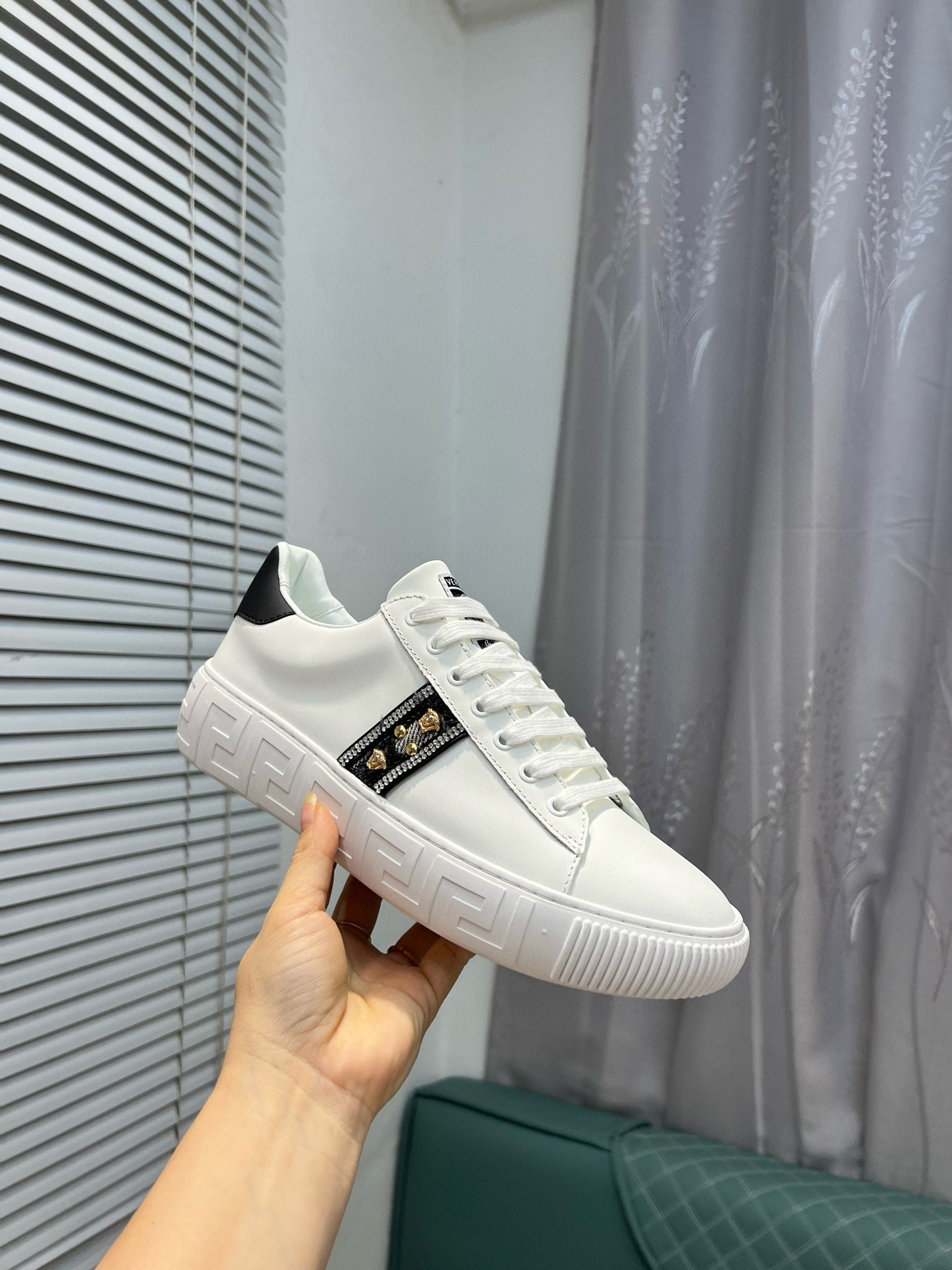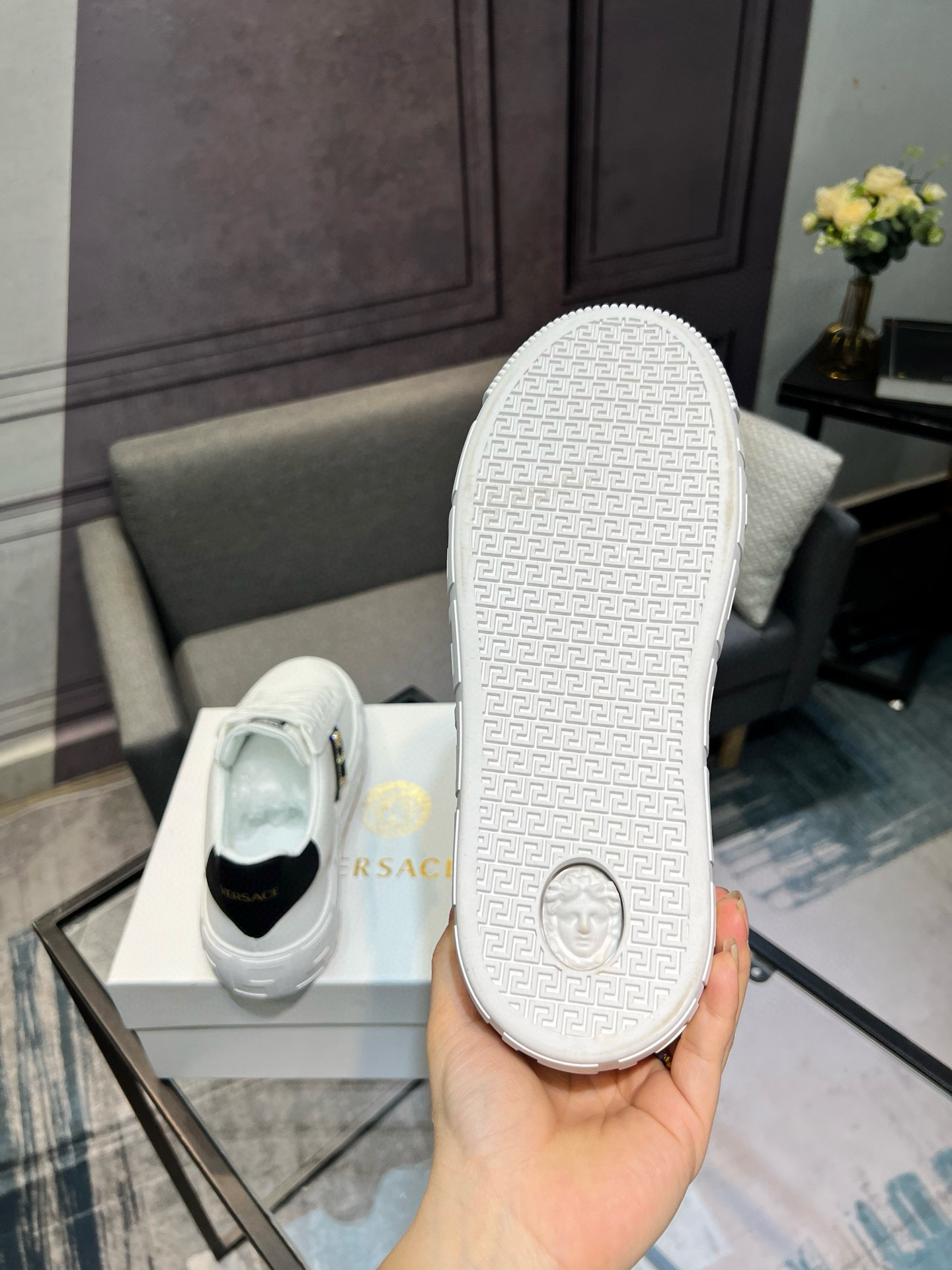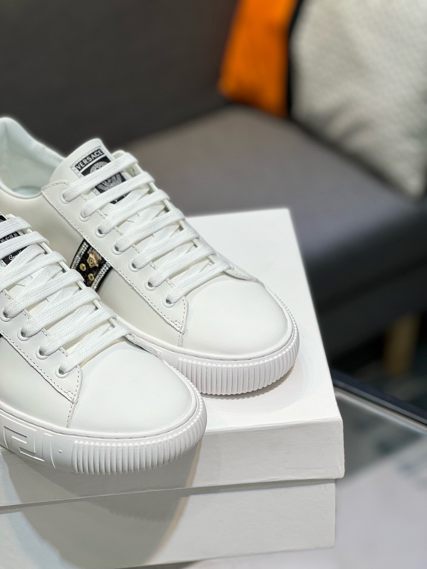 Step out in luxury with the Versace LYT310 casual sneakers. These stylish shoes feature a sleek white design complemented by a distinctive black accent, making them perfect for both casual and semi-formal occasions.