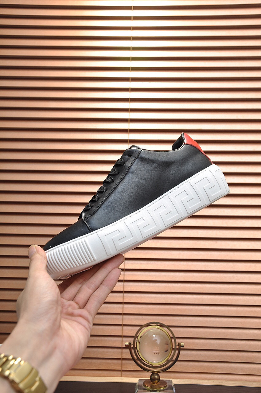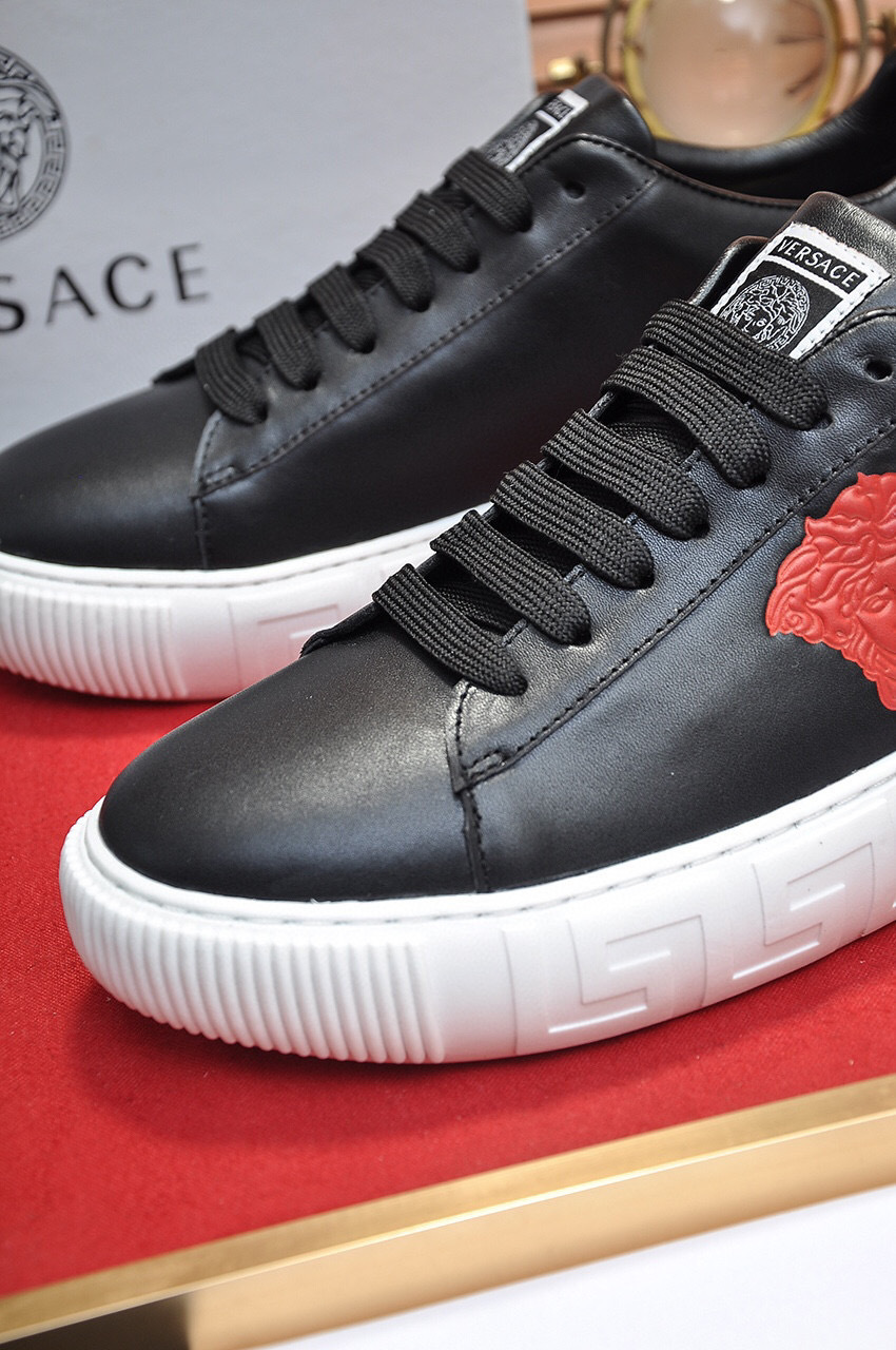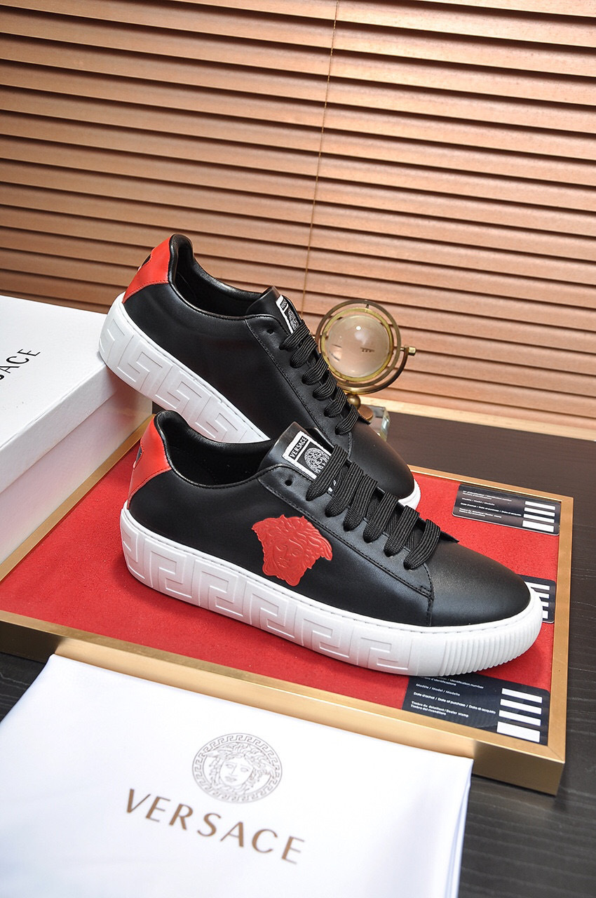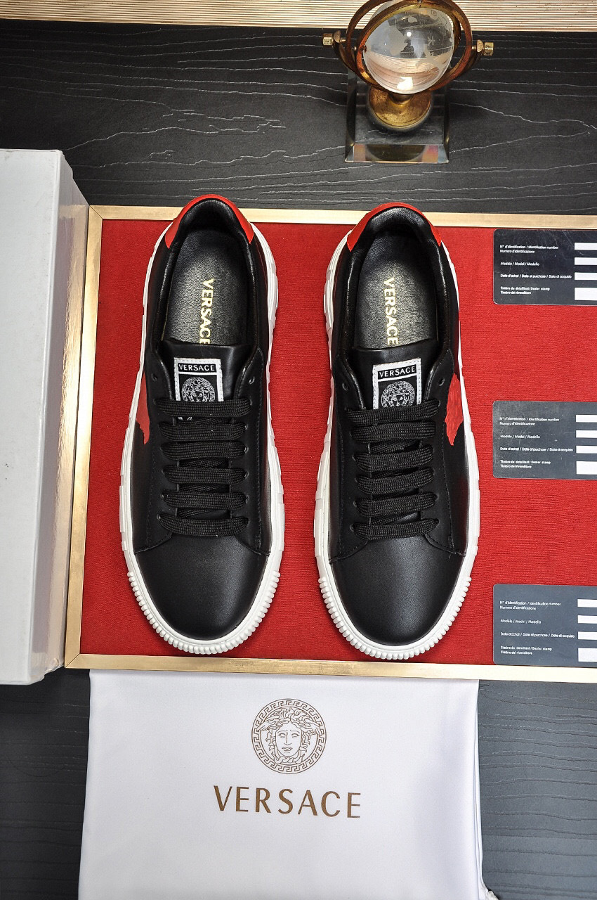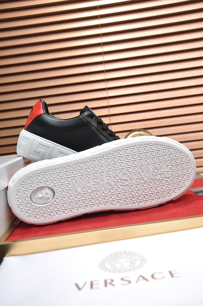 The sleek black exterior is complemented by a vibrant red accent and the iconic Versace logo, making them perfect for both casual outings and stylish events. The durable rubber sole ensures excellent grip and longevity.