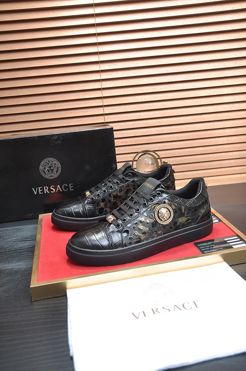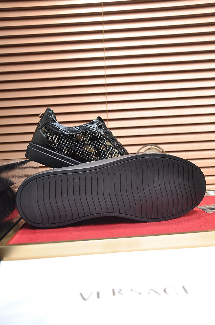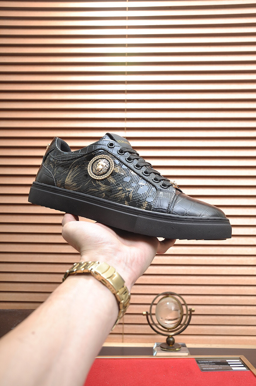 Step into luxury with the Versace Casual Sneakers, designed for both comfort and style. Crafted from high-quality materials, these sneakers feature a striking black design with intricate detailing, making them a perfect addition to any wardrobe.