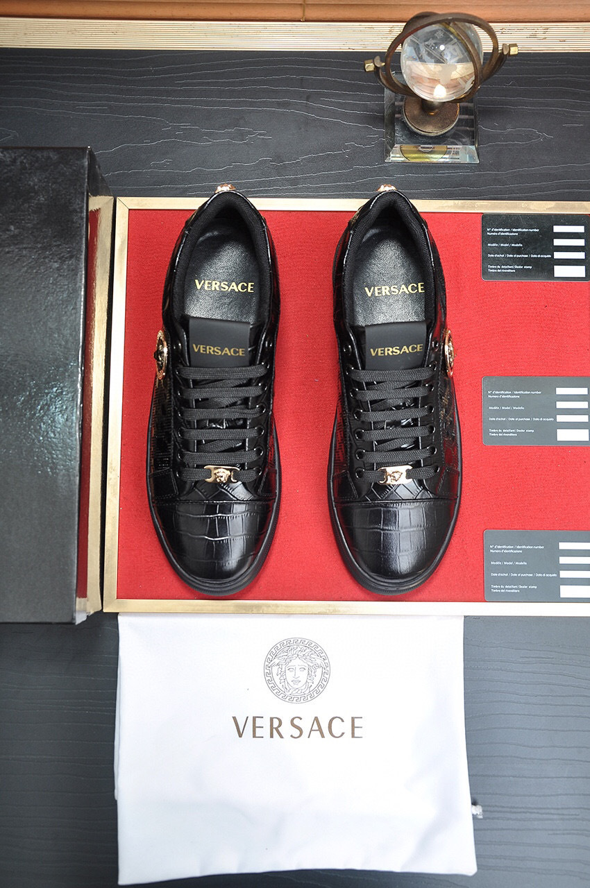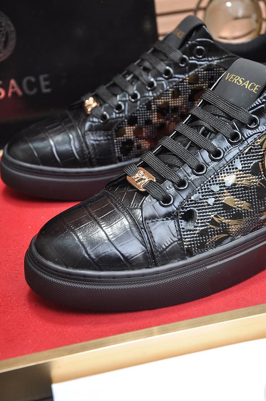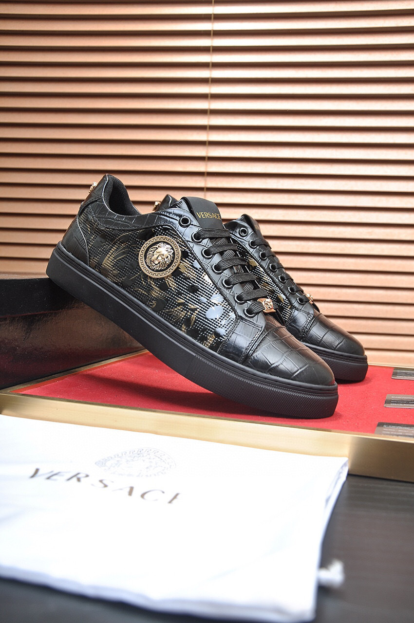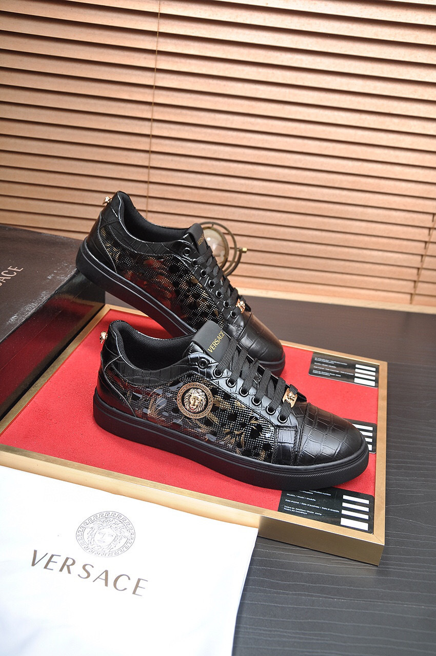 Step into luxury with the Versace Casual Sneakers, designed for both comfort and style. Crafted from high-quality materials, these sneakers feature a striking black design with intricate detailing, making them a perfect addition to any wardrobe.