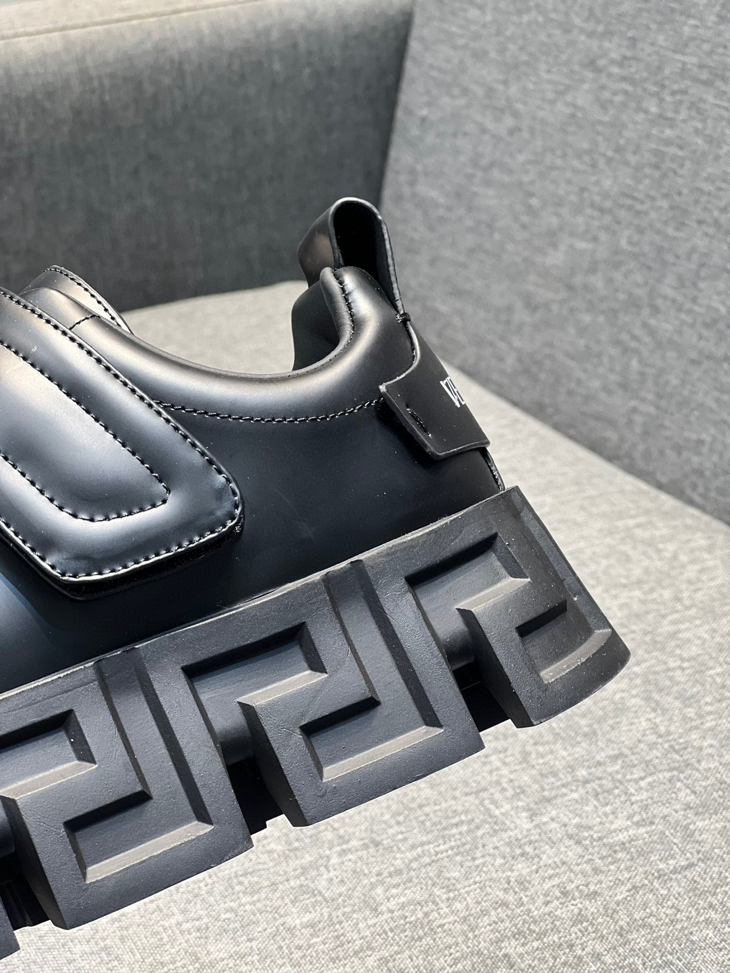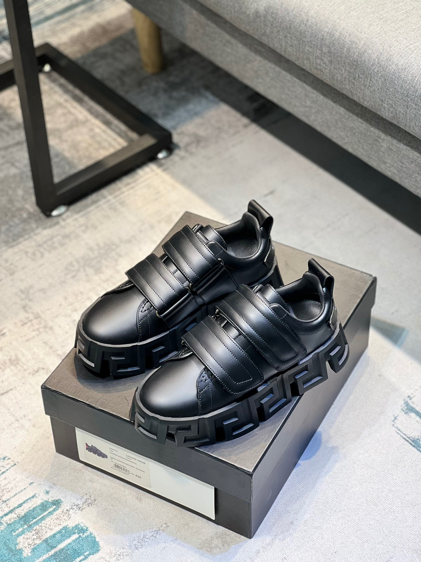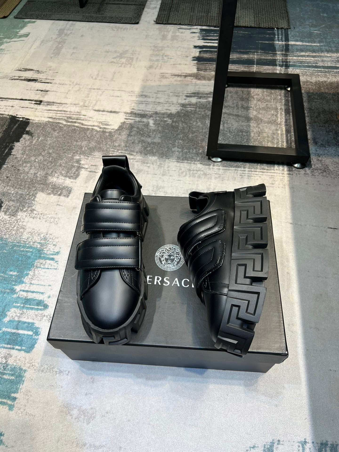 Step out in style with these Versace unisex sneakers, designed for both comfort and fashion. Featuring a sleek black exterior, these shoes are perfect for any casual or semi-formal occasion.
